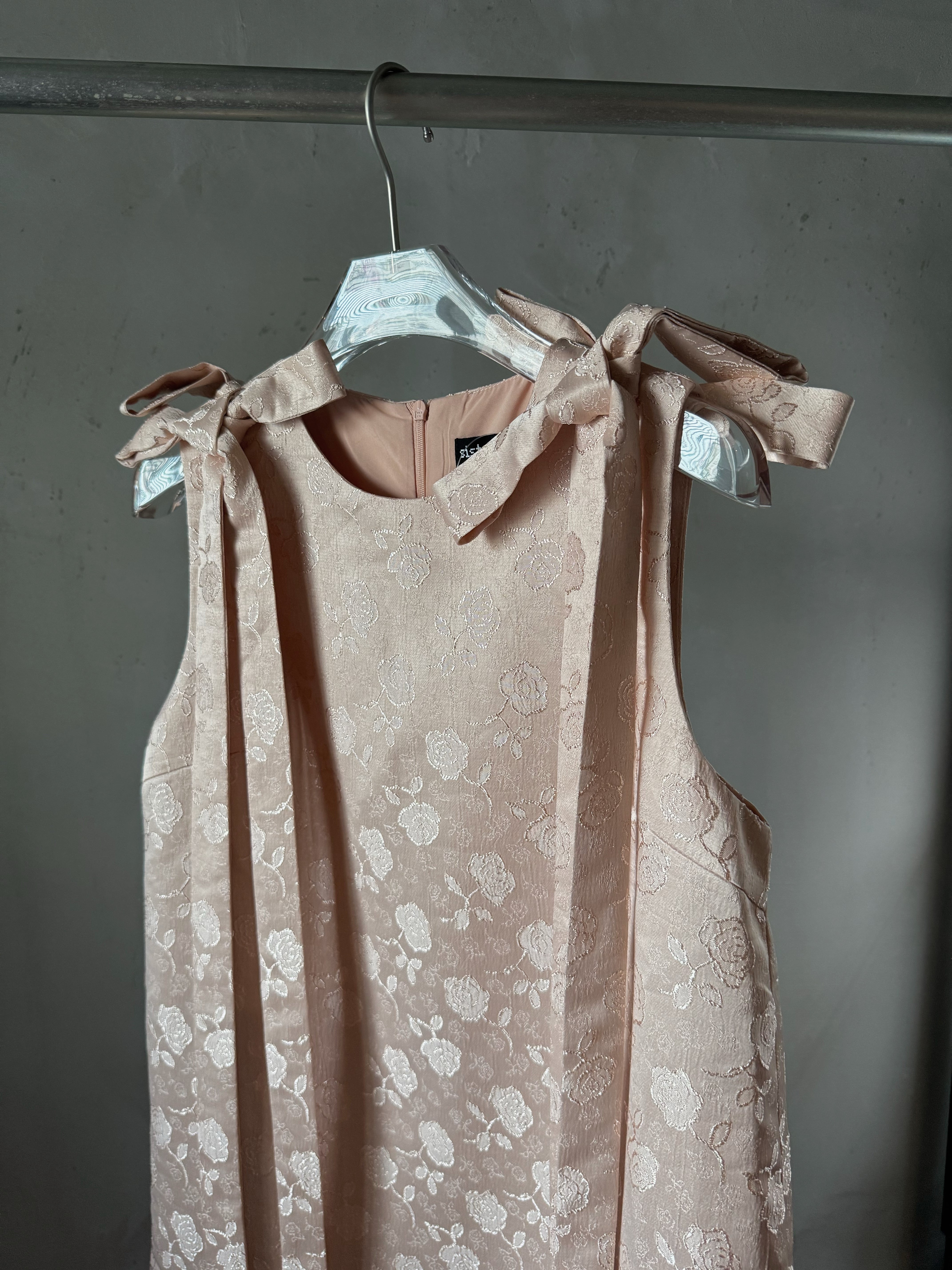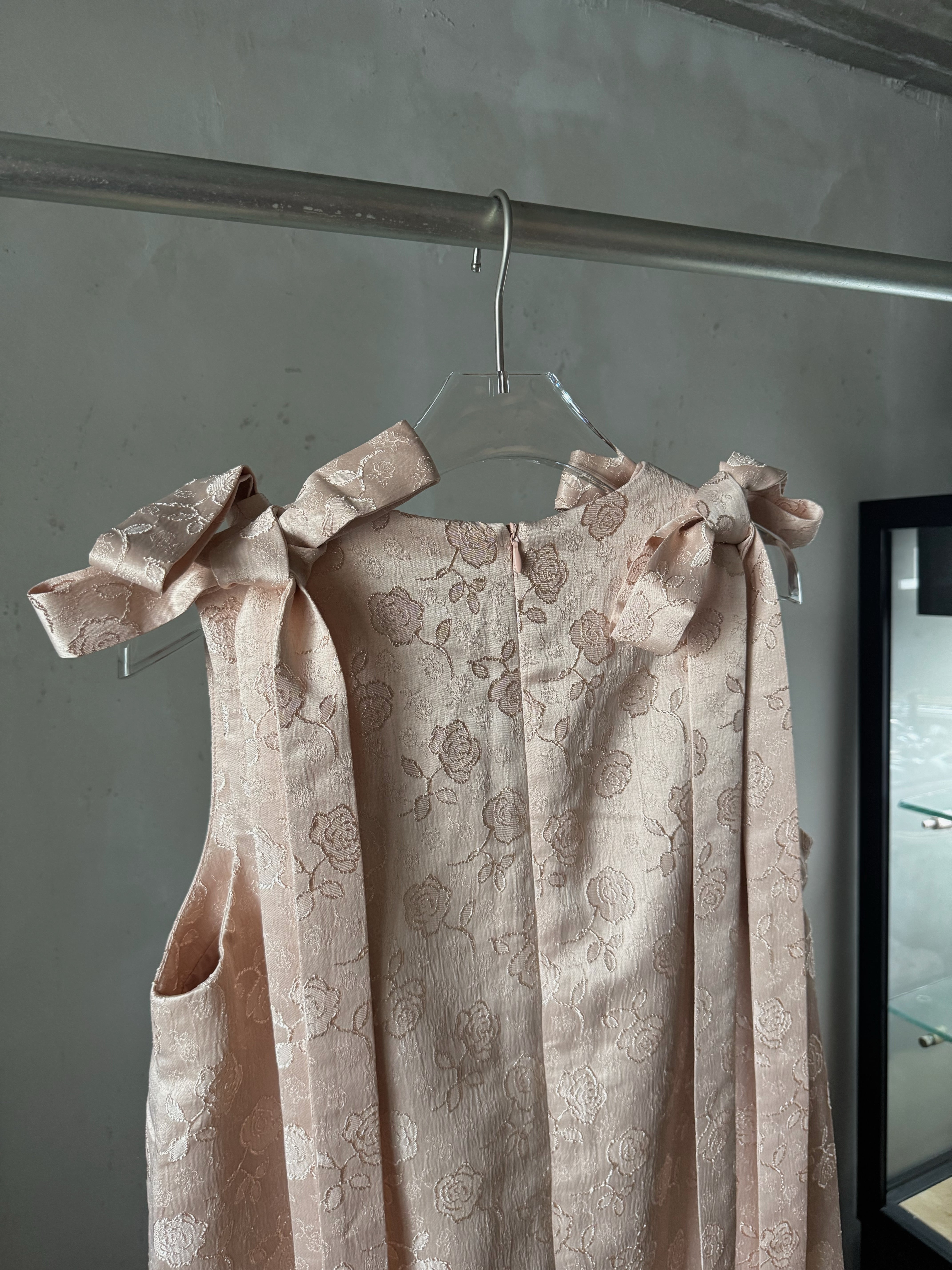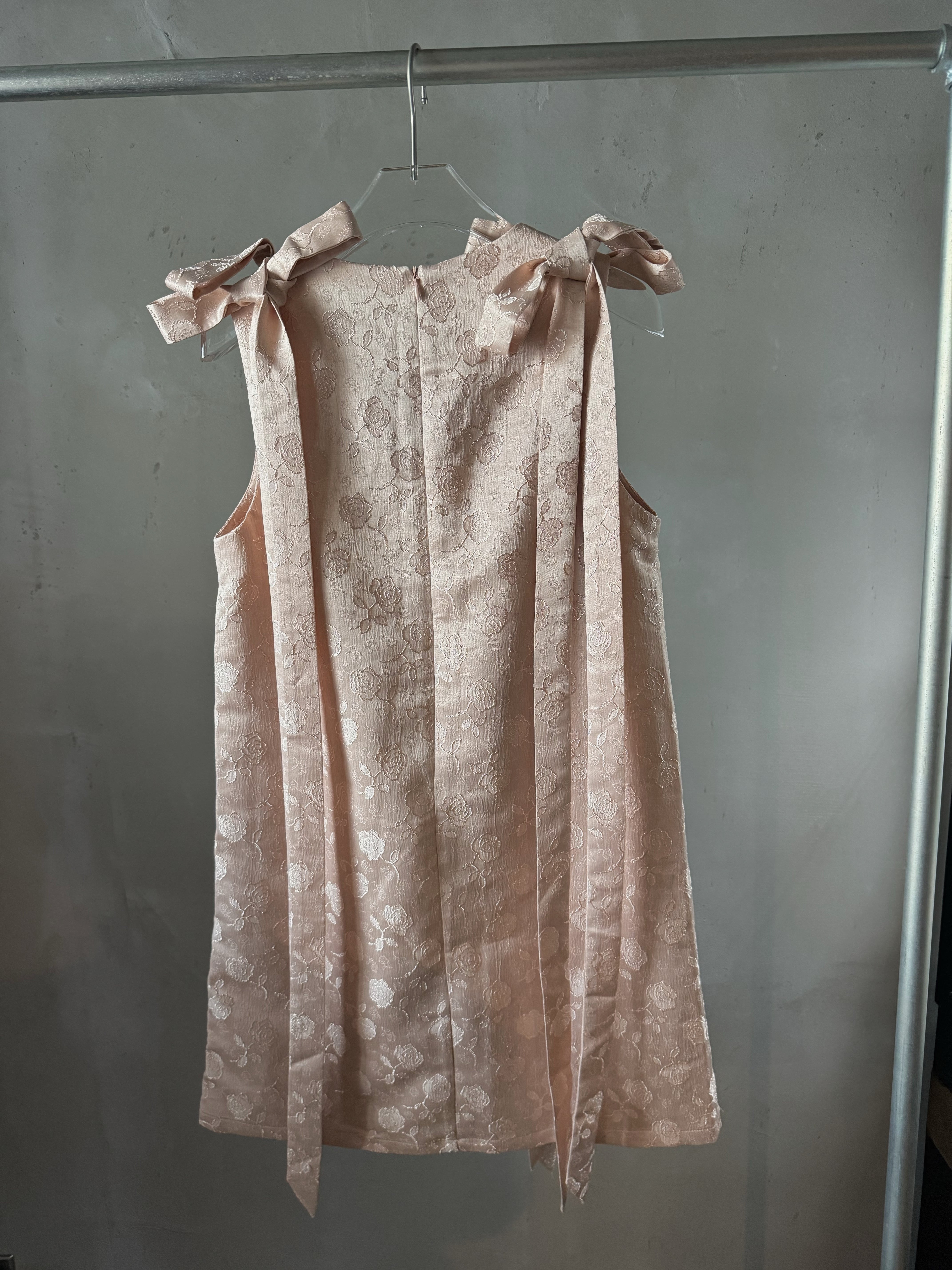 光沢のあるベビーピンクにローズの刺繍がとっても可愛い生地と前後の肩リボンがスペシャルなワンピースです♪