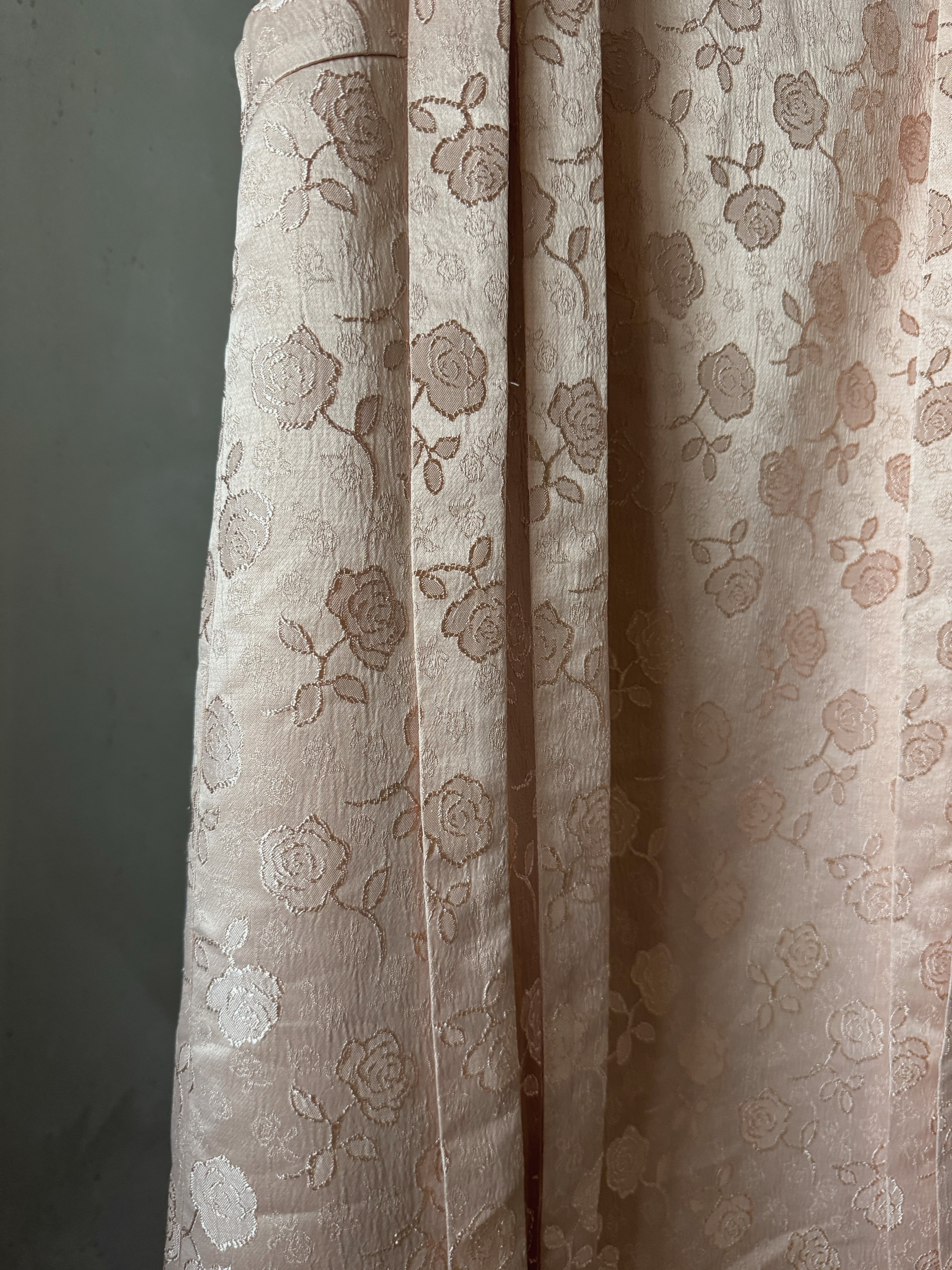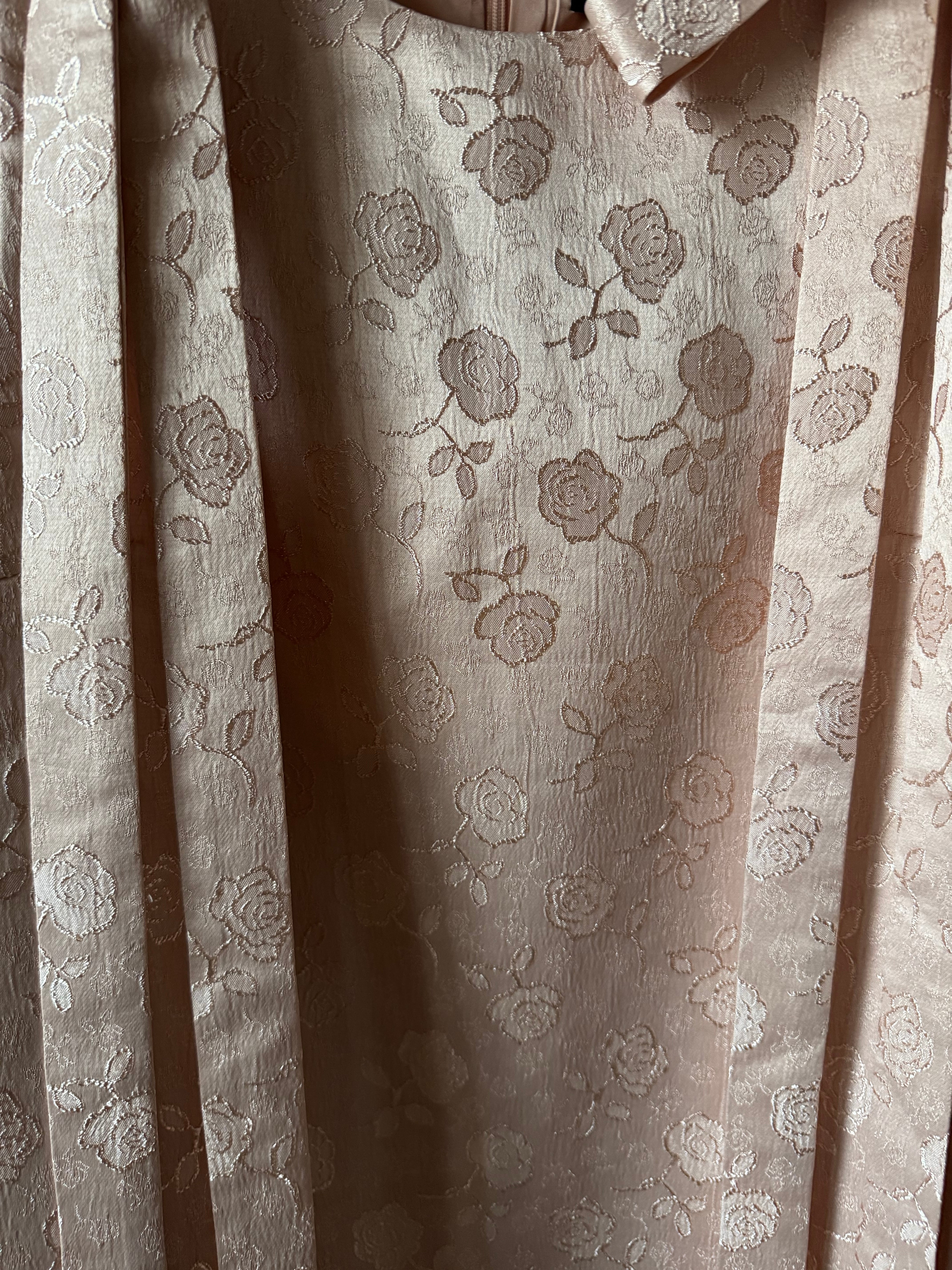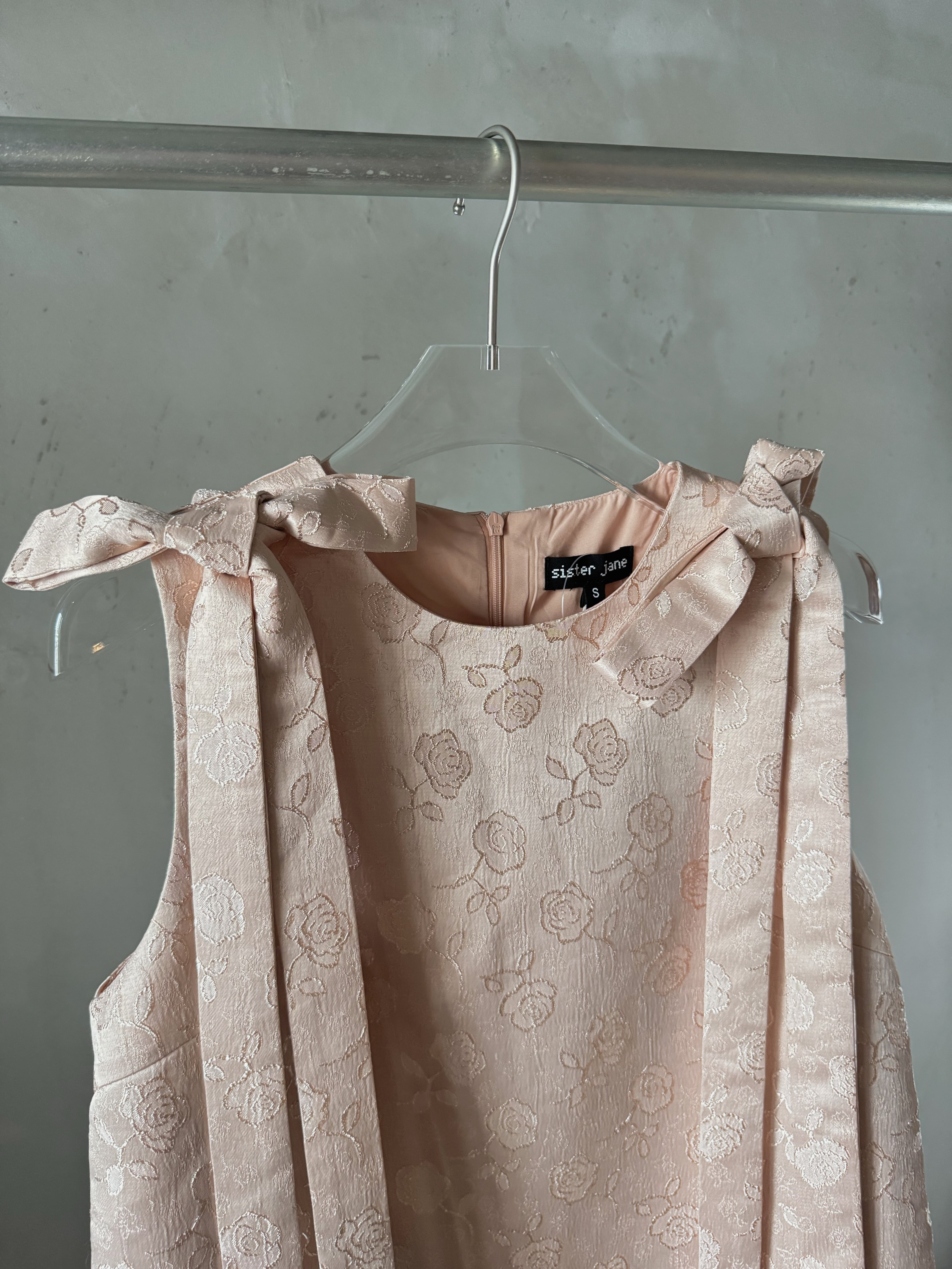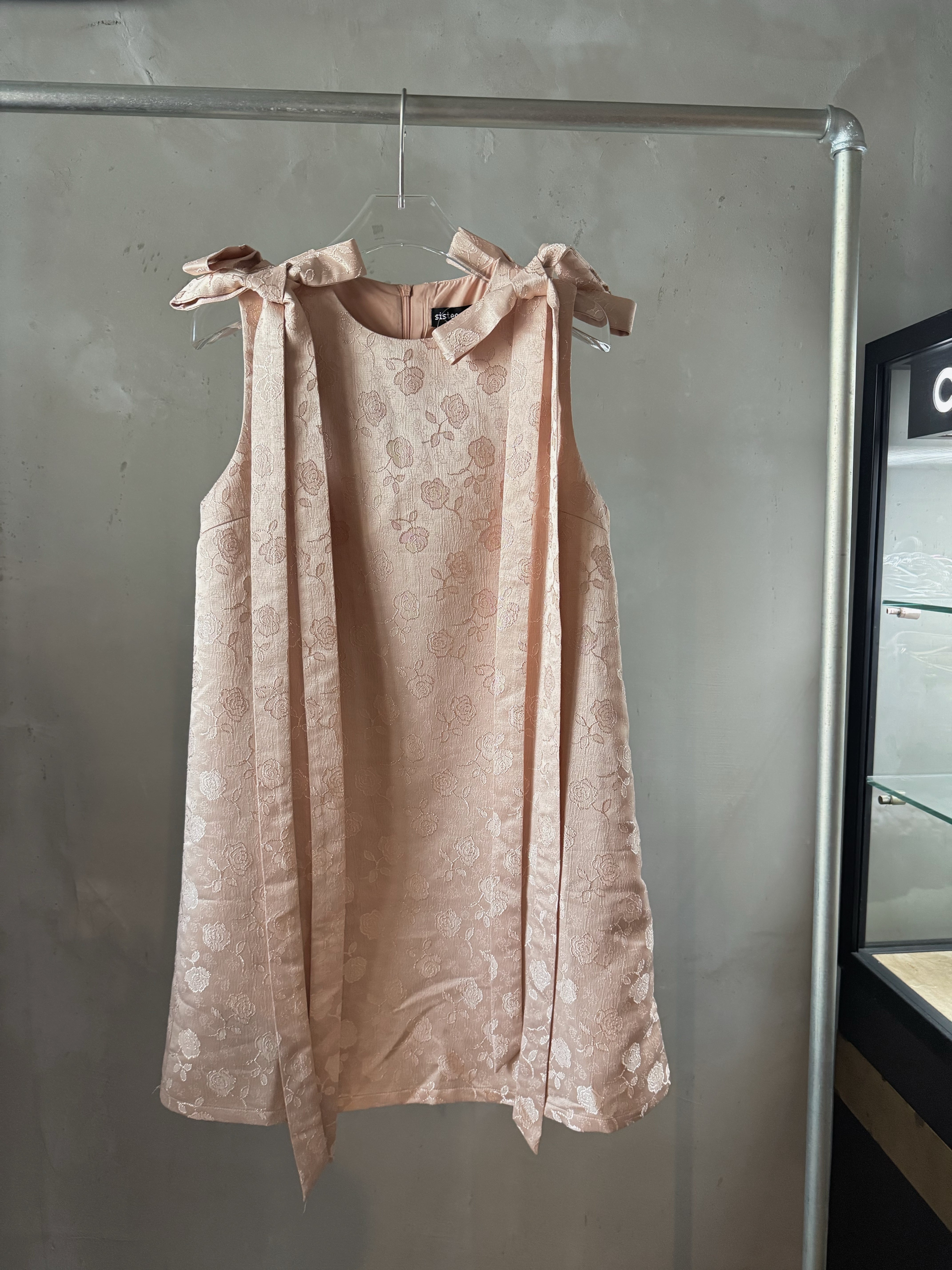 光沢のあるベビーピンクにローズの刺繍がとっても可愛い生地と前後の肩リボンがスペシャルなワンピースです♪