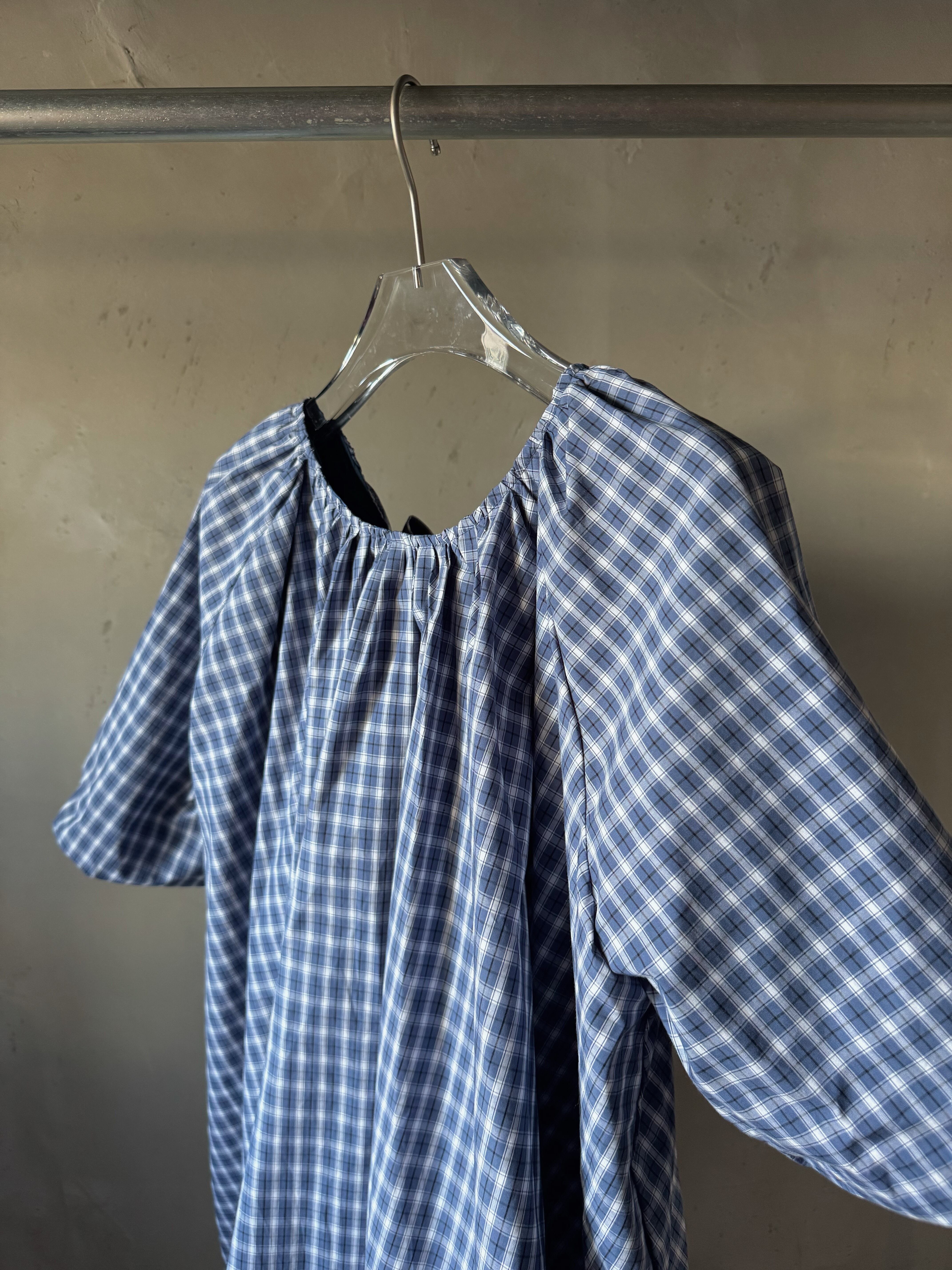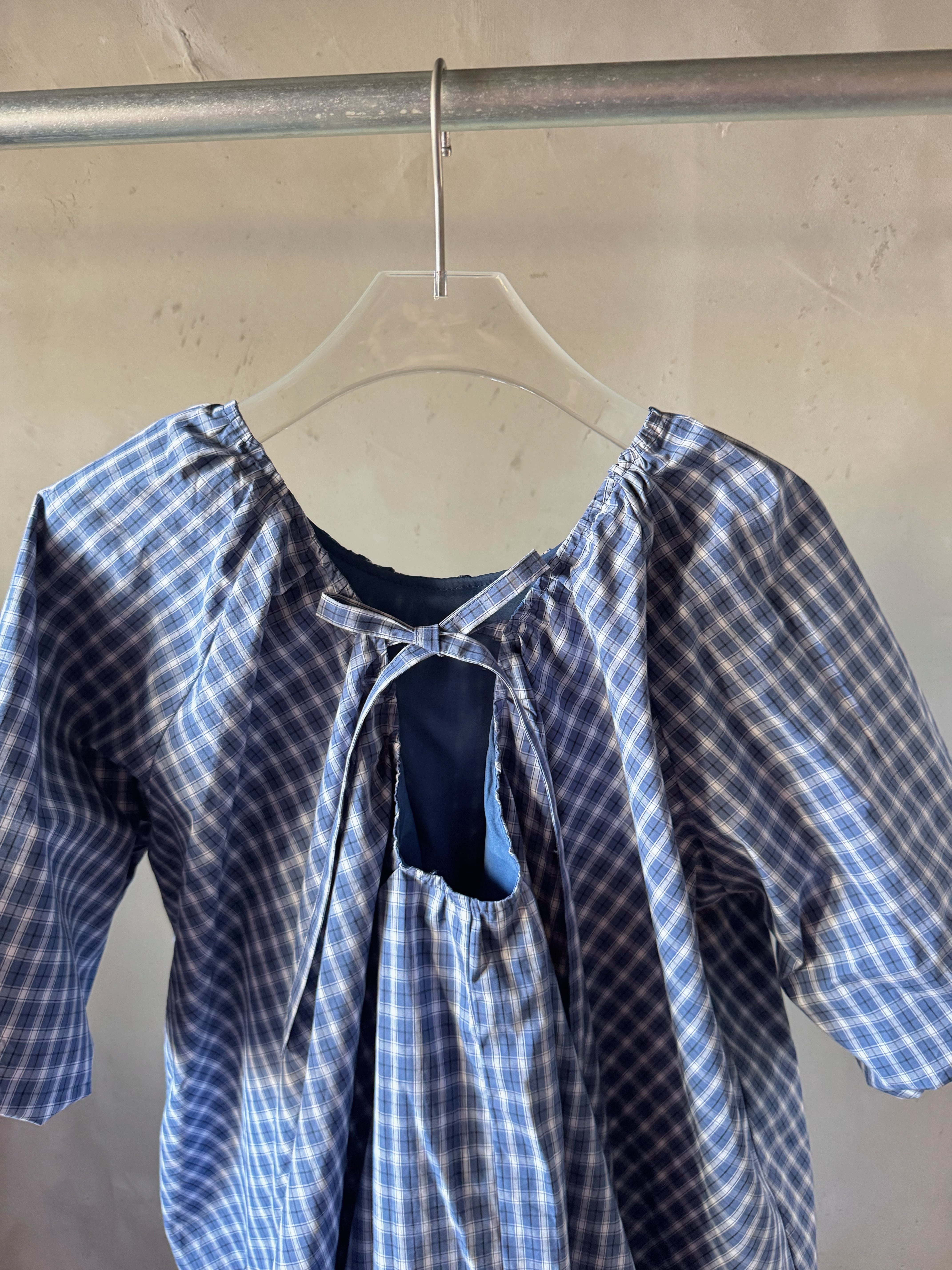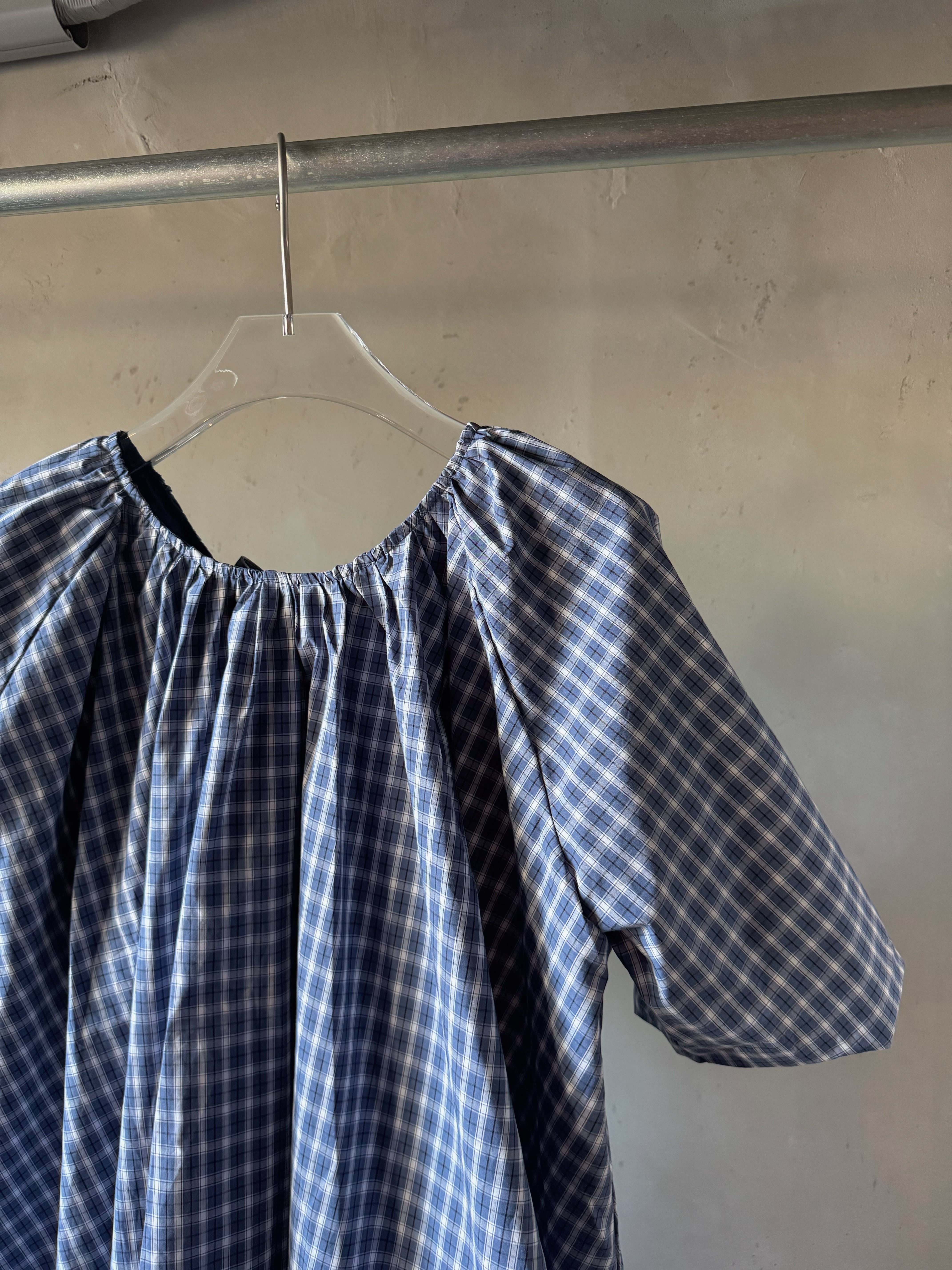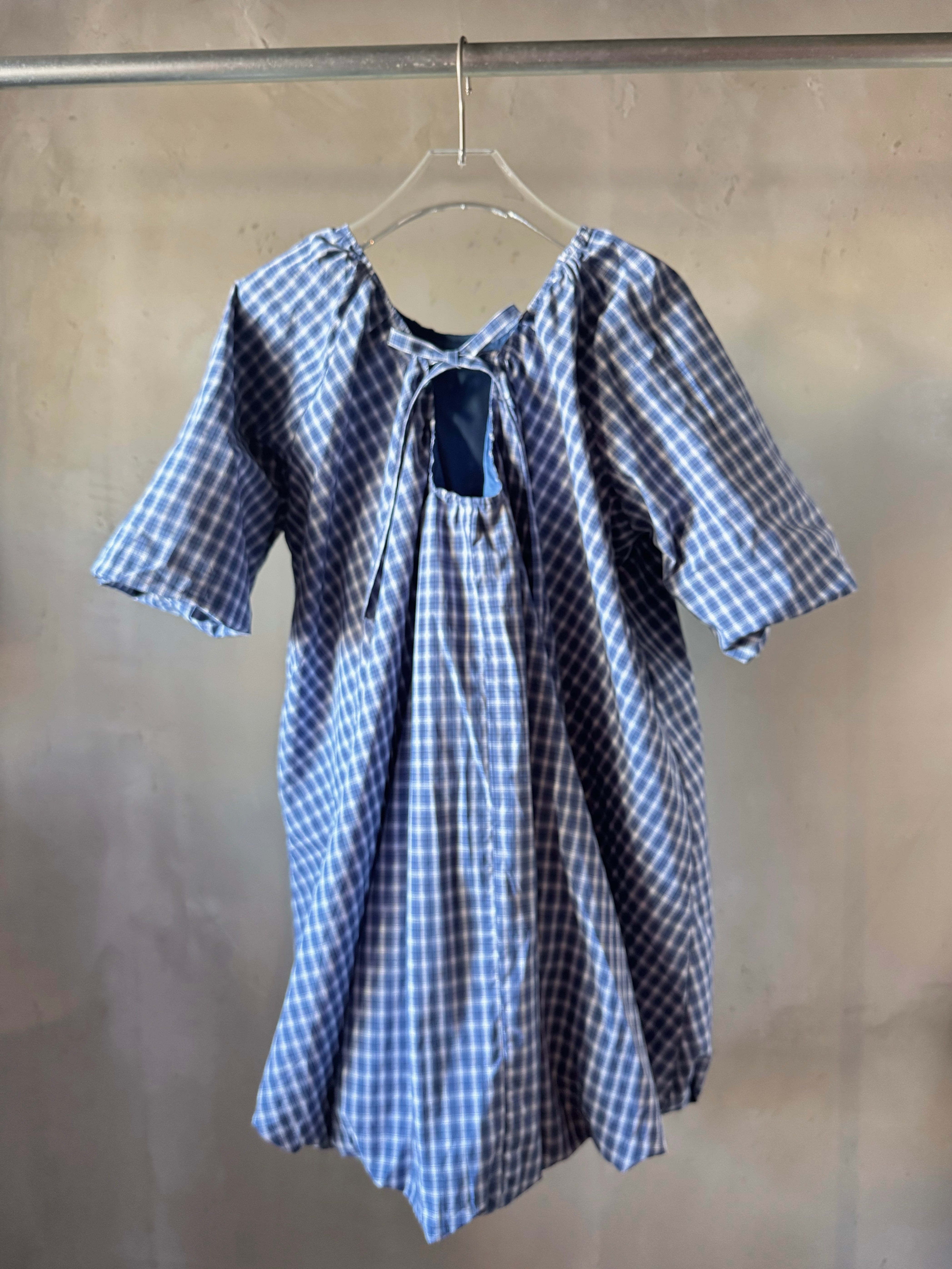 コットンのチェック柄生地のミニドレス。バブルへム仕上げのオーバーサイズフィット。ギャザー加工されたスクープバックネックラインとタイ留めが特徴です。ドレスの長さは、サイズに応じて86~90センチメートル
