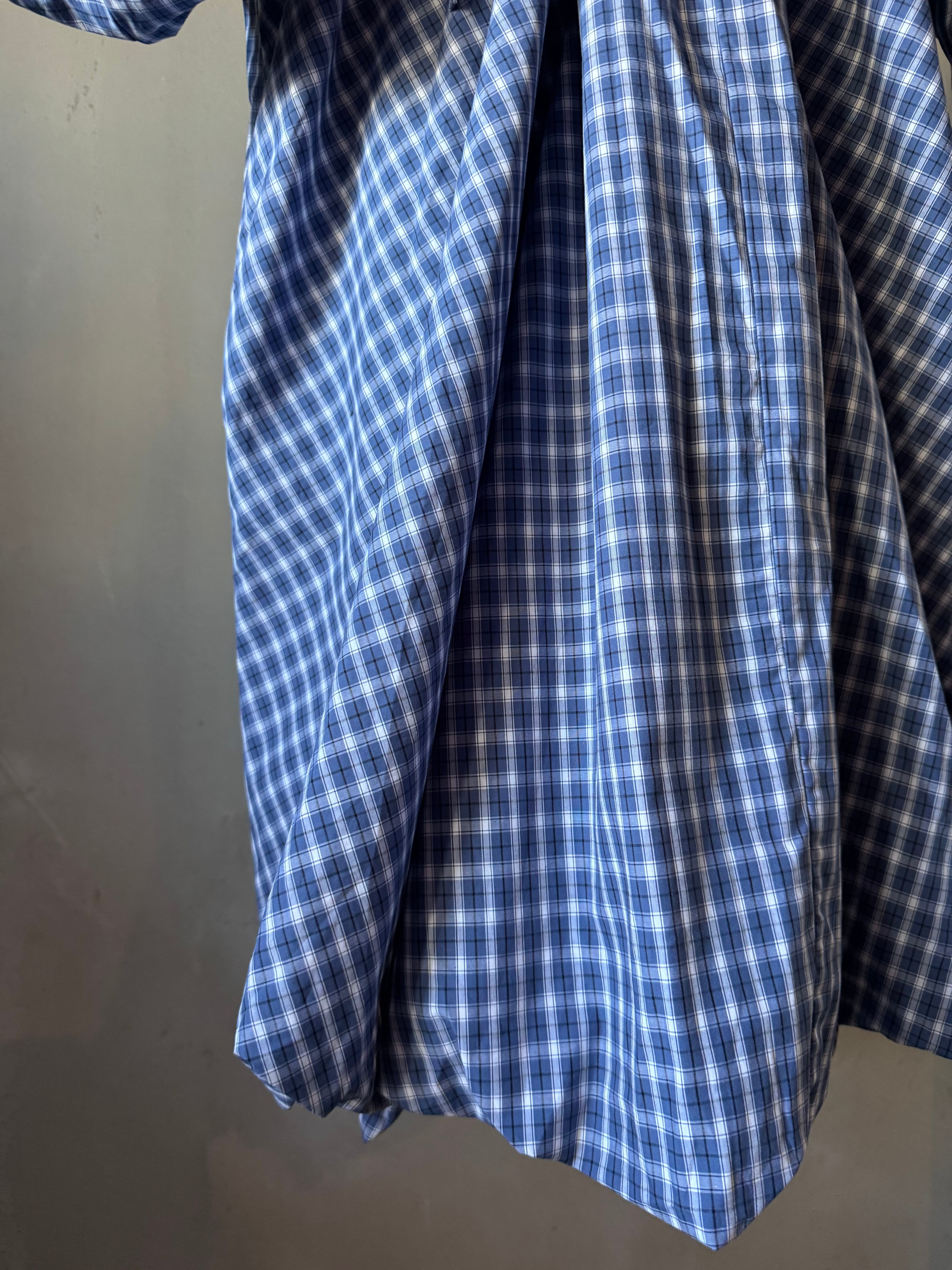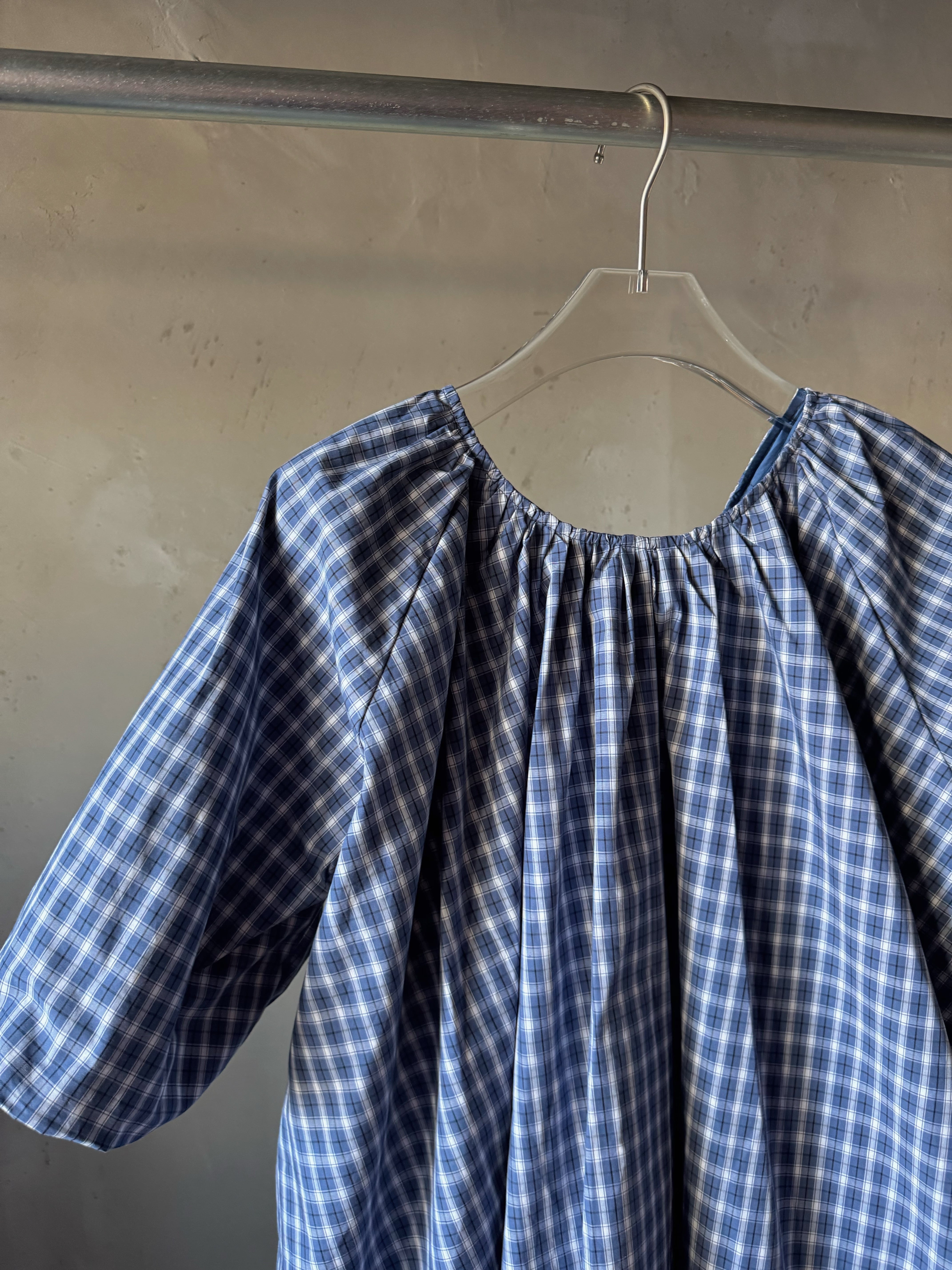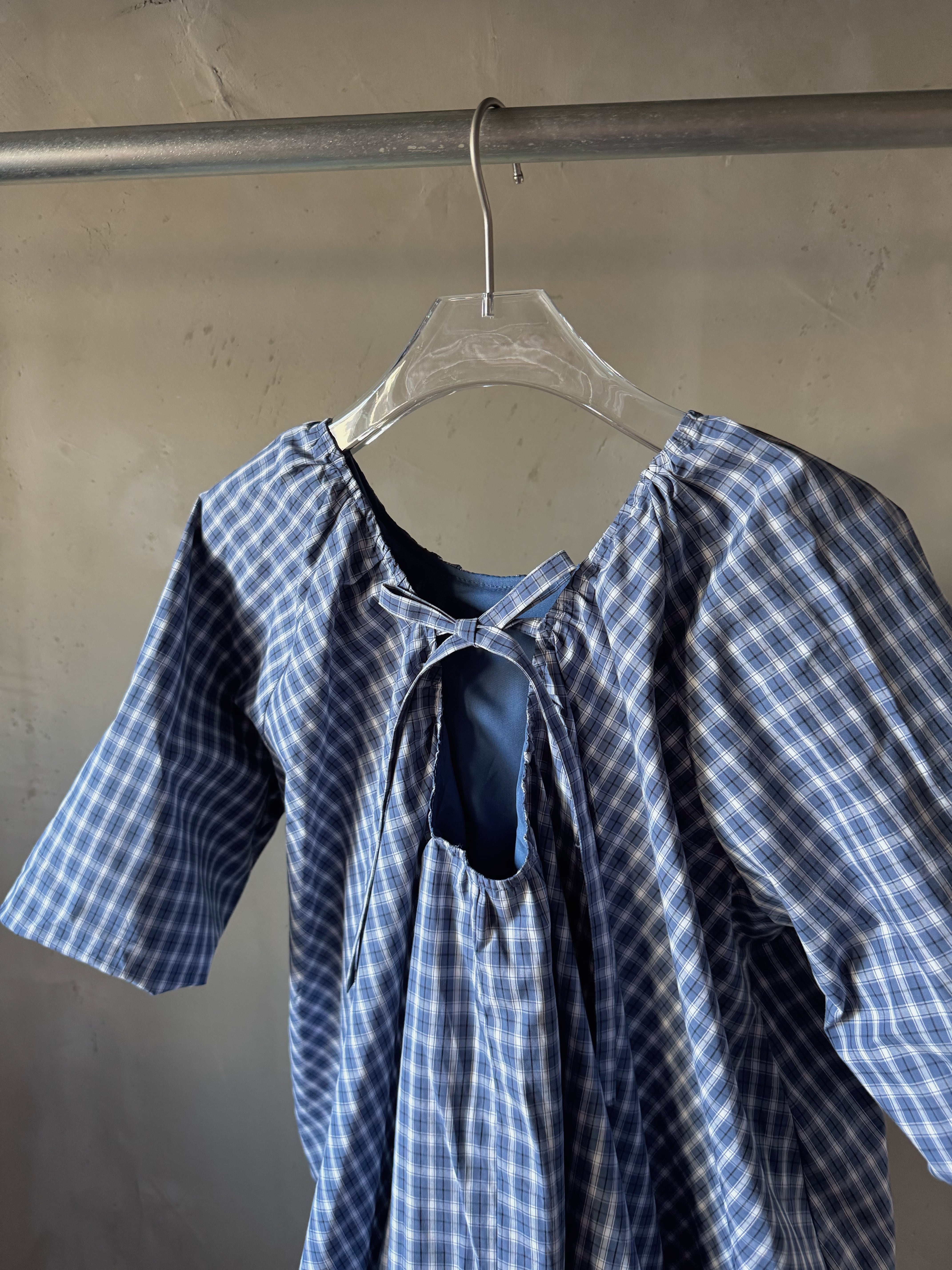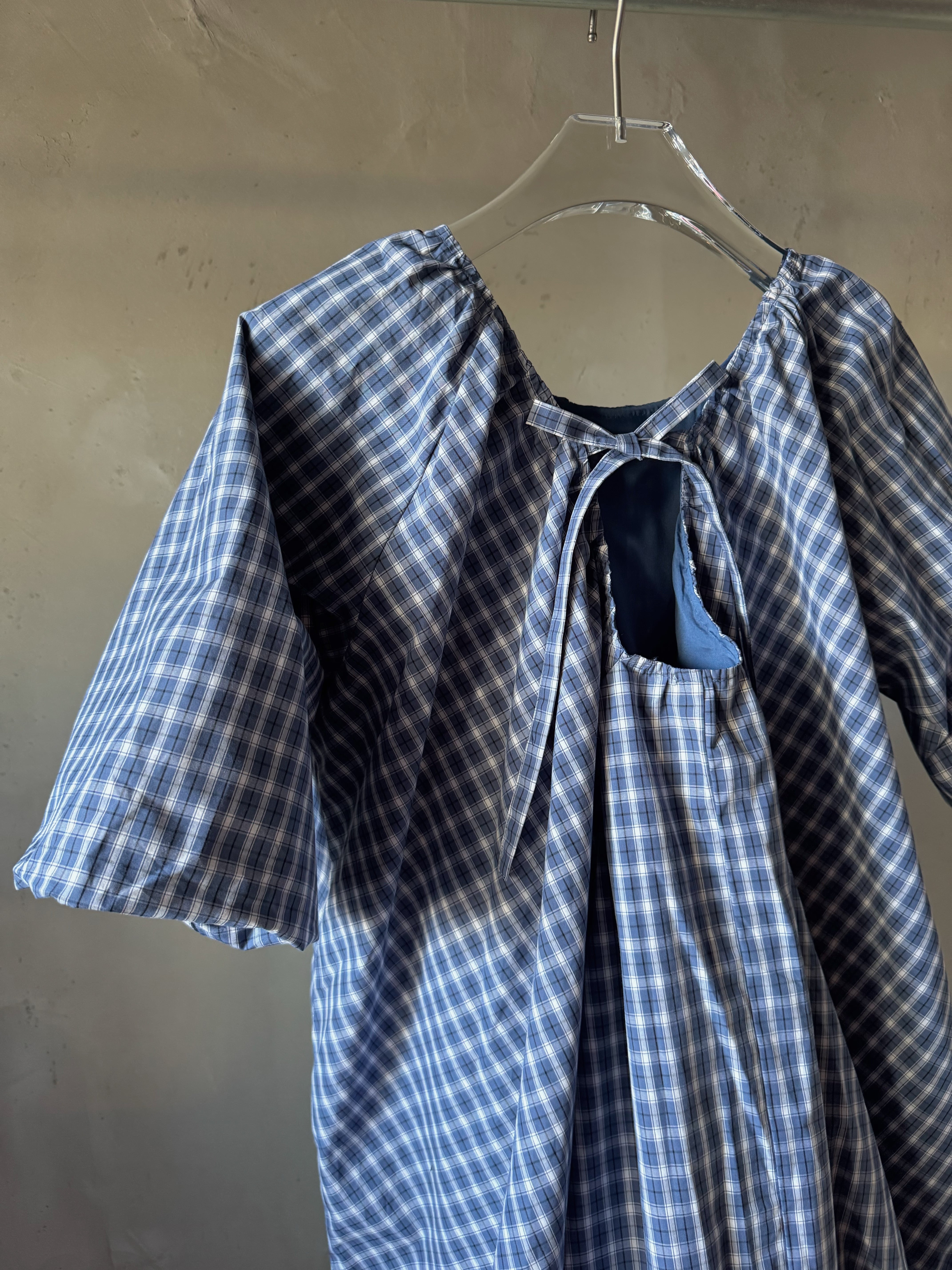 コットンのチェック柄生地のミニドレス。バブルへム仕上げのオーバーサイズフィット。ギャザー加工されたスクープバックネックラインとタイ留めが特徴です。ドレスの長さは、サイズに応じて86~90センチメートル