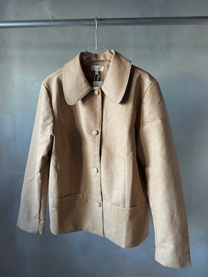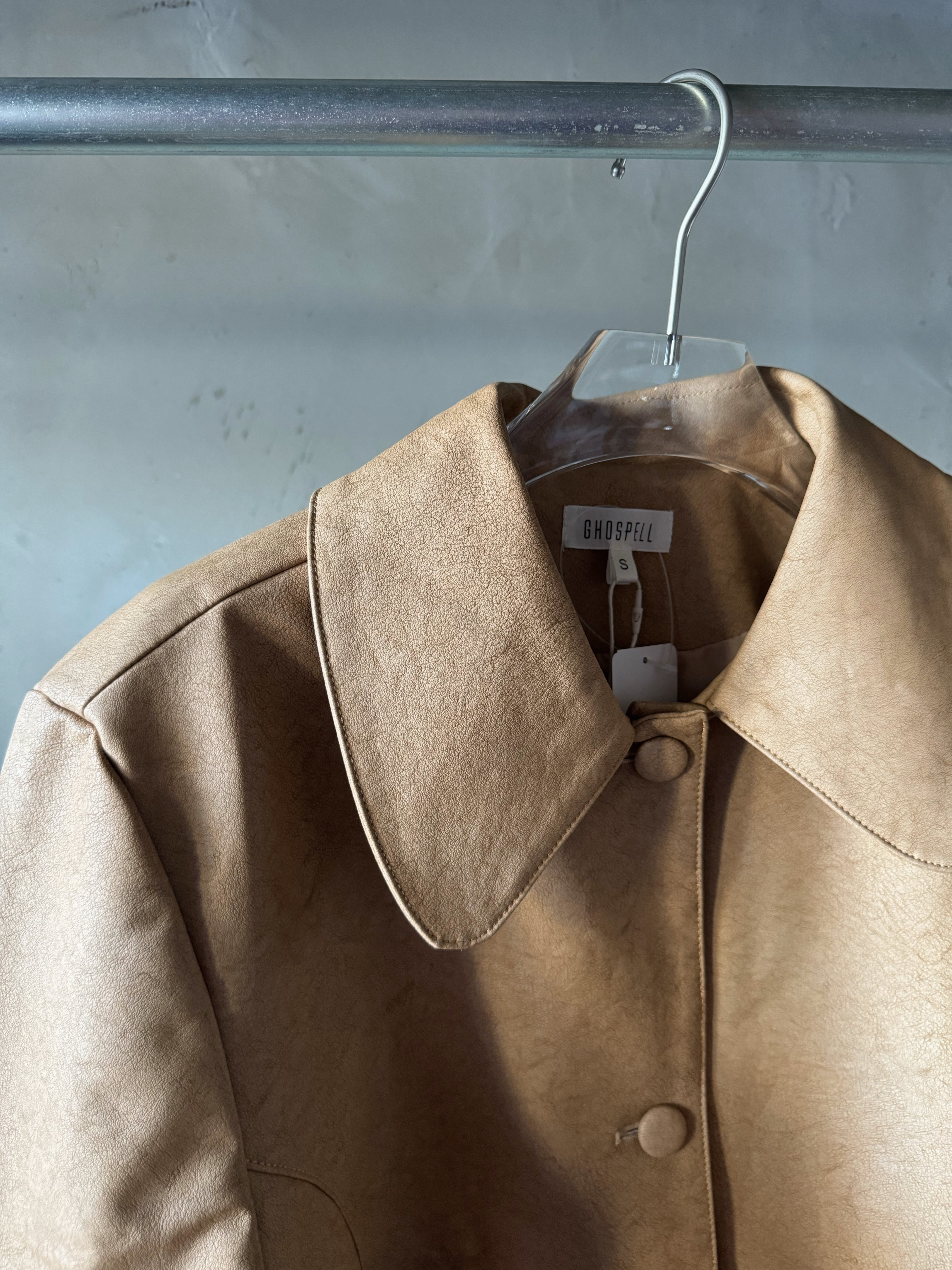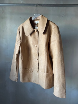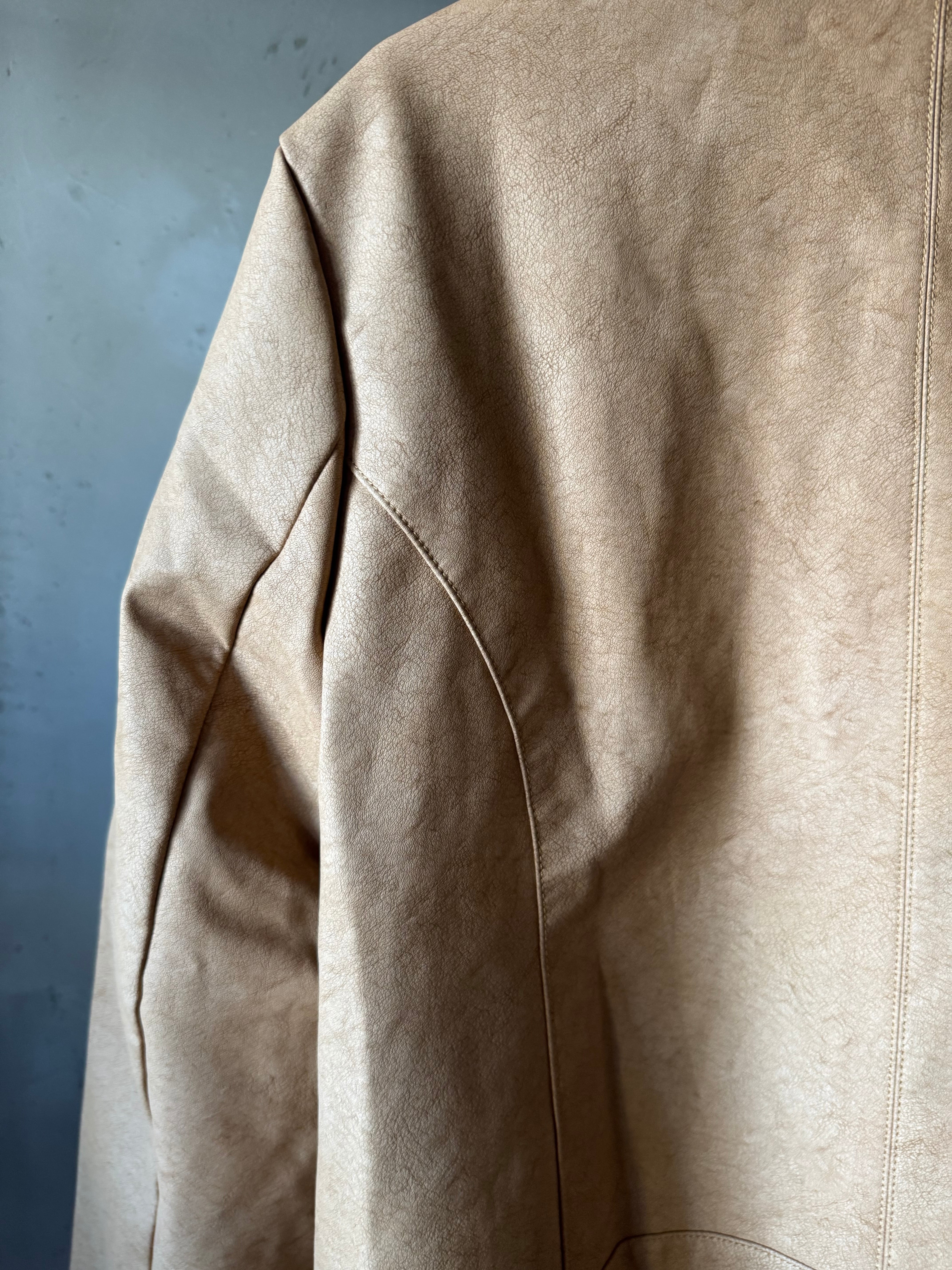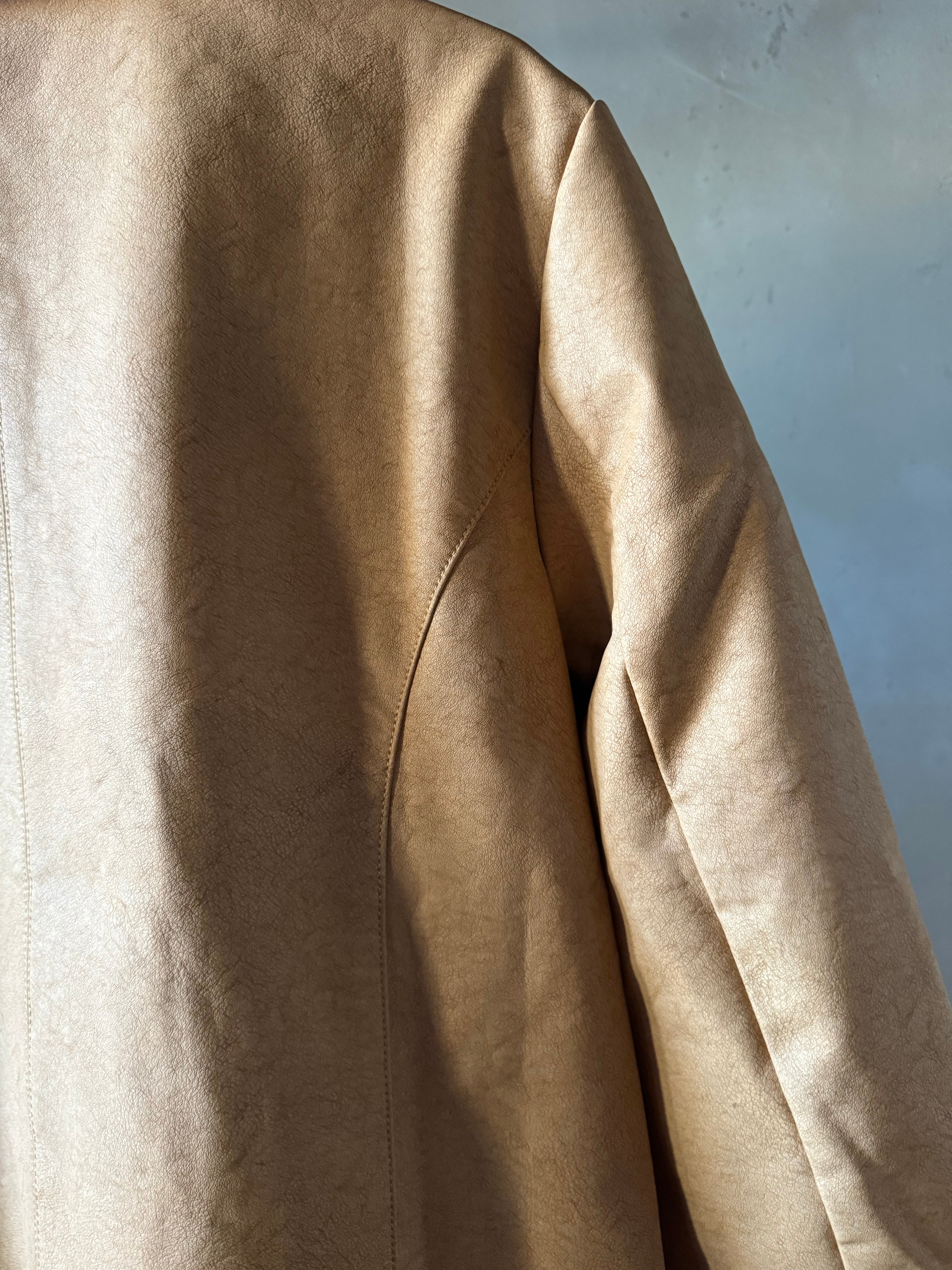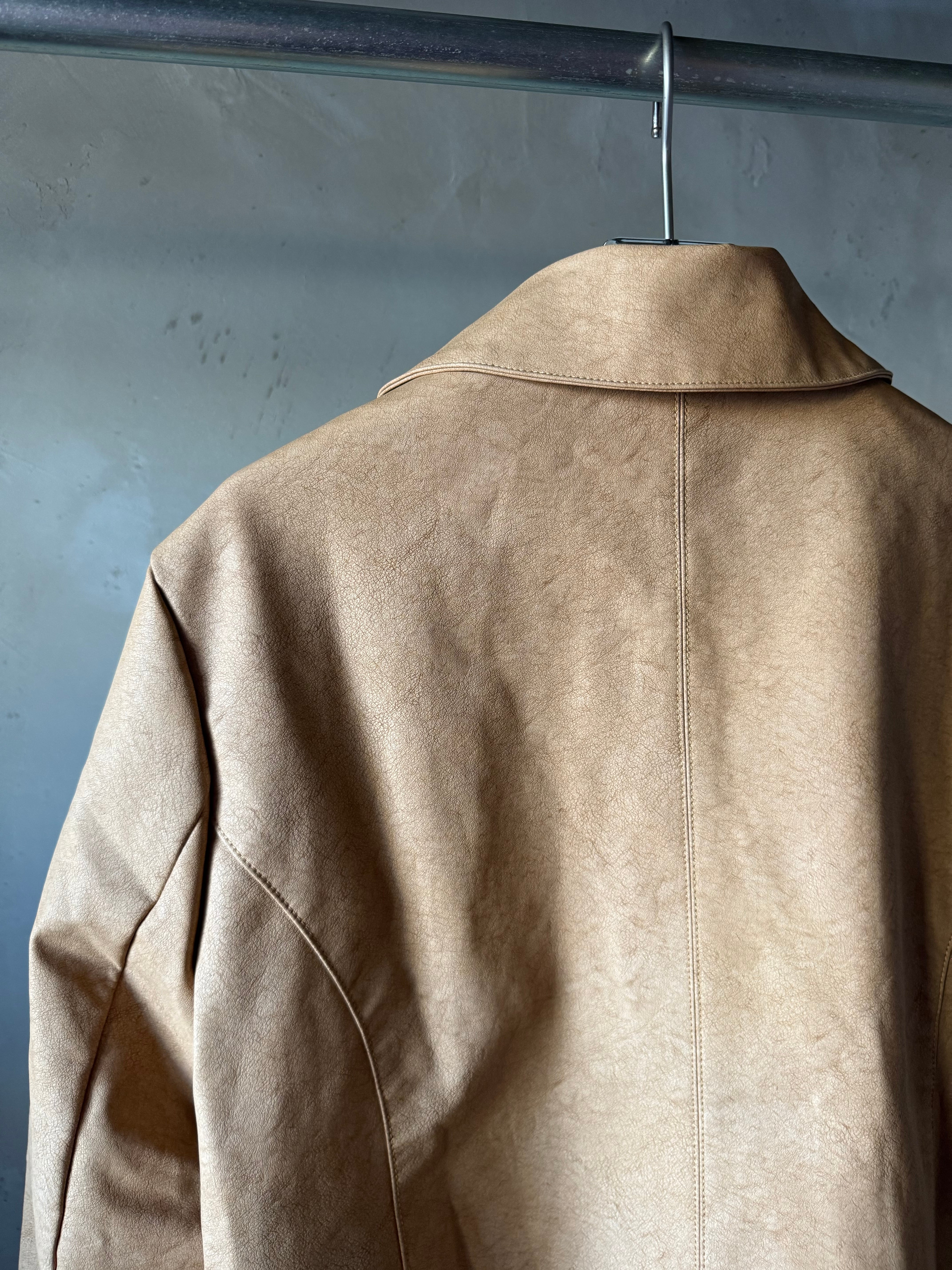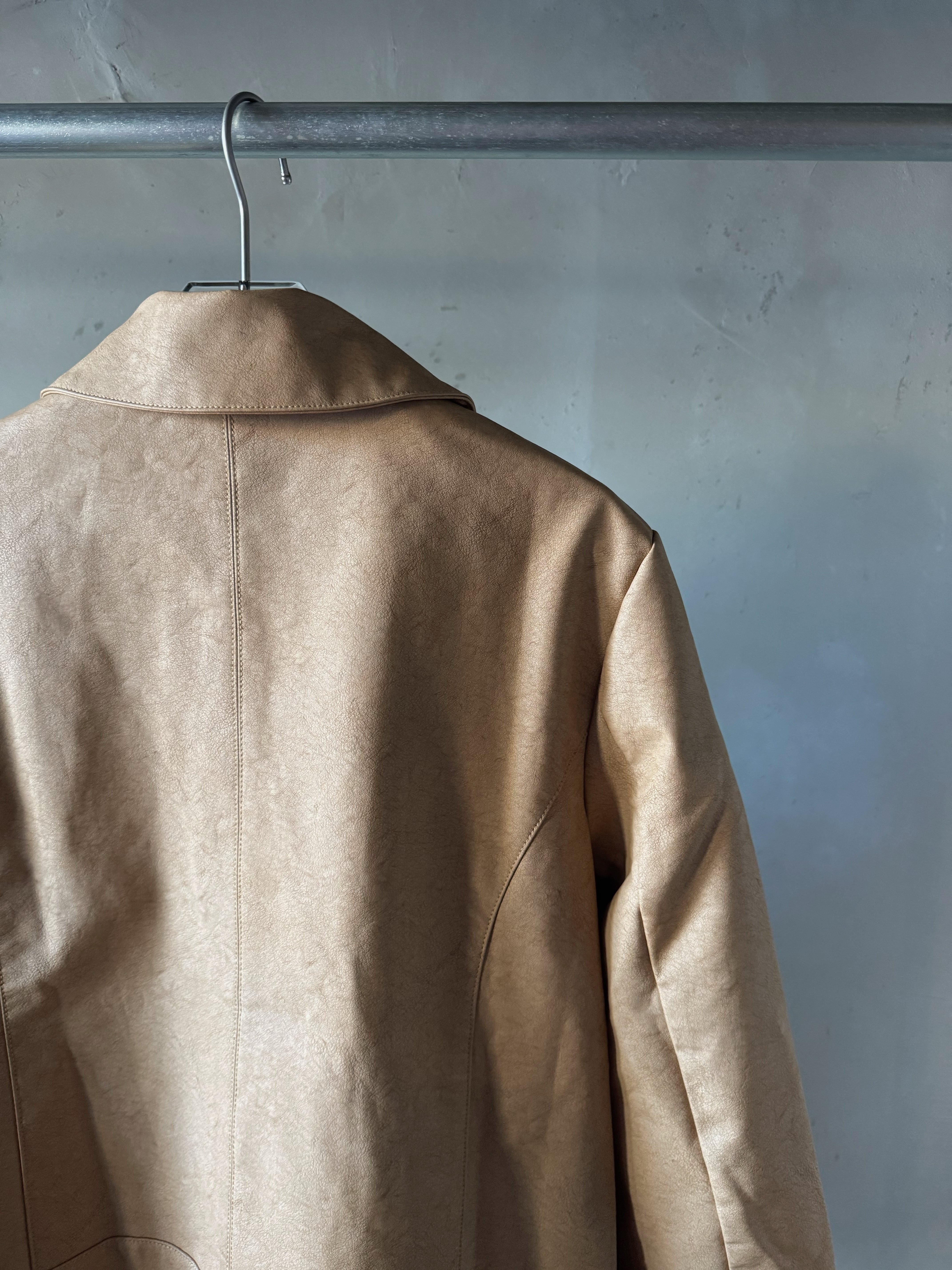 フェイクレザー生地のレギュラーフィットジャケット。ヴィンテージスタイルで、プリンセスシームと下部ウェルトポケットが特徴です。サイドシームポケットが追加で詳細に配置されています。カバーボタンで留められた、完全に裏地付きのスタイルです。