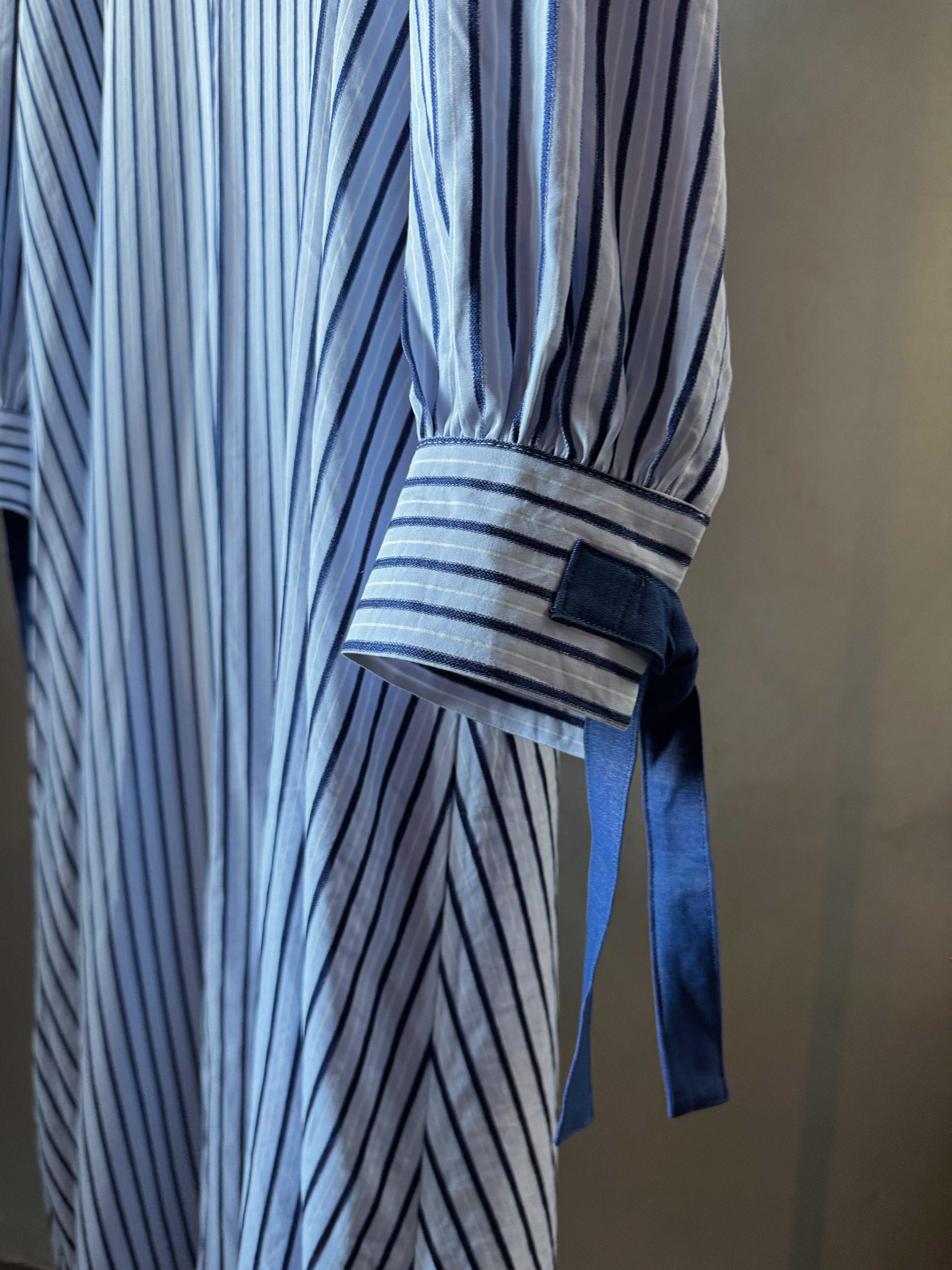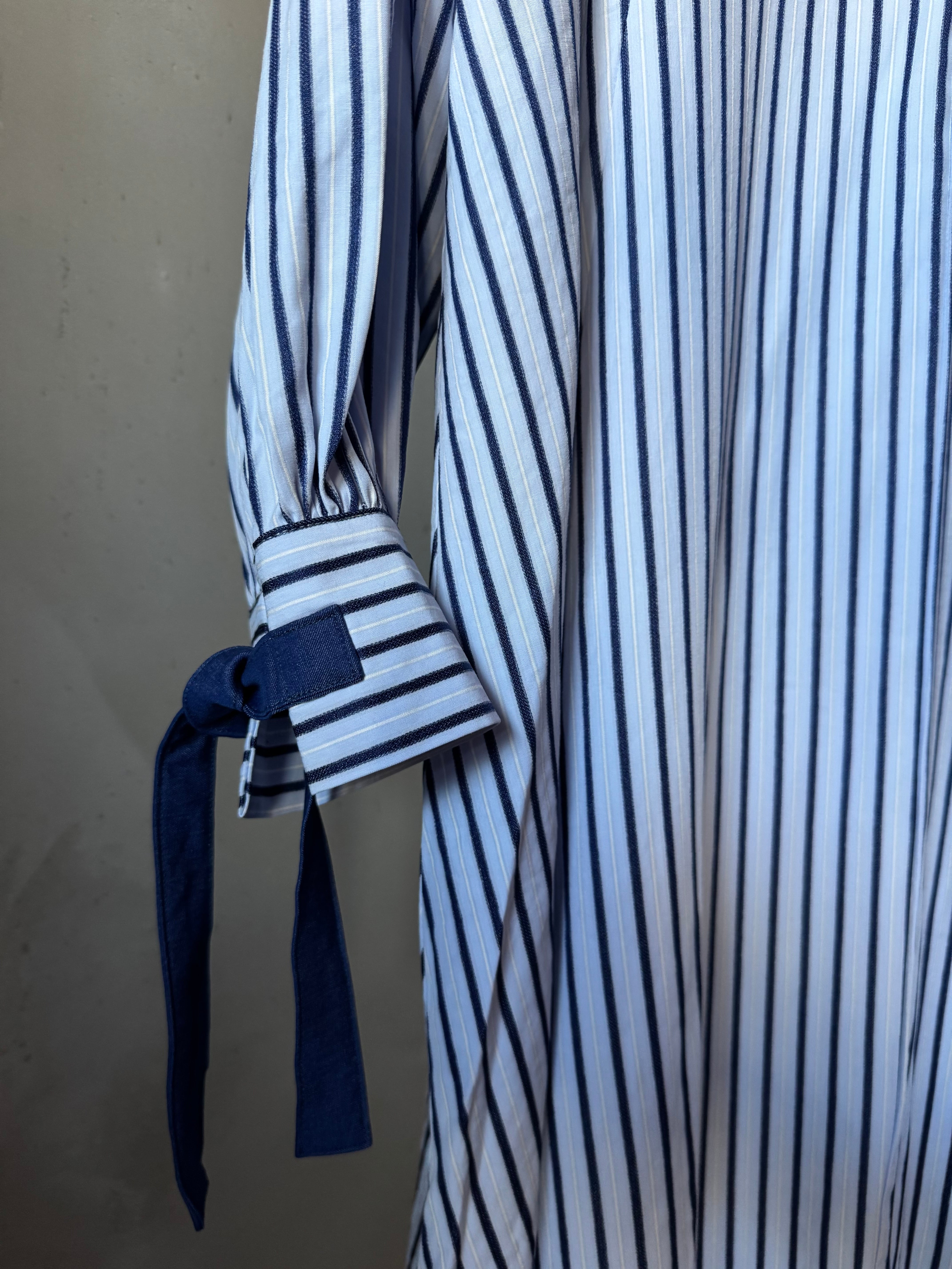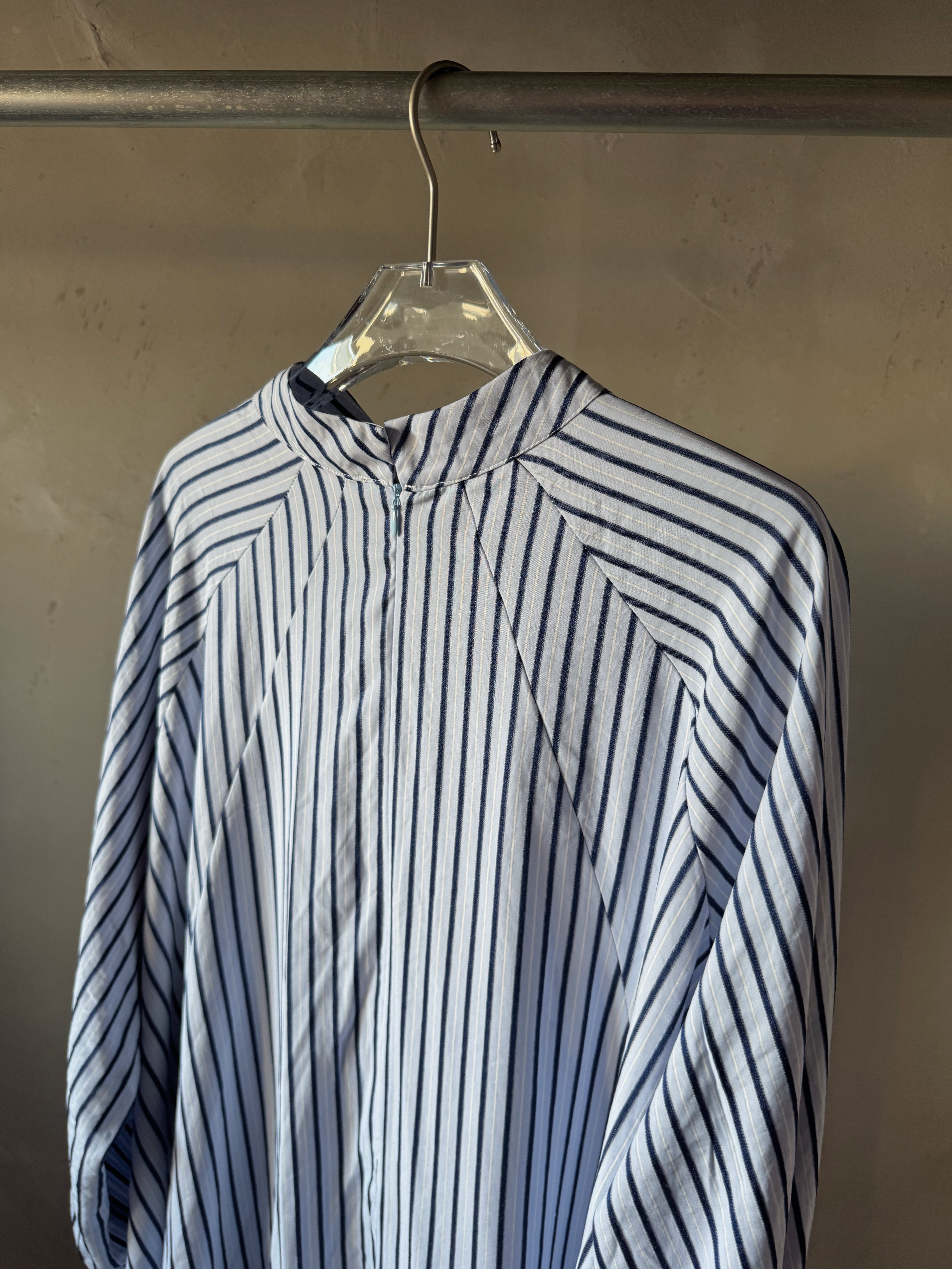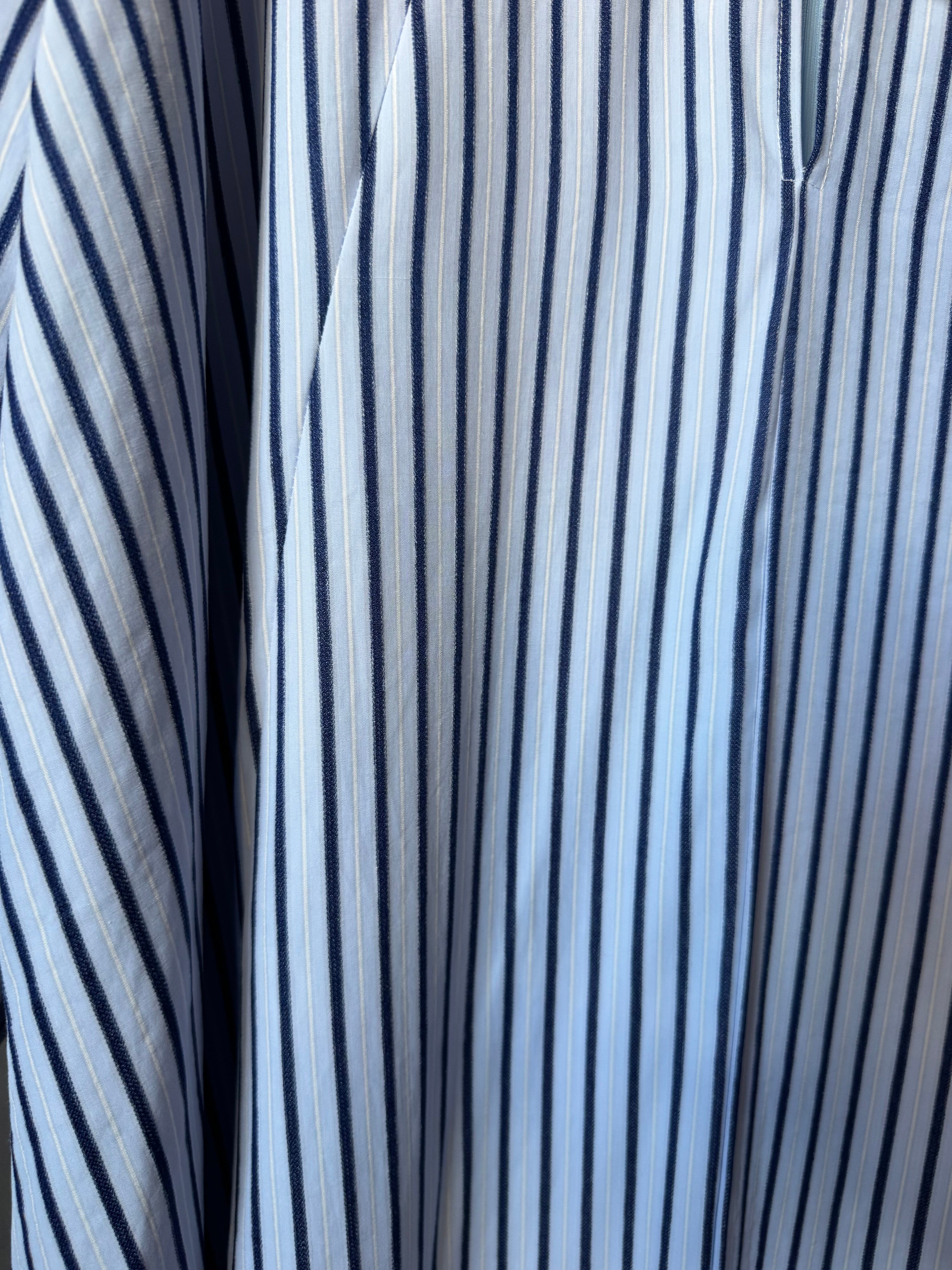 ストライプの織物で作られたオーバーサイズのミディドレス。パネルデザインで、ラグランスリーブを特徴とし、前面開口部にコントラストのあるタイで留められています。追加の背面ジッパーで仕上げました。ドレスの長さは、サイズに応じて126~130センチメートルです。