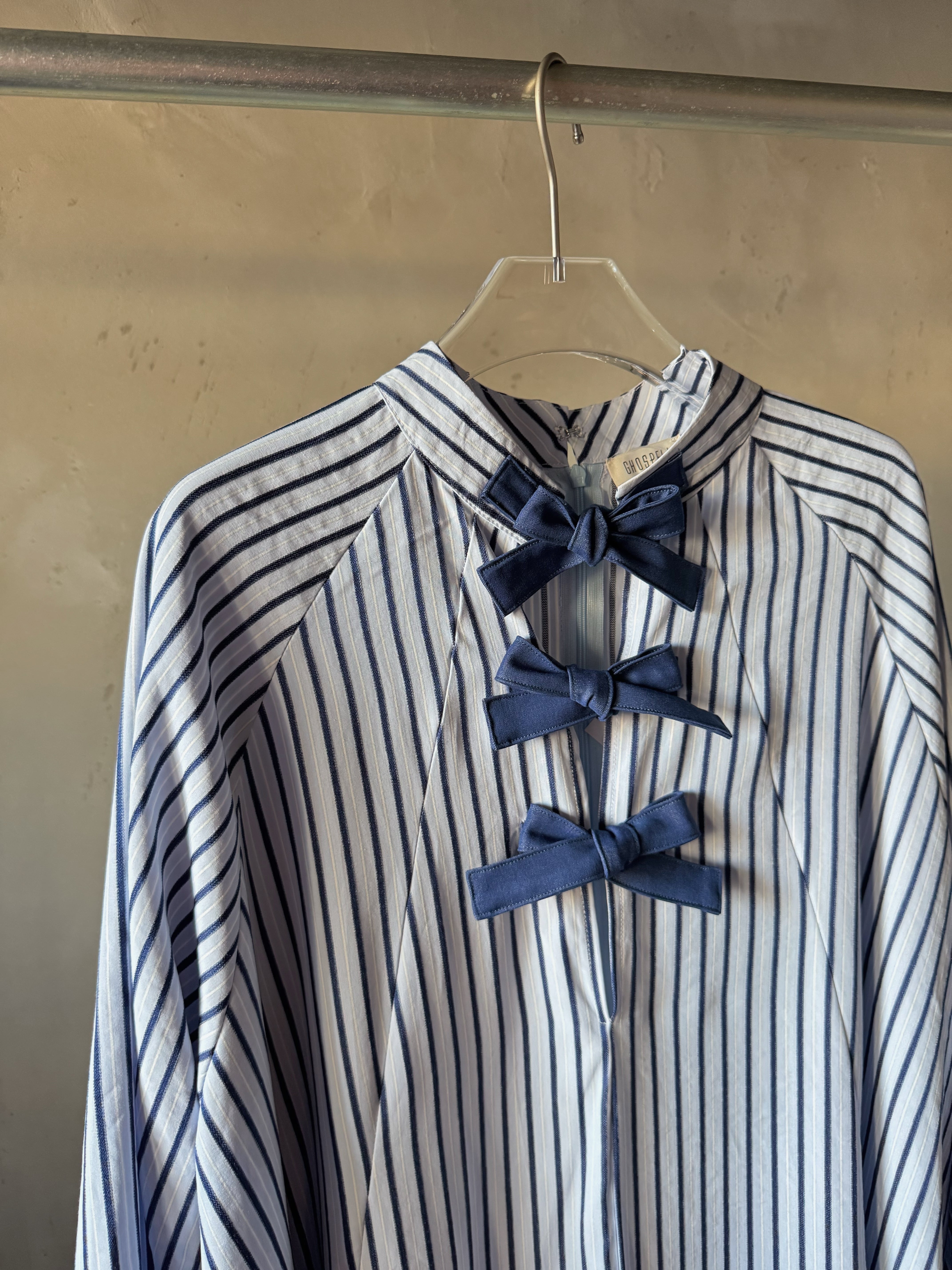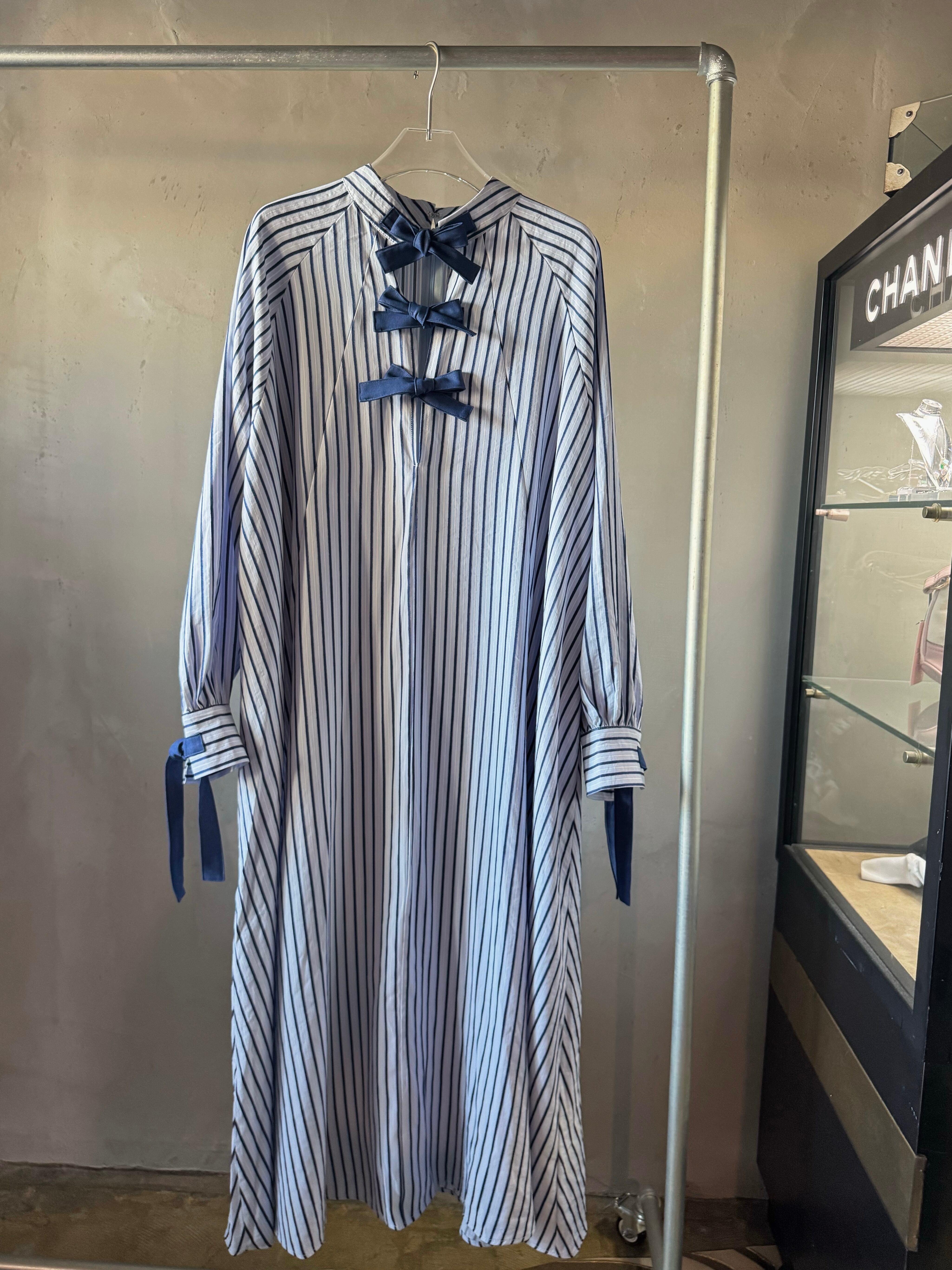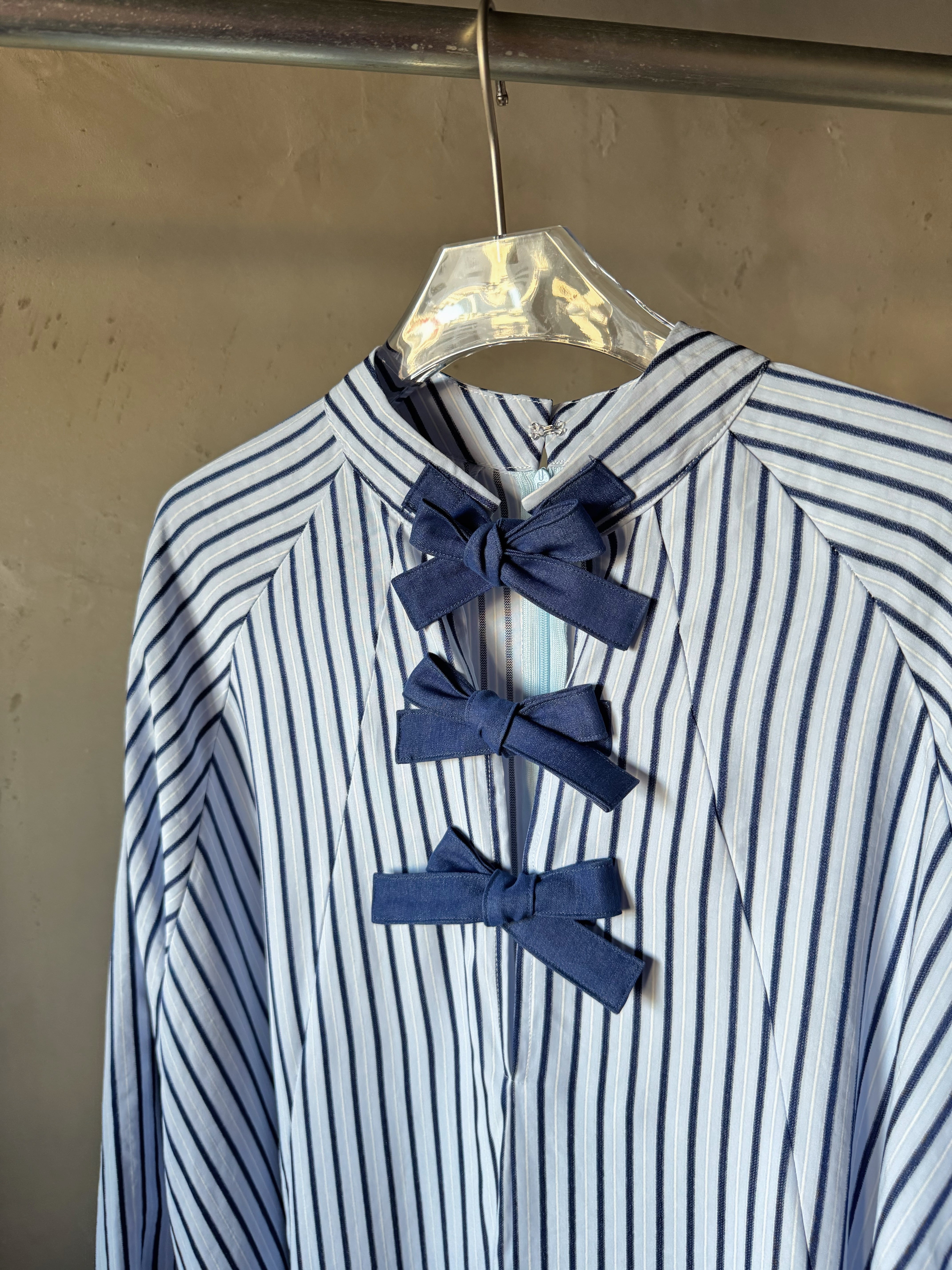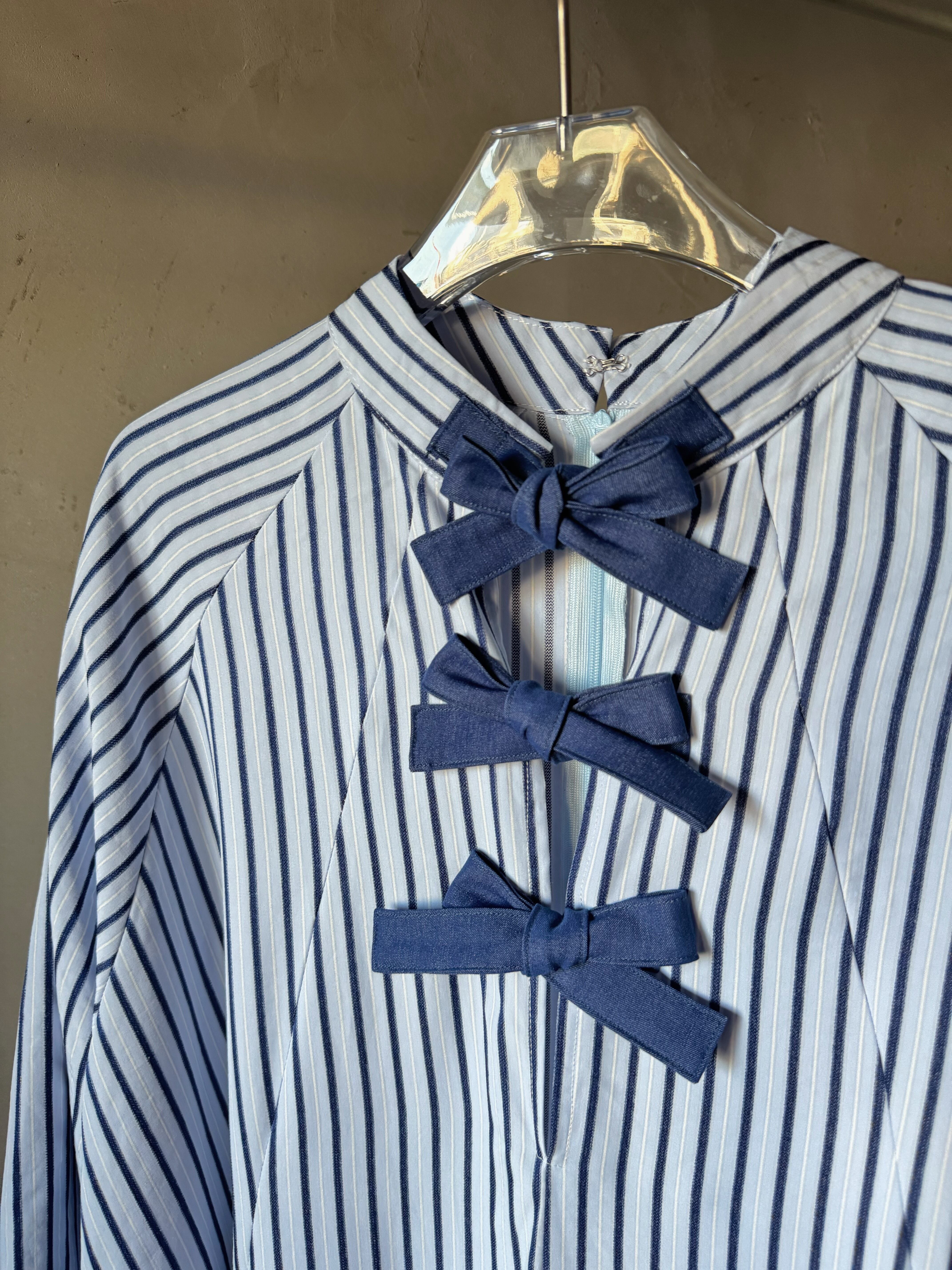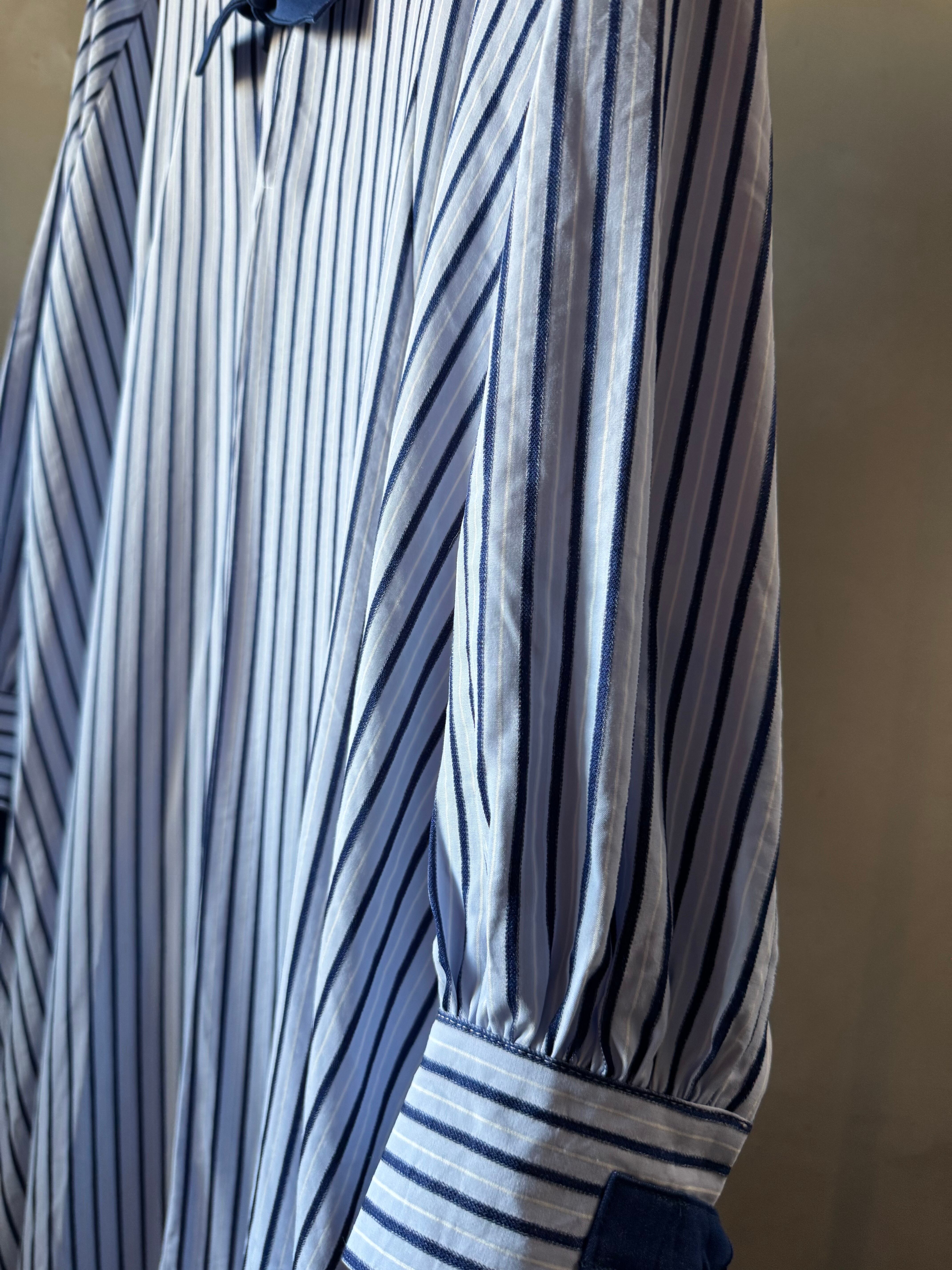 ストライプの織物で作られたオーバーサイズのミディドレス。パネルデザインで、ラグランスリーブを特徴とし、前面開口部にコントラストのあるタイで留められています。追加の背面ジッパーで仕上げました。ドレスの長さは、サイズに応じて126~130センチメートルです。