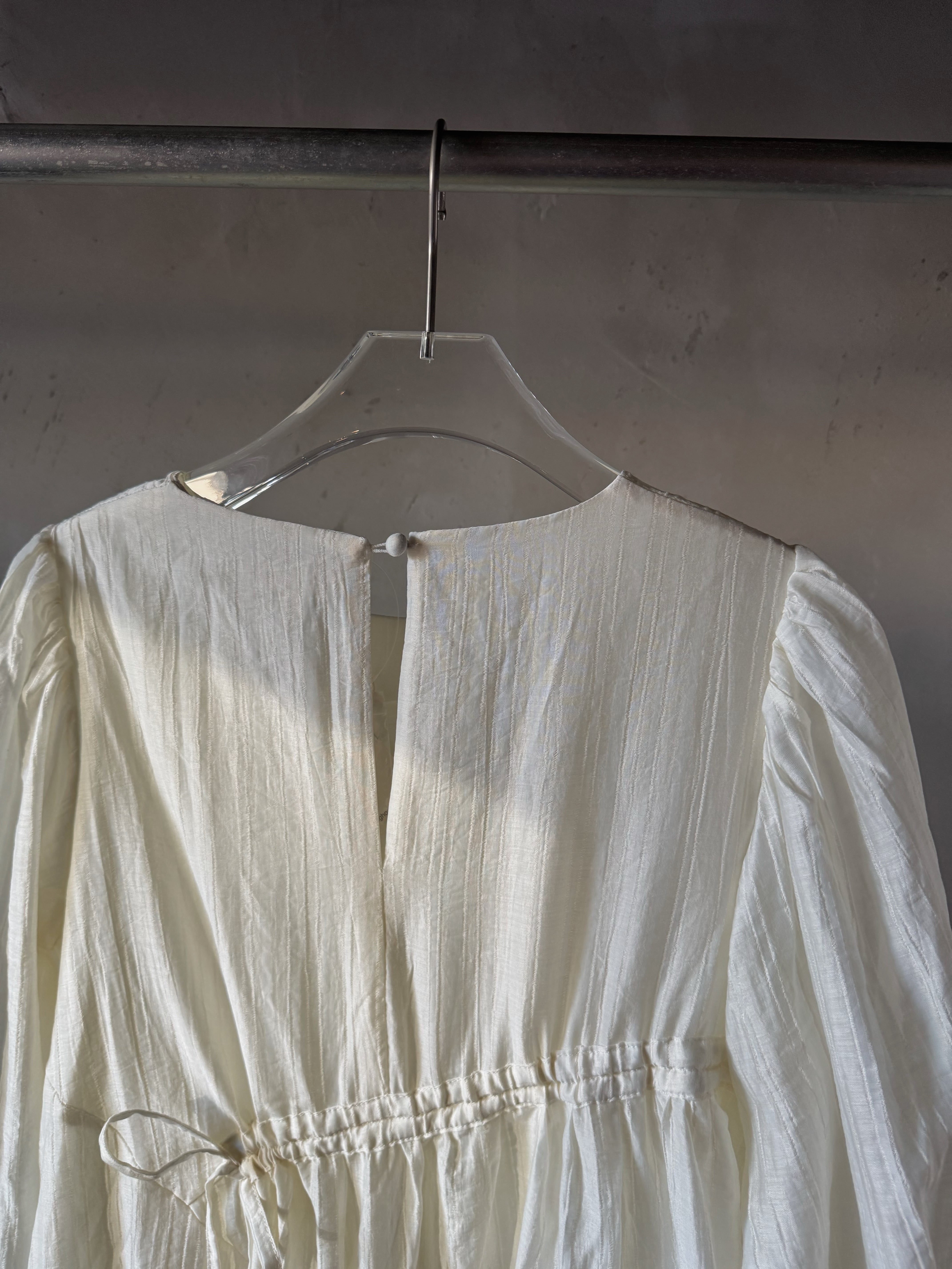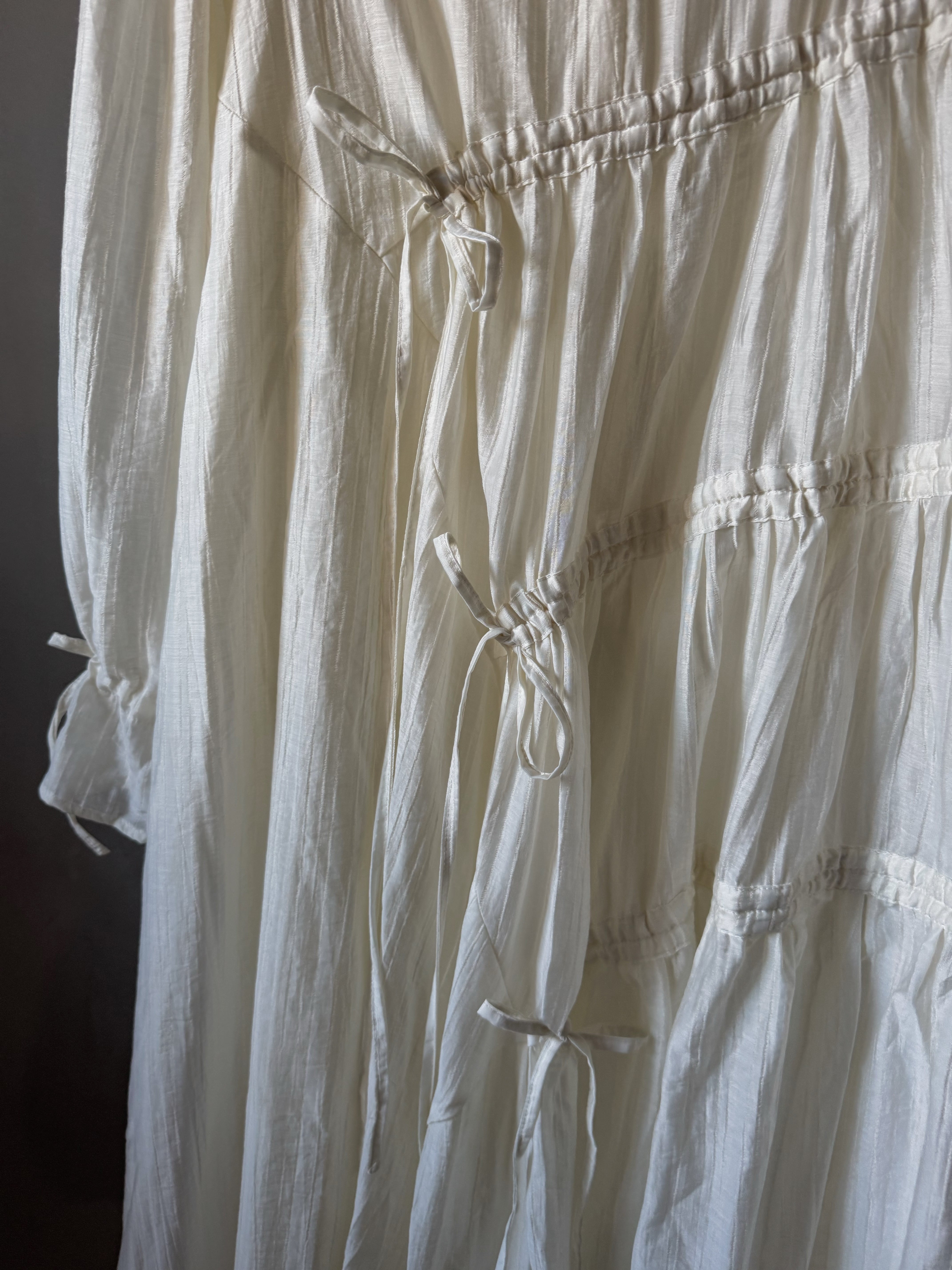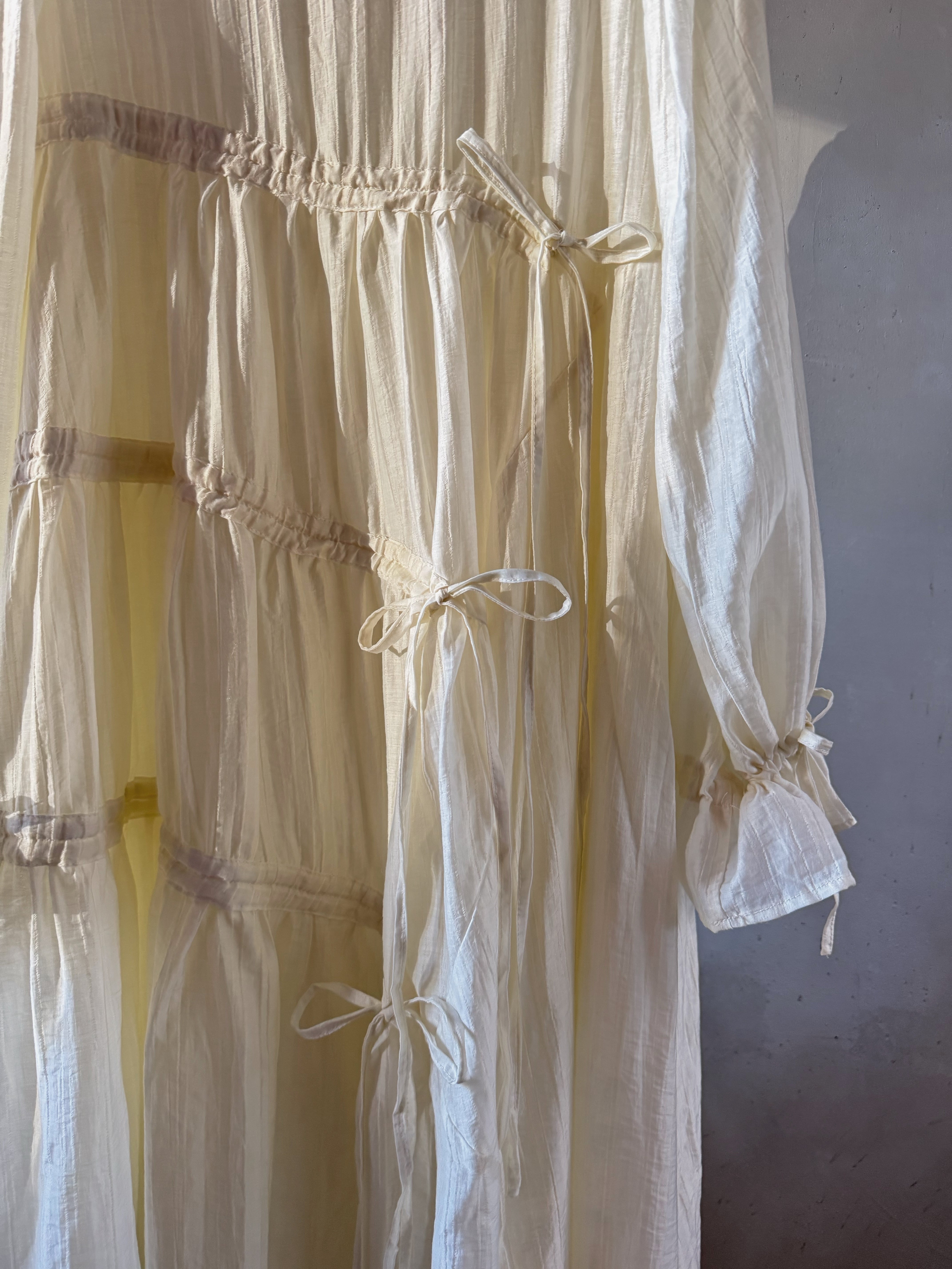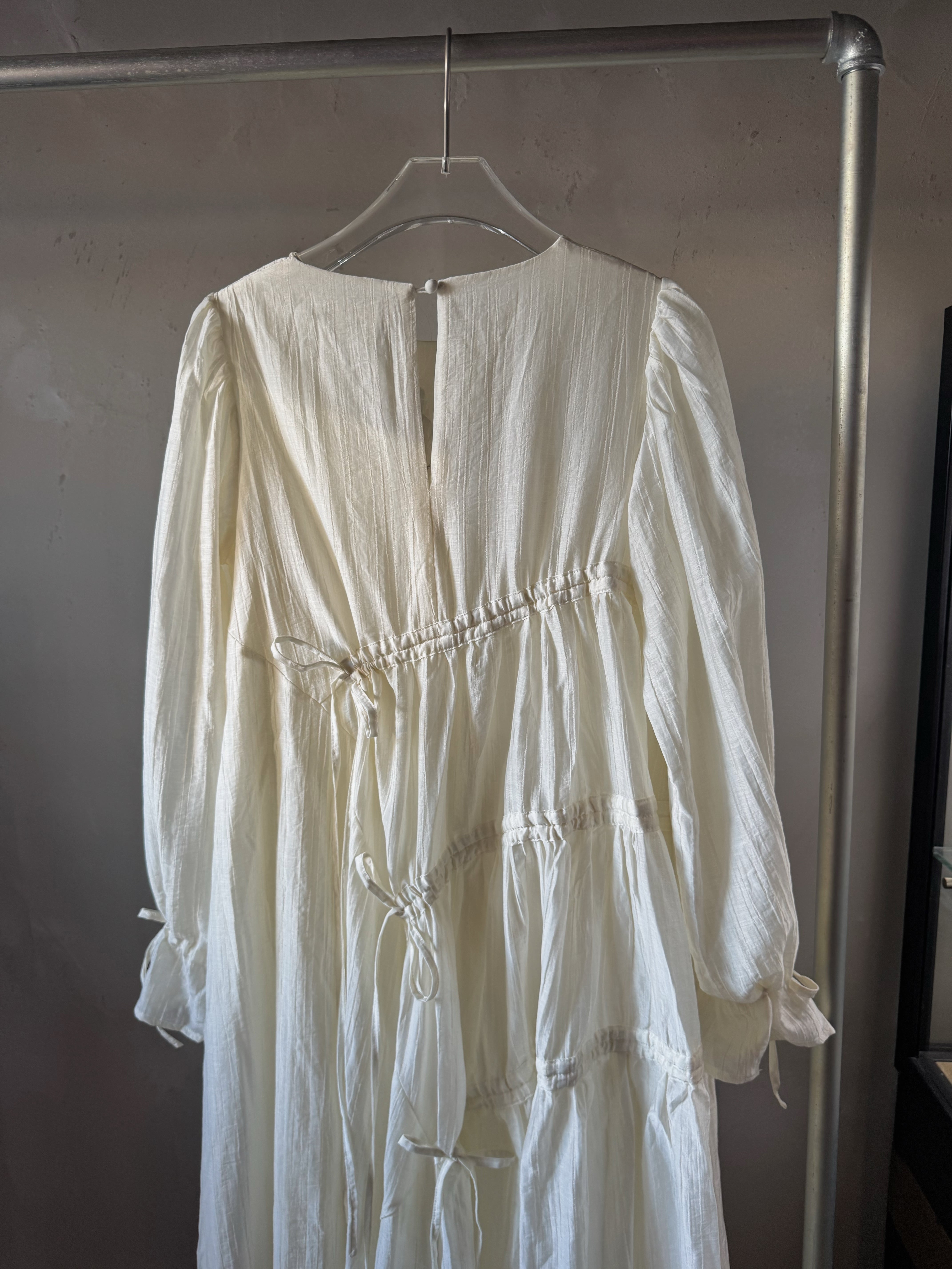 軽量テクスチャー生地の非対称マキシドレス。調整可能なタイが付いた段層のラッフルスカートがディテールされたオーバーサイズフィットです。調整可能なカフとカバーボタン留めで仕上げられています。ドレスの長さは、サイズに応じて139~143センチメートルです。