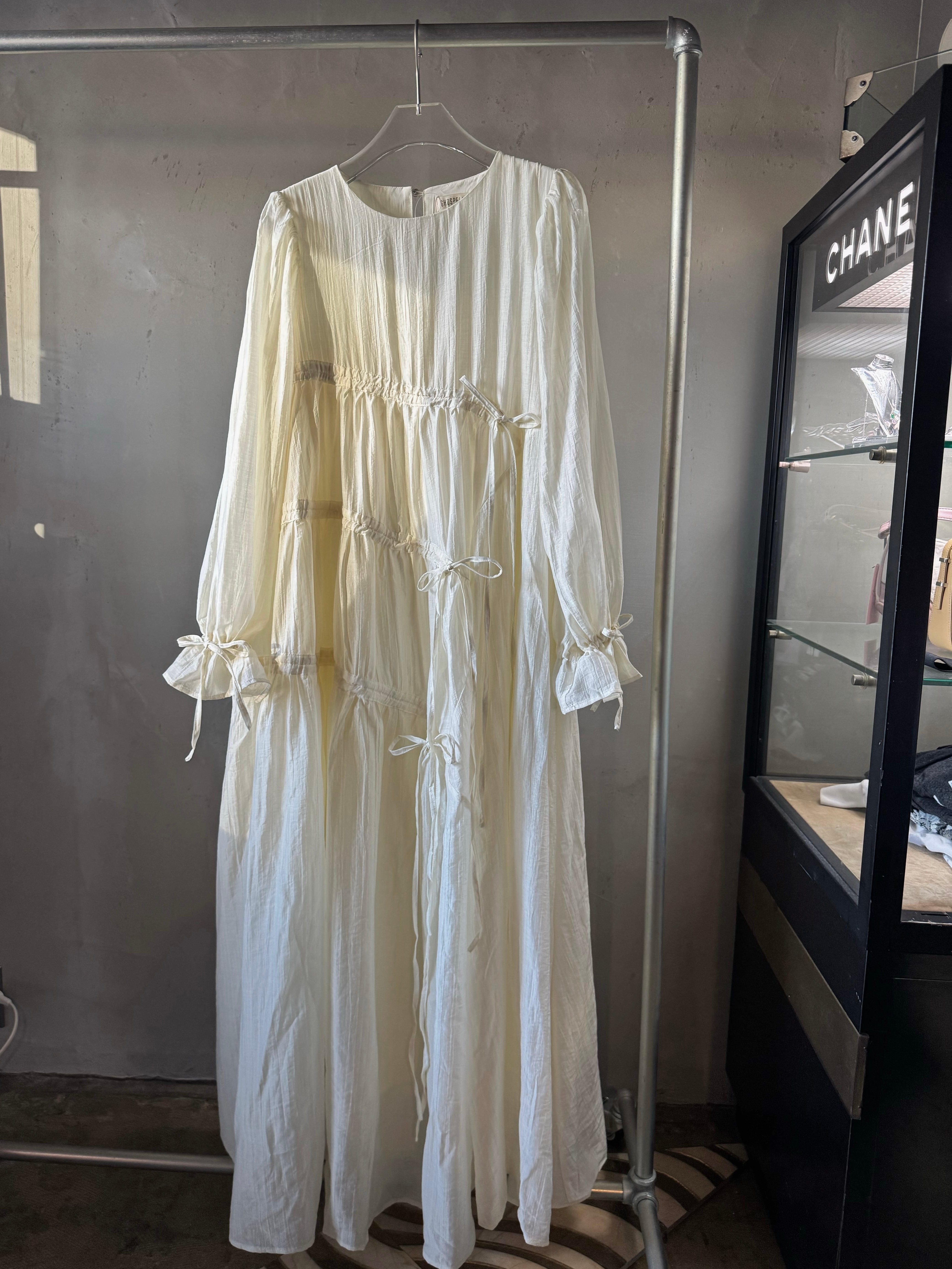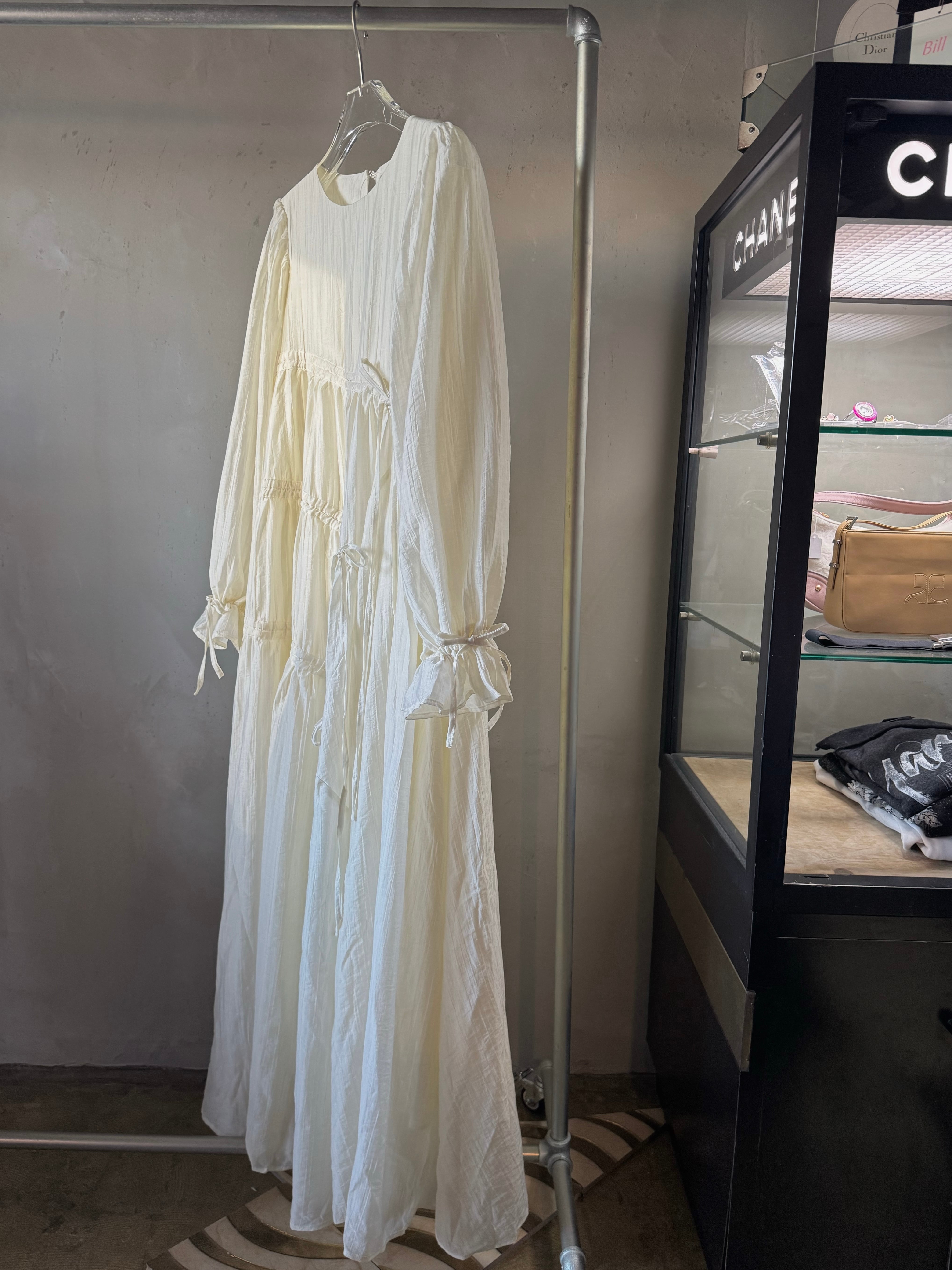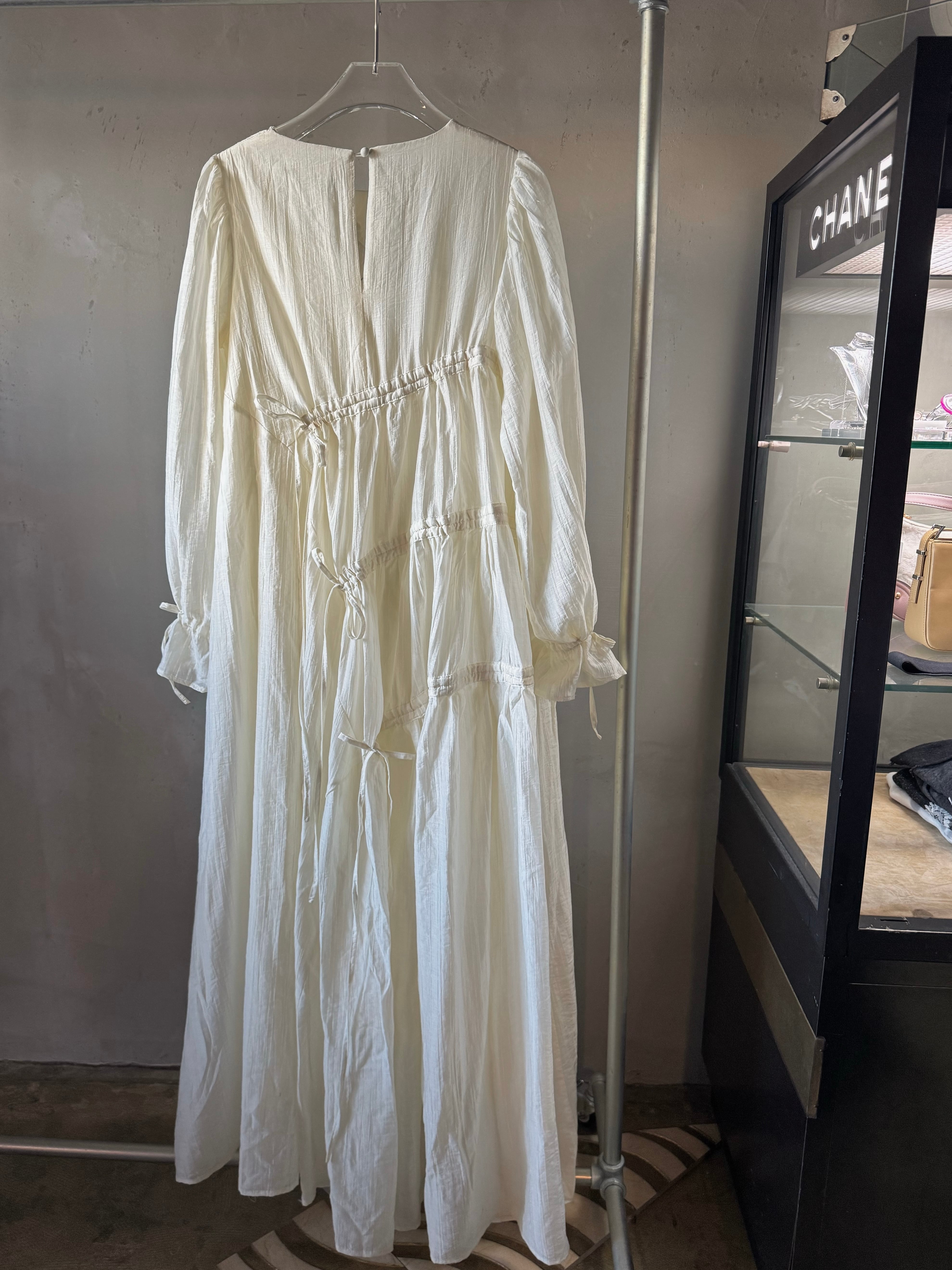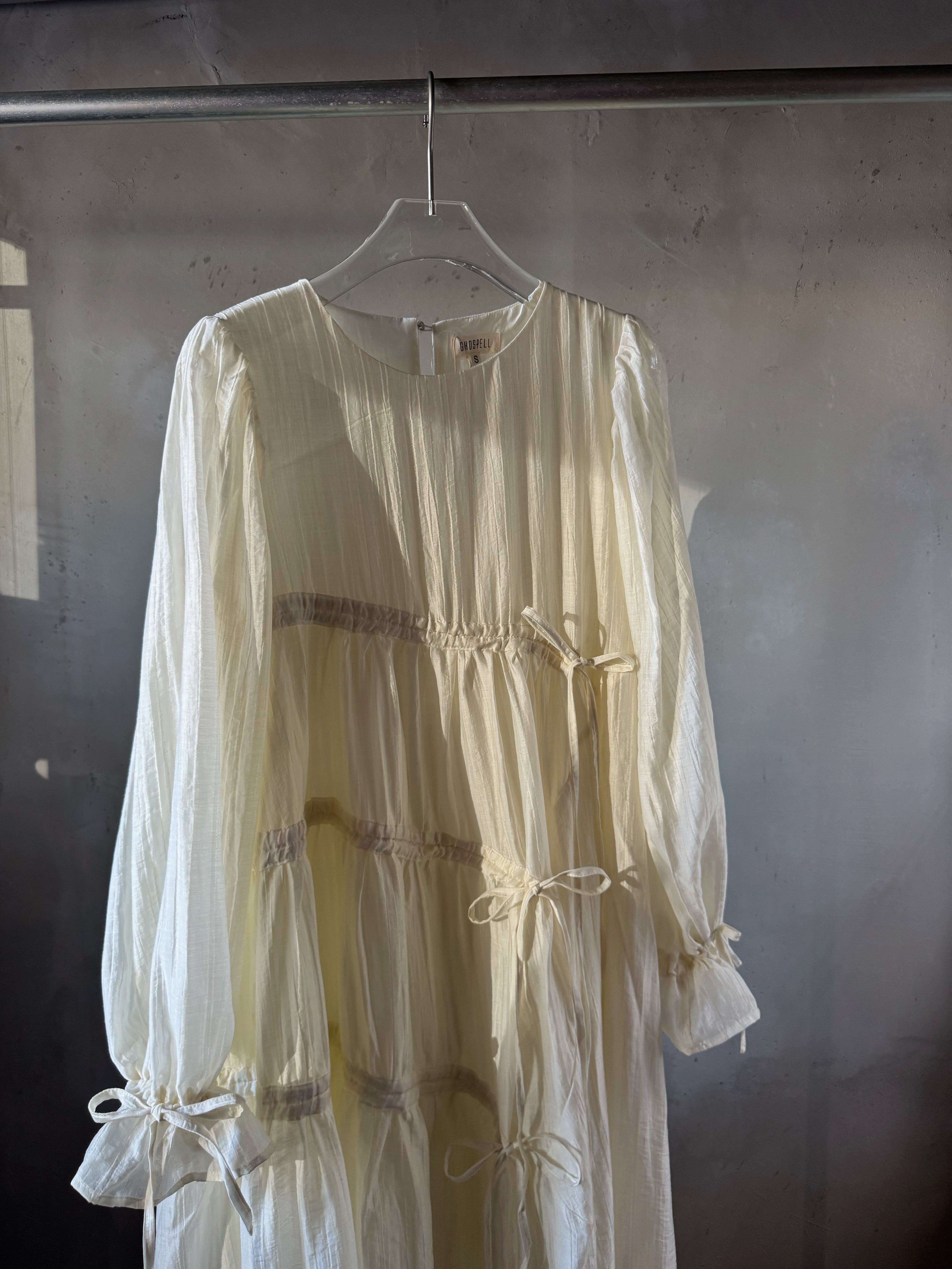 軽量テクスチャー生地の非対称マキシドレス。調整可能なタイが付いた段層のラッフルスカートがディテールされたオーバーサイズフィットです。調整可能なカフとカバーボタン留めで仕上げられています。ドレスの長さは、サイズに応じて139~143センチメートルです。