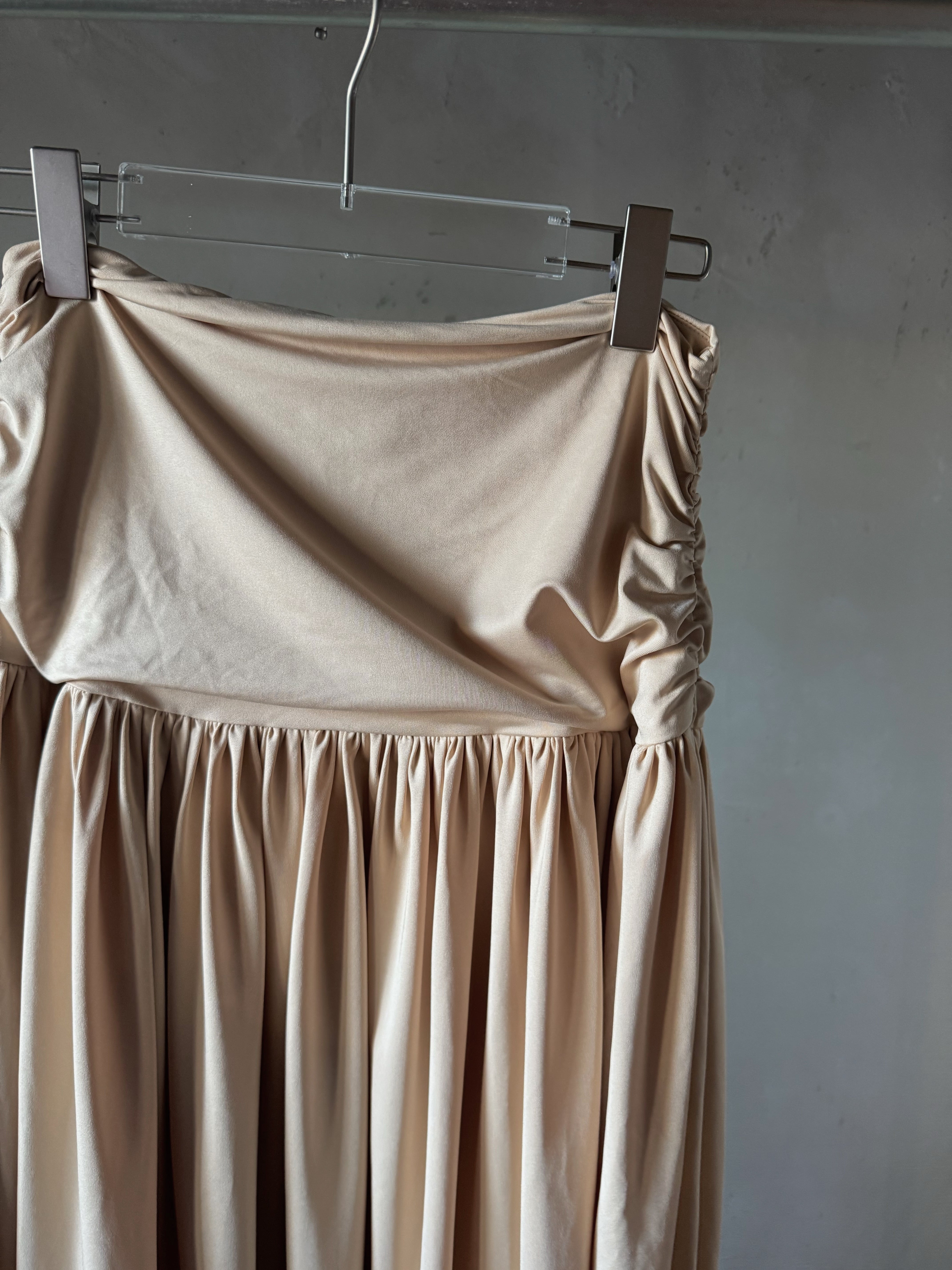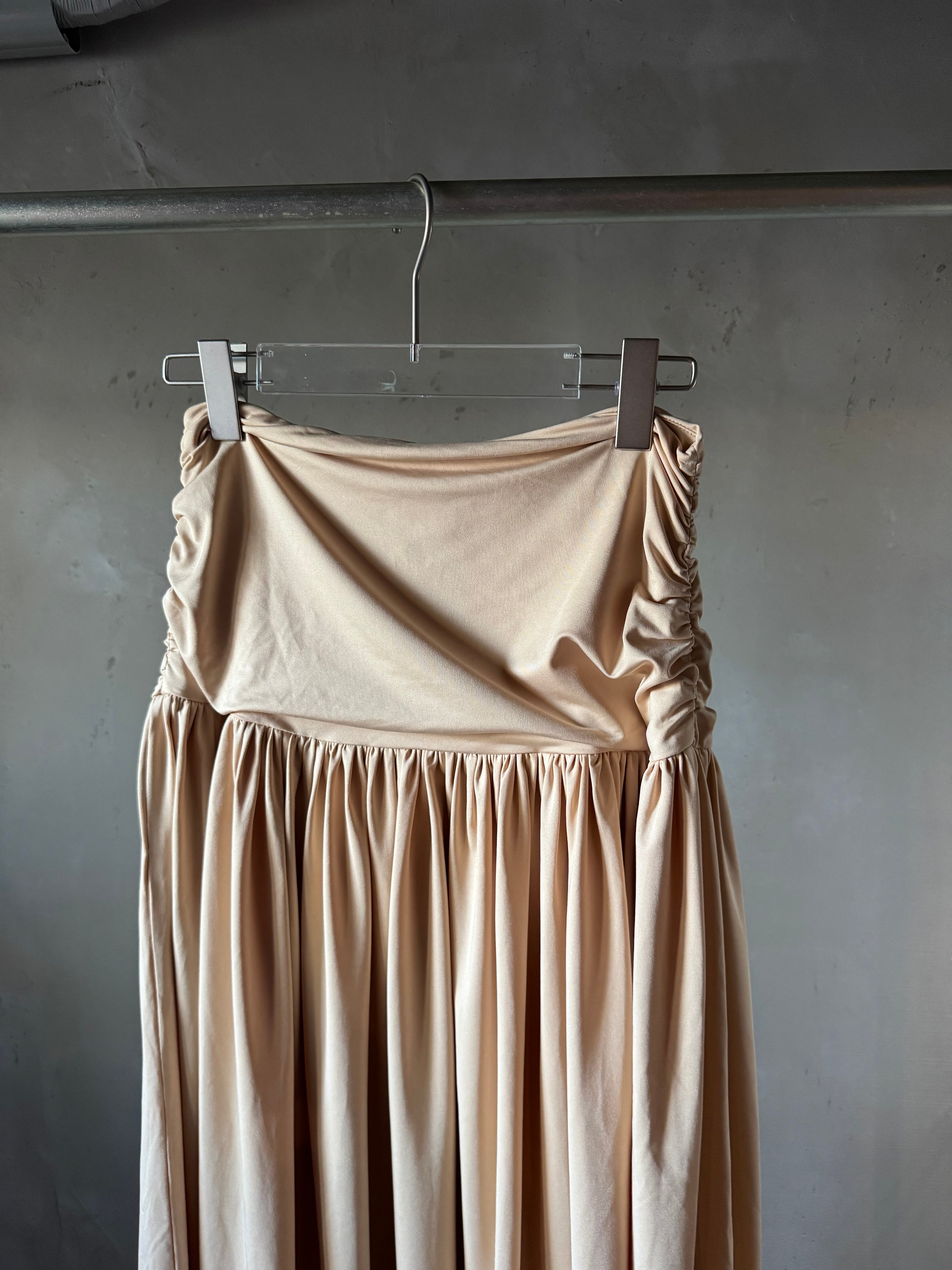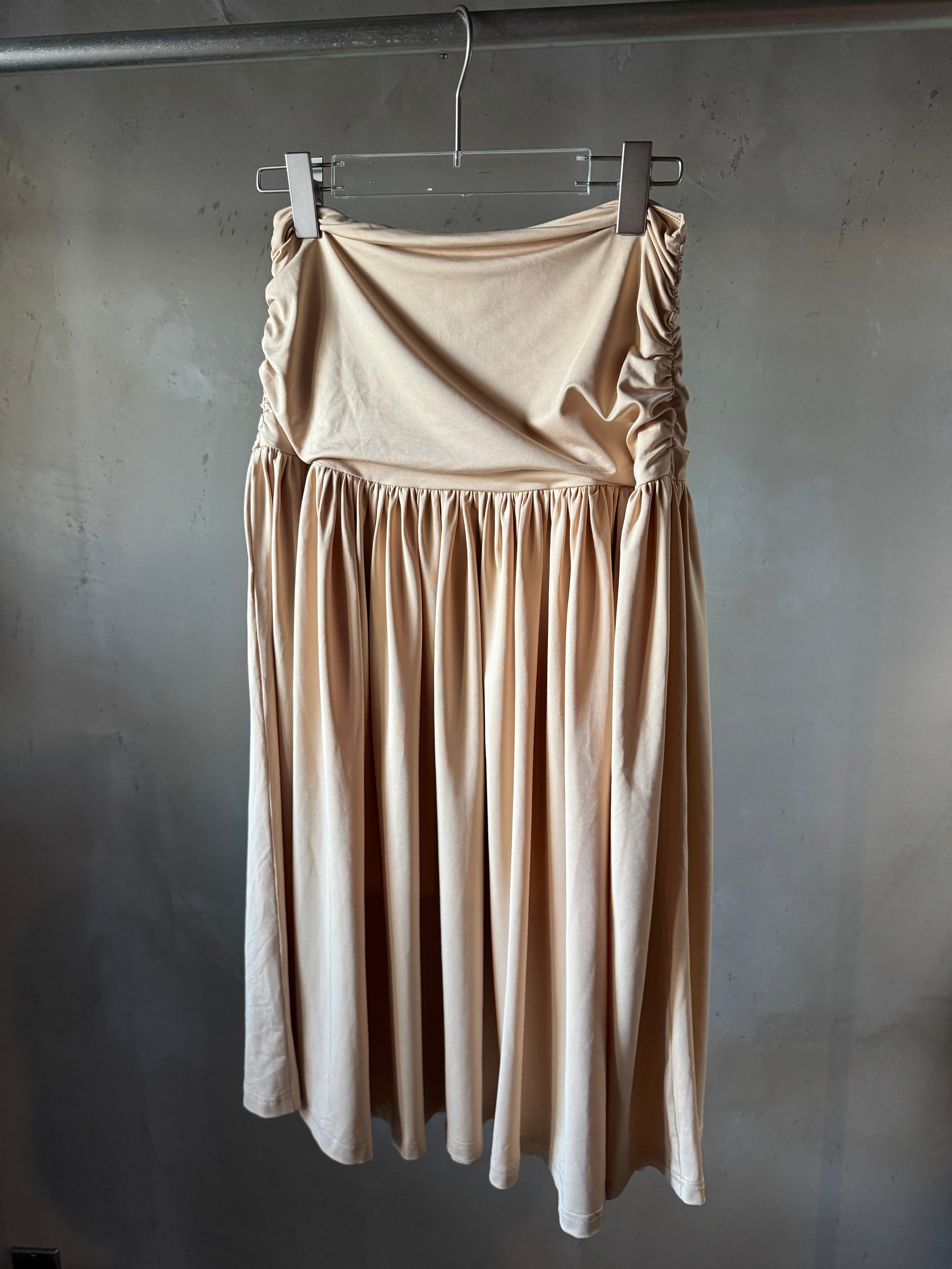 柔らかなストレッチ素材のミディスカート。深くギャザーされたウエストバンドとレッグスプリットを特徴としています。隠しサイドジッパーで留められています。