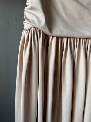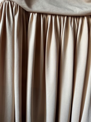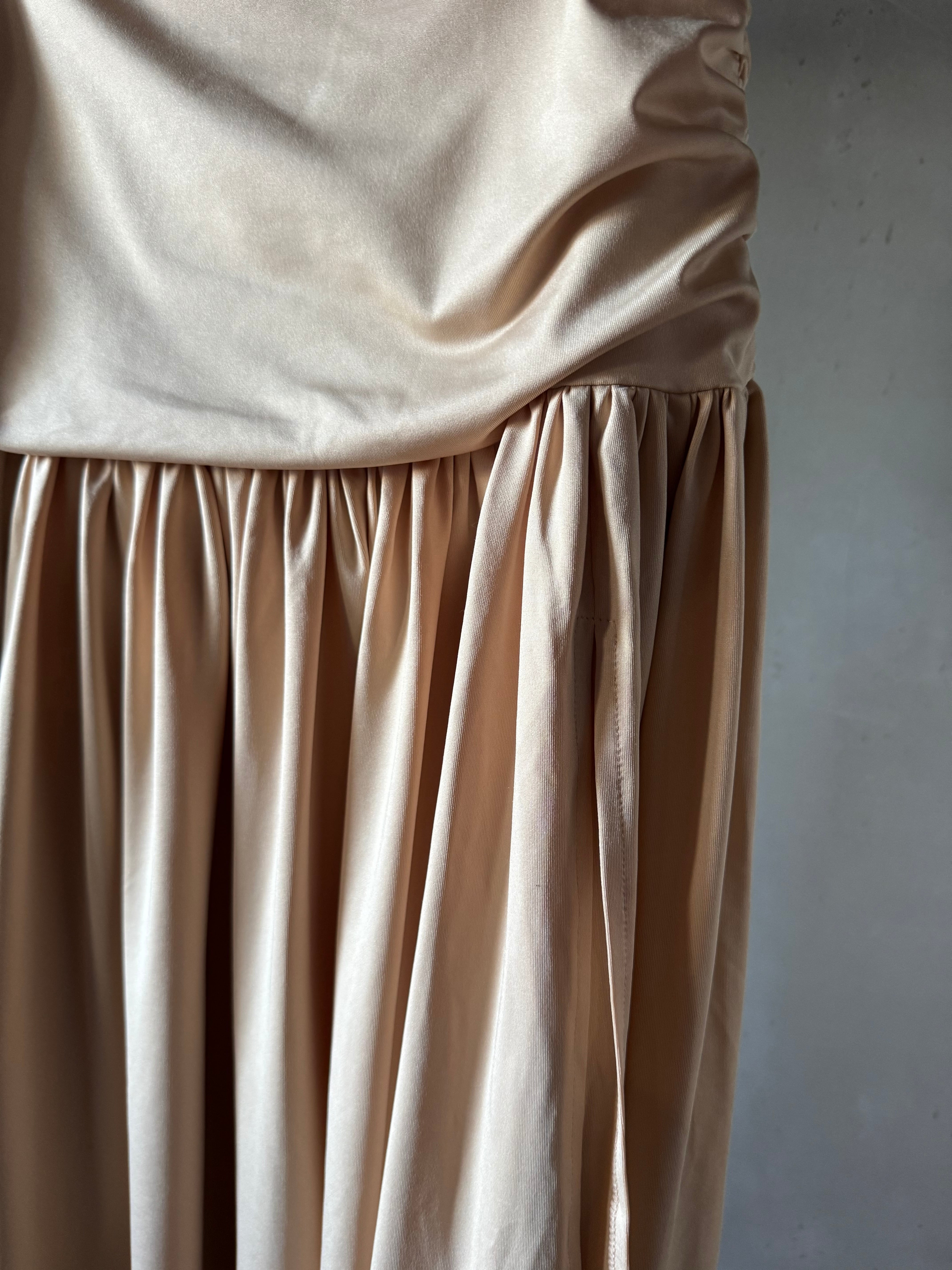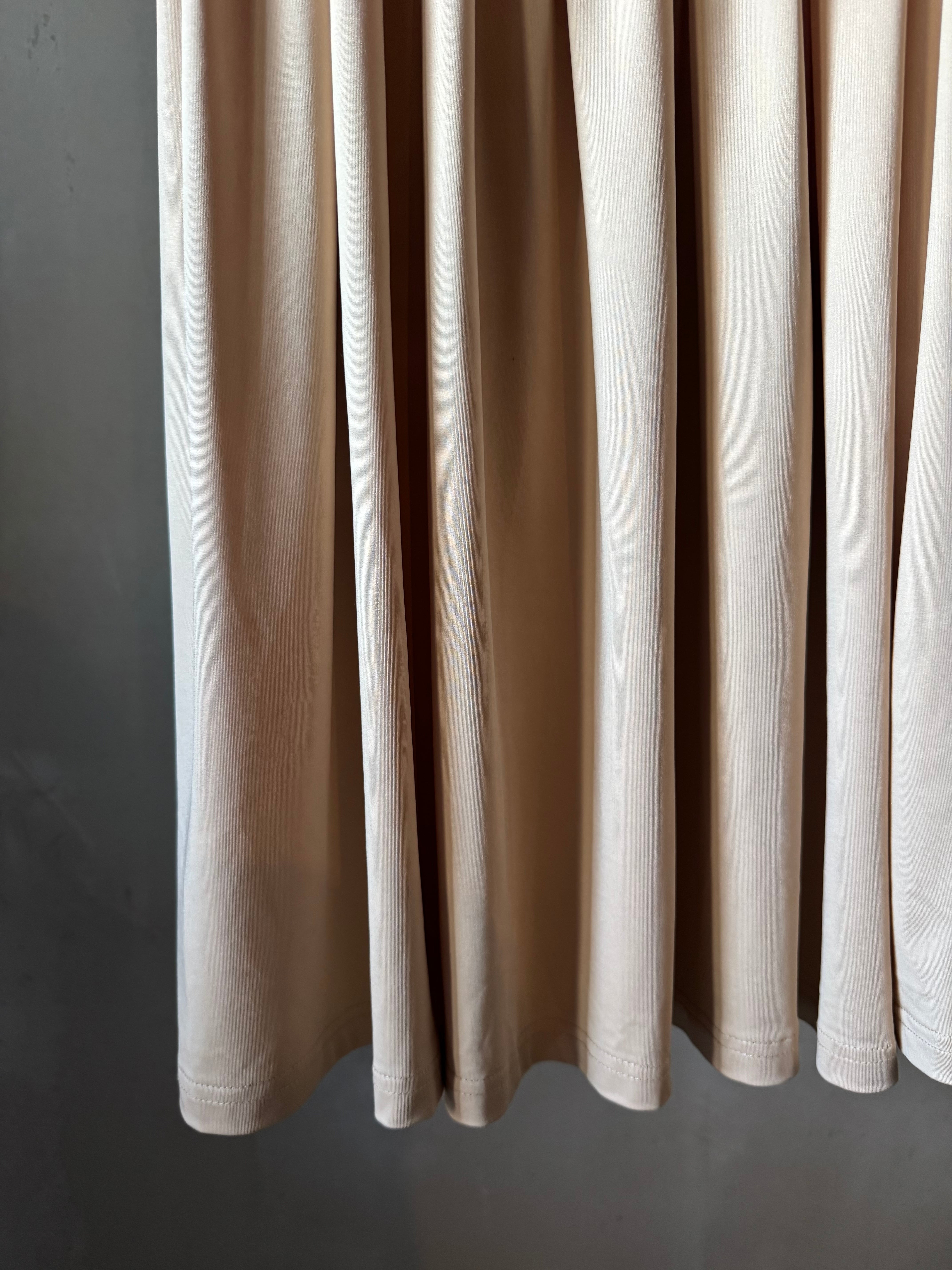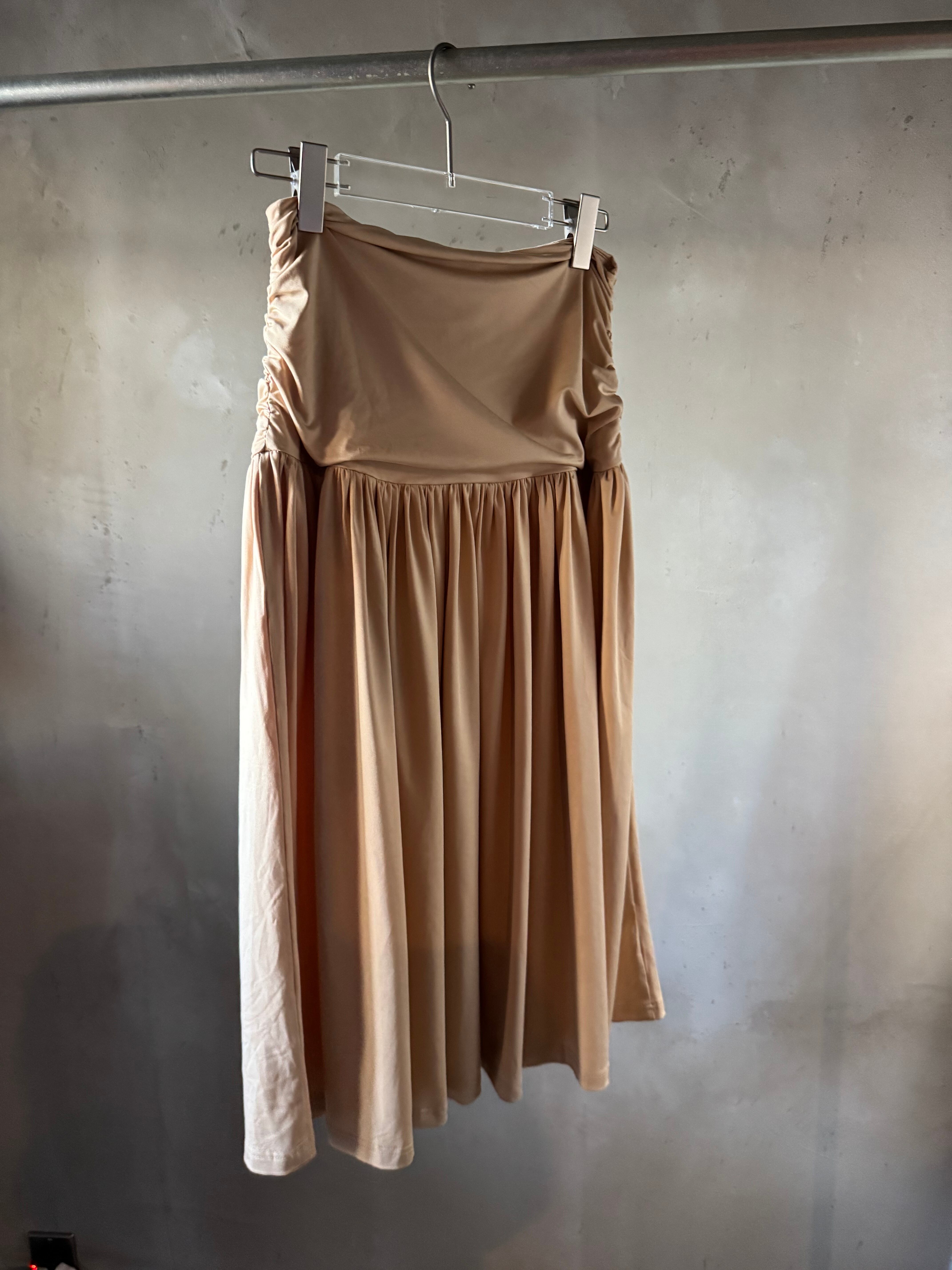 柔らかなストレッチ素材のミディスカート。深くギャザーされたウエストバンドとレッグスプリットを特徴としています。隠しサイドジッパーで留められています。