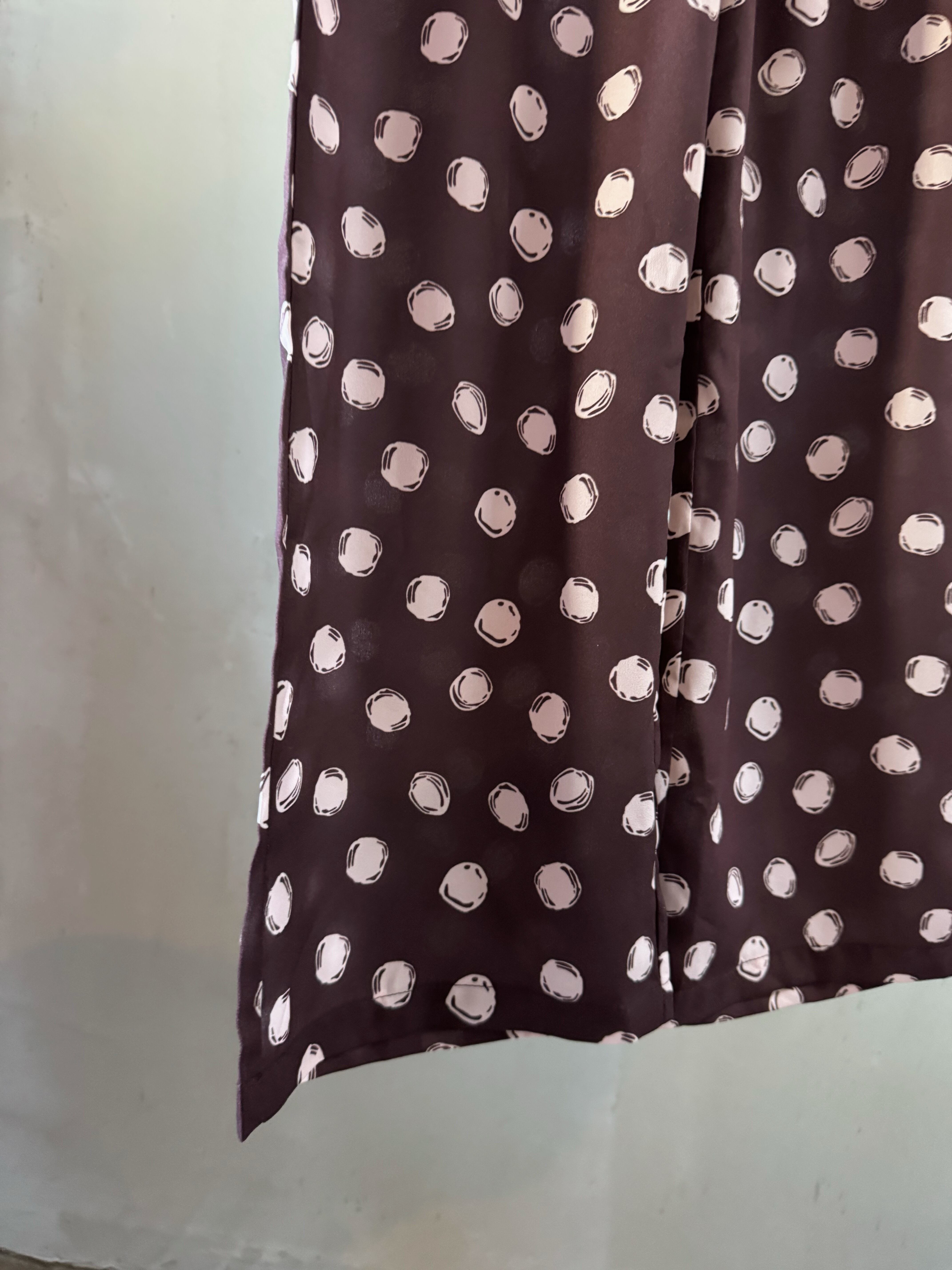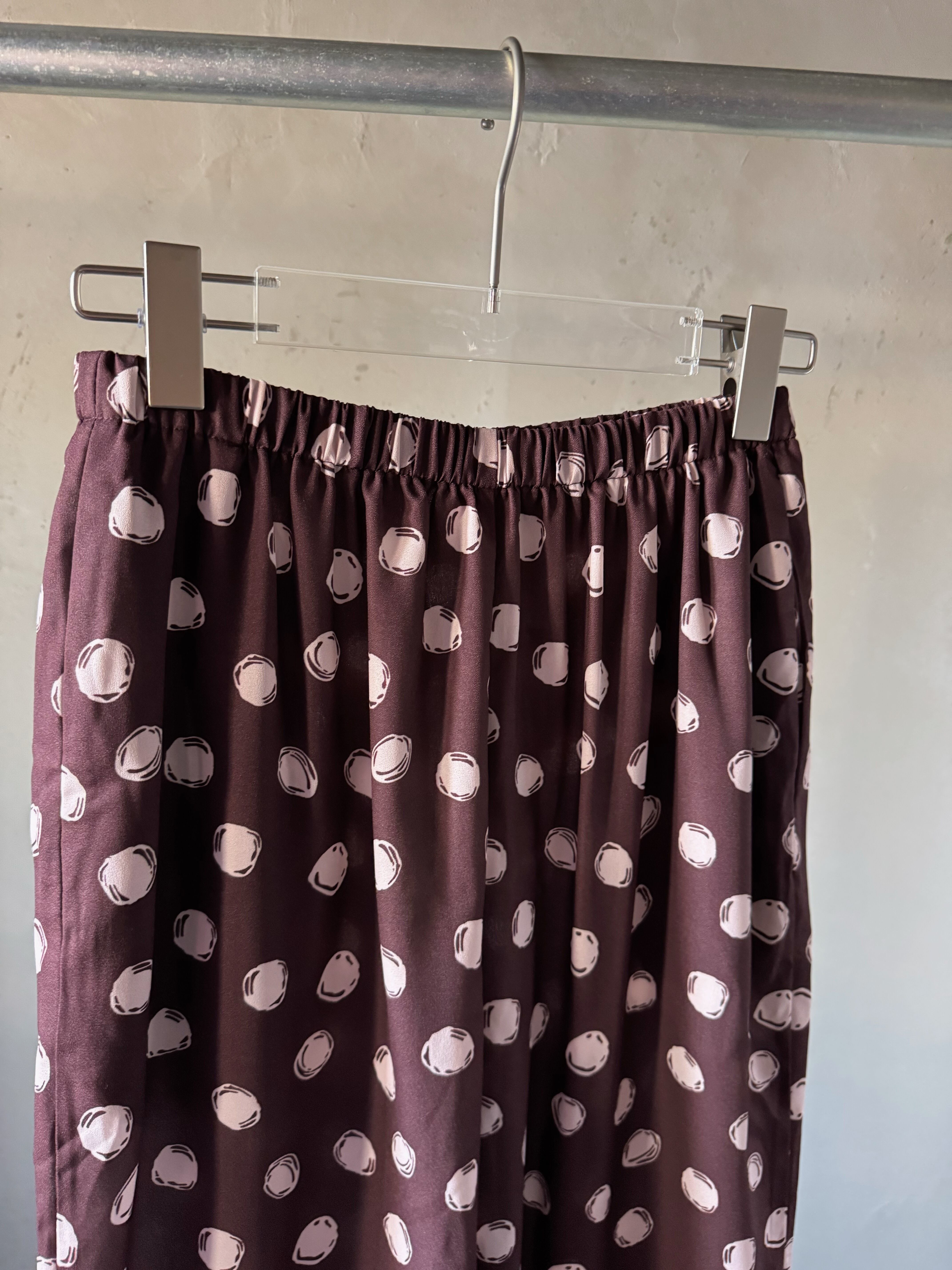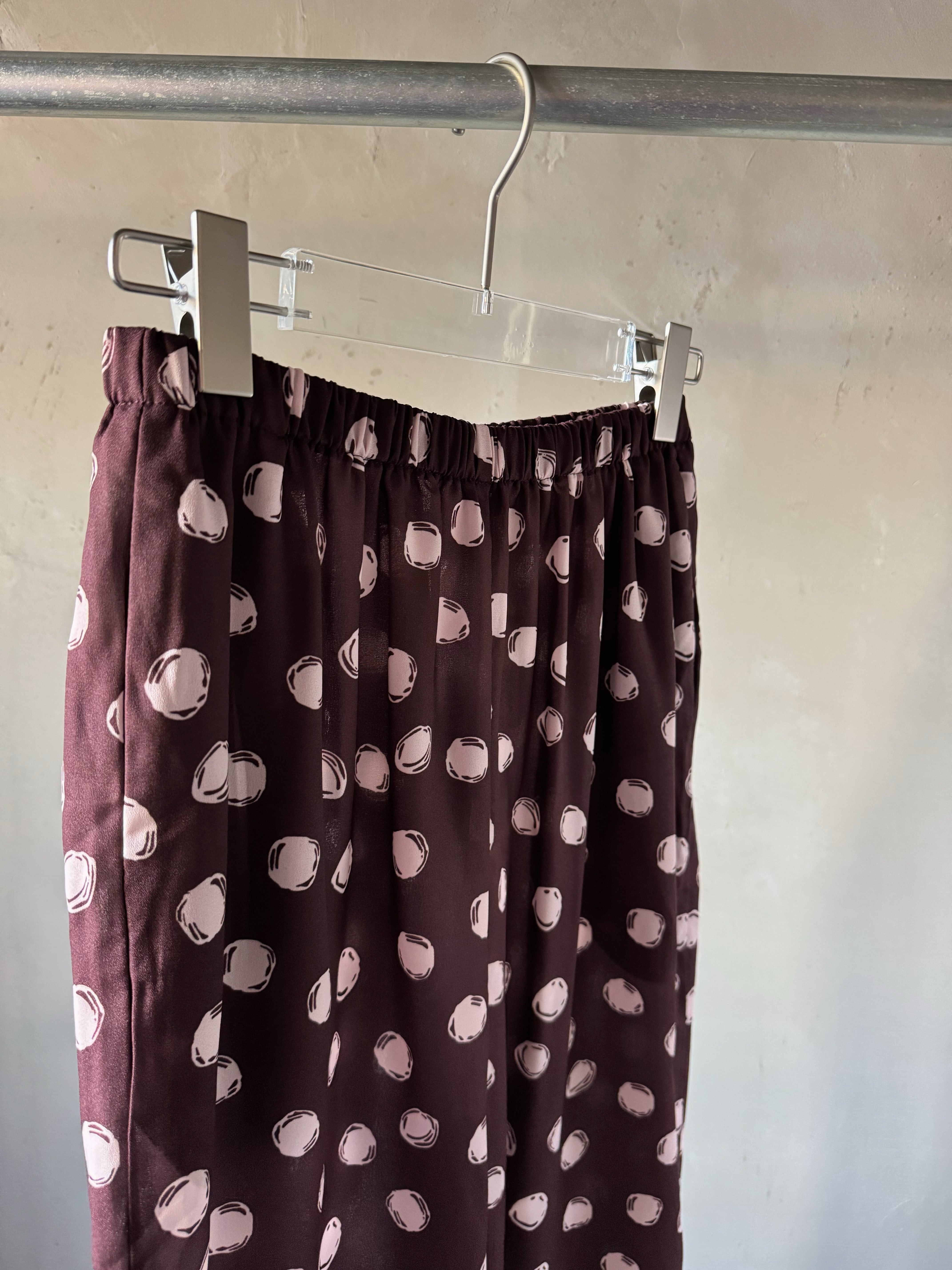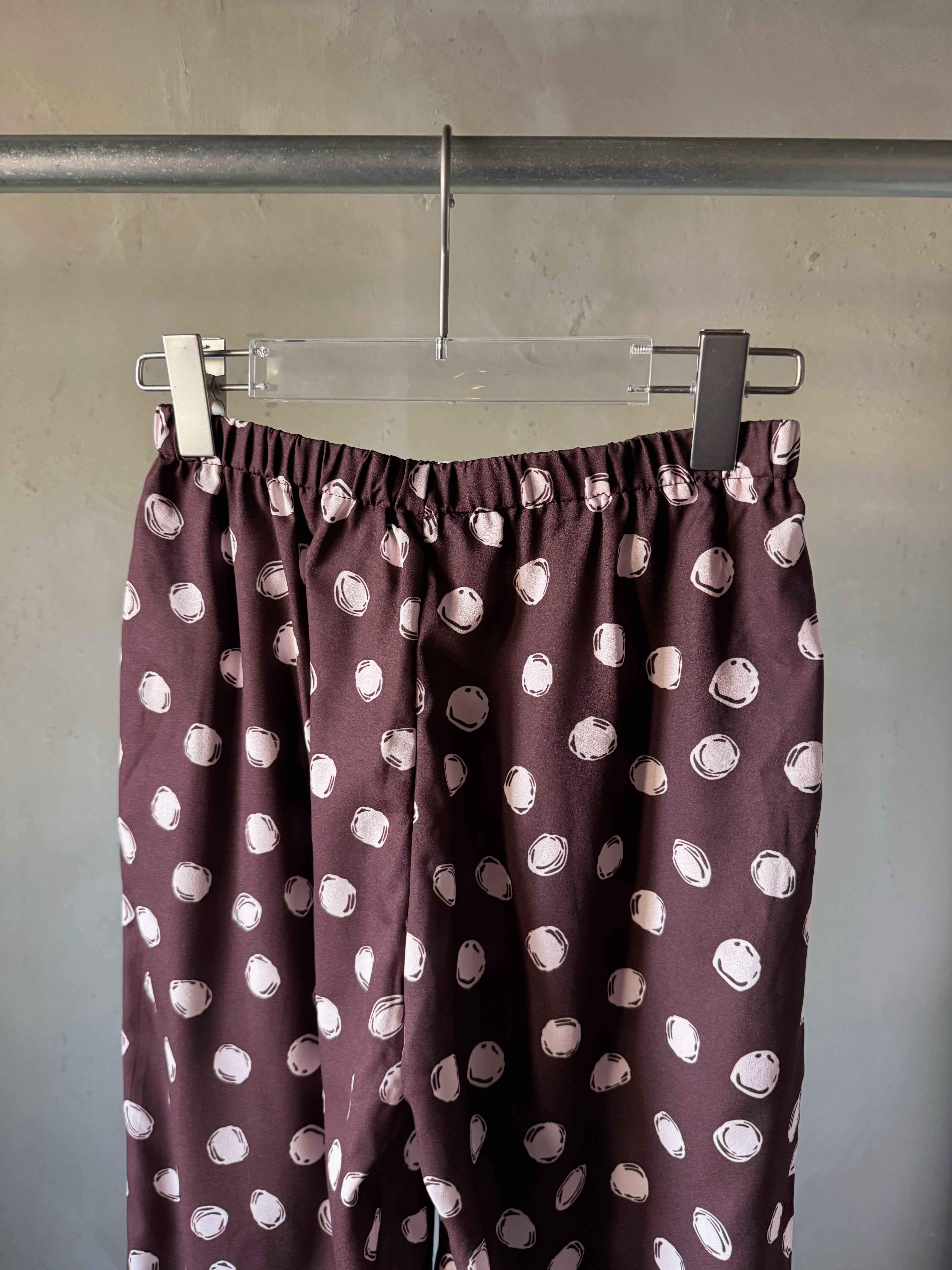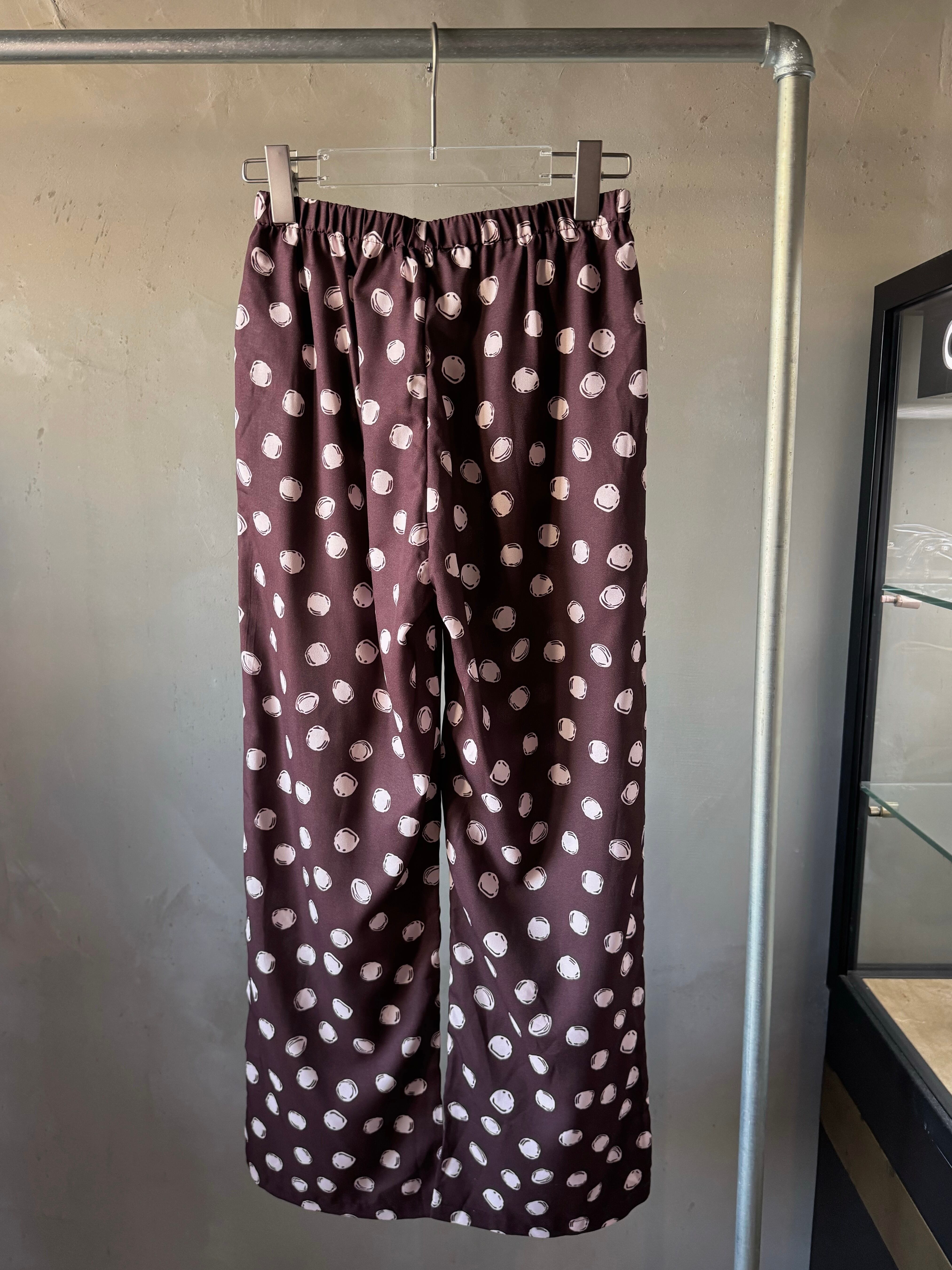 リラックスフィットのパンツ。リサイクルポリエステル織地に水玉模様をプリント。ウエストはゴム仕様、プルオンスタイルでサイドポケット付き。