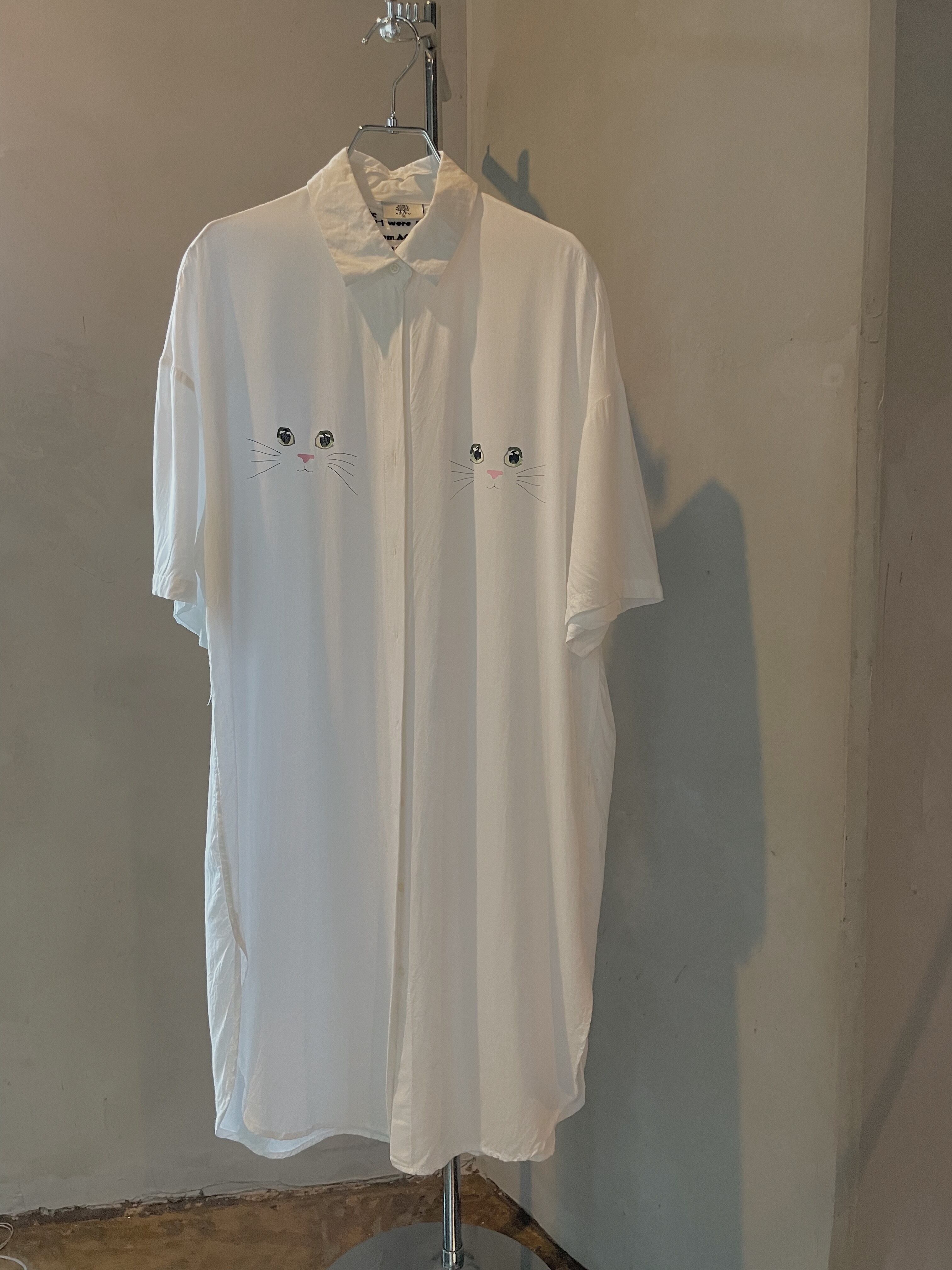 柔らかいコットンで猫ちゃんのお顔がプリントされているシャツワンピースです。