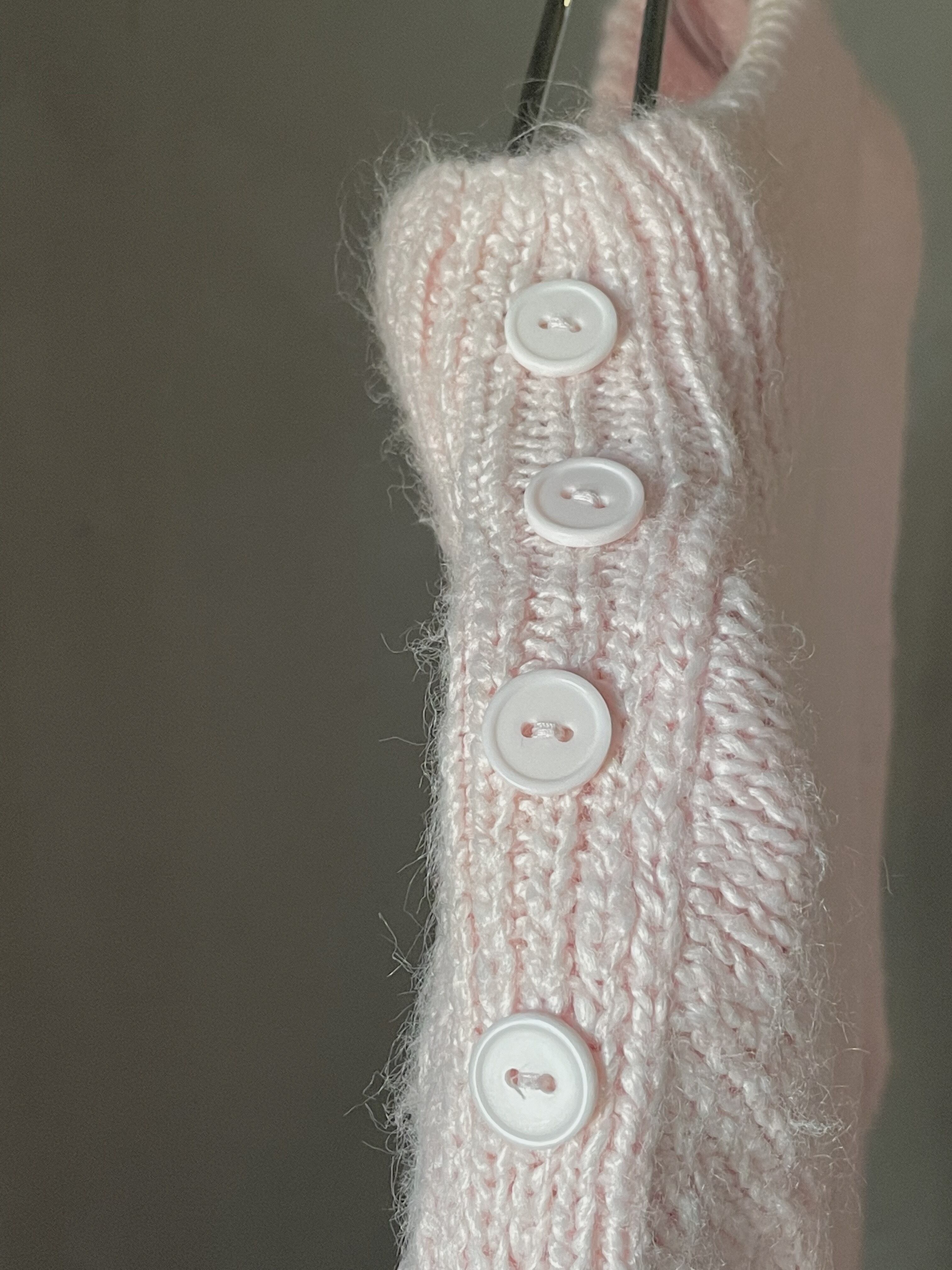 柔らかいピンクに肩のボタンがとっても可愛いニットです。