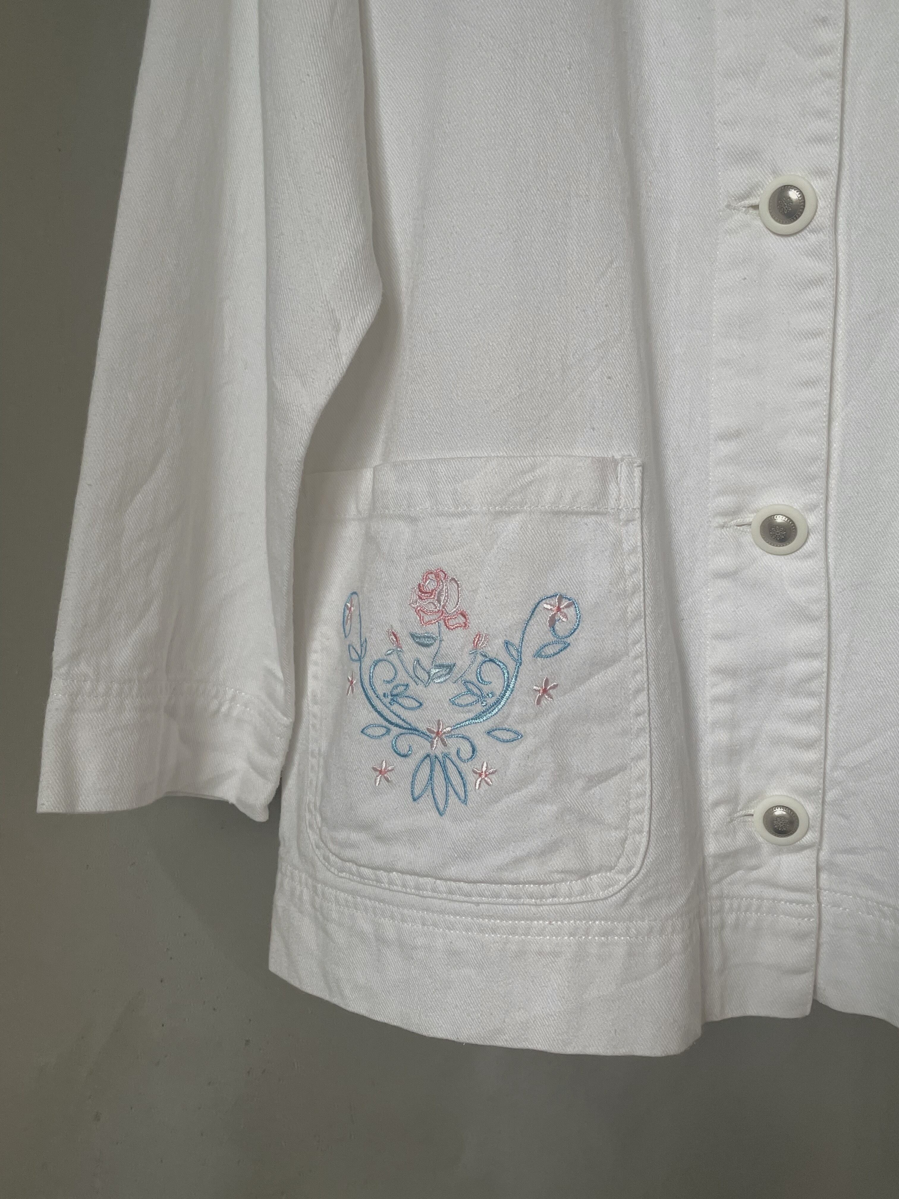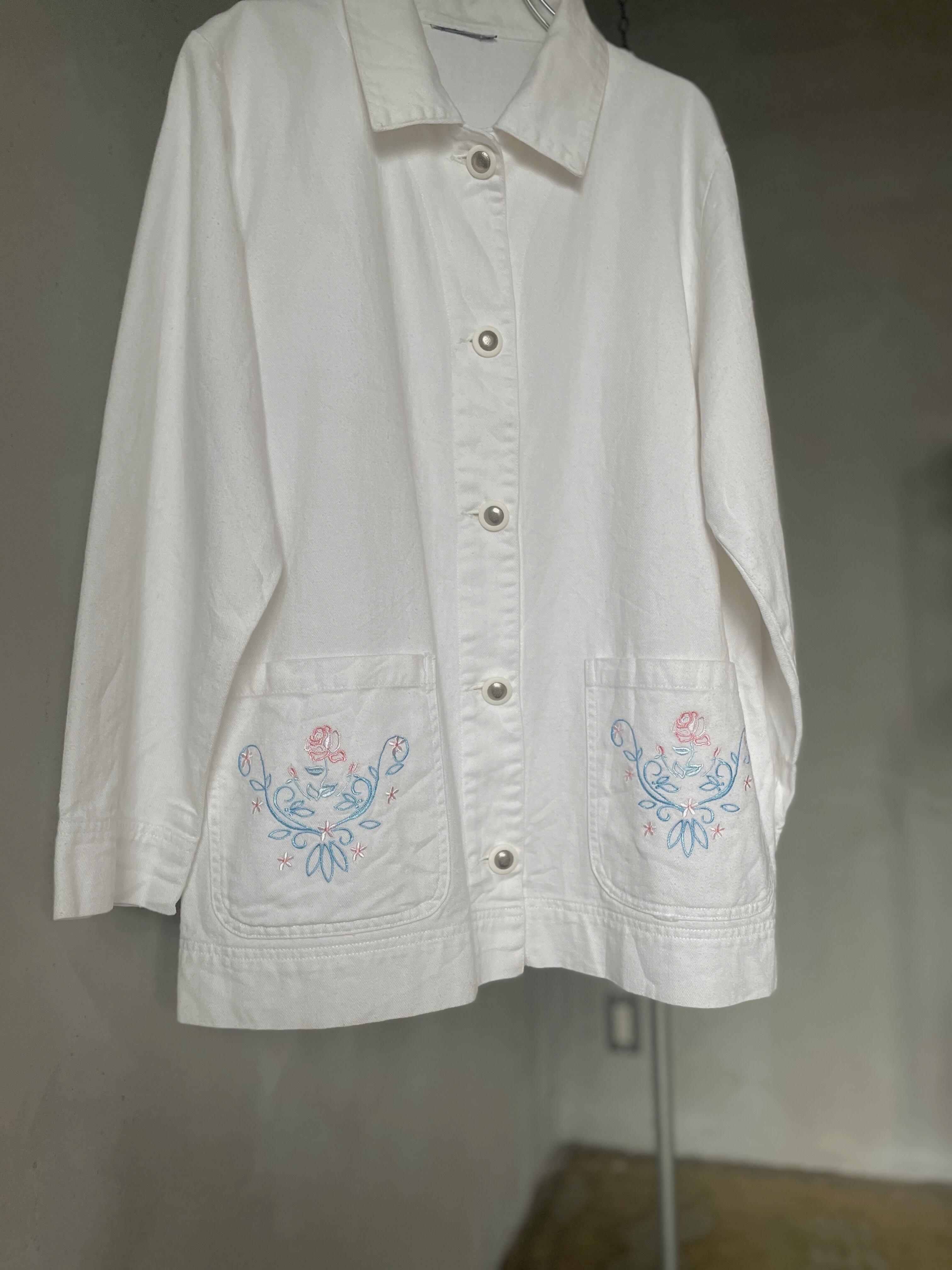 パステルカラーの刺繍がかわいいホワイトデニムのジャケットです。
