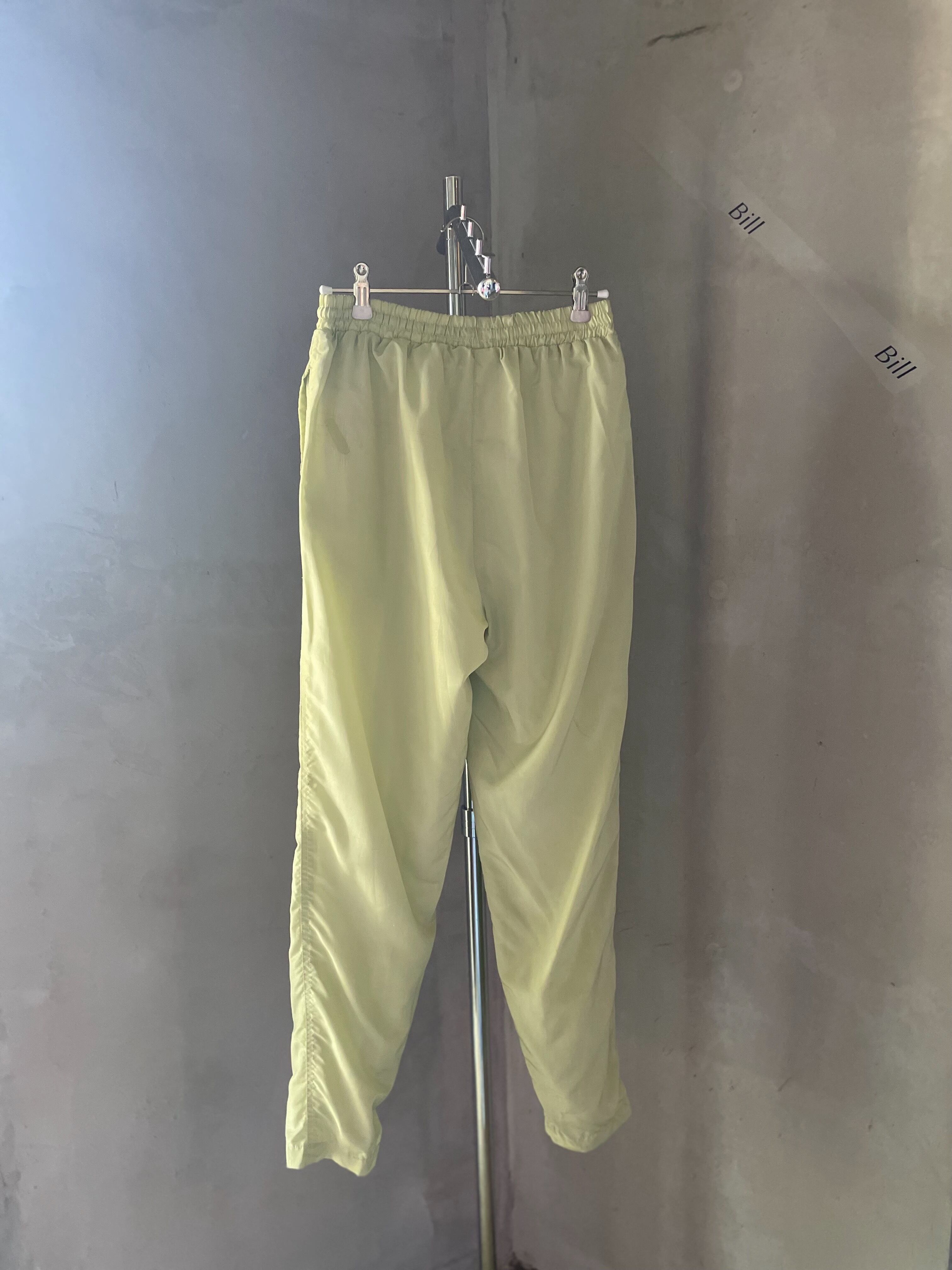 マカロングリーンが綺麗なシャカシャカ素材のパンツです。