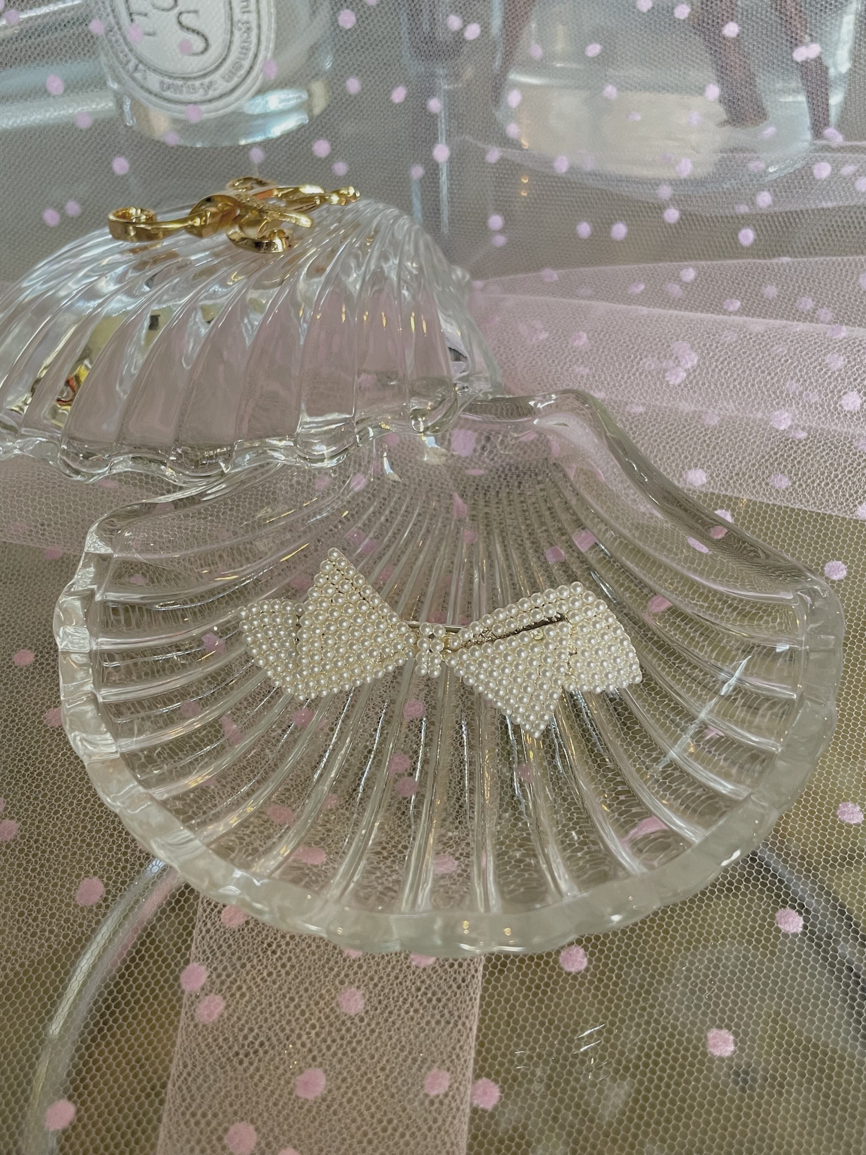 小さいパールがしきつめられたリボンのヘアクリップです。