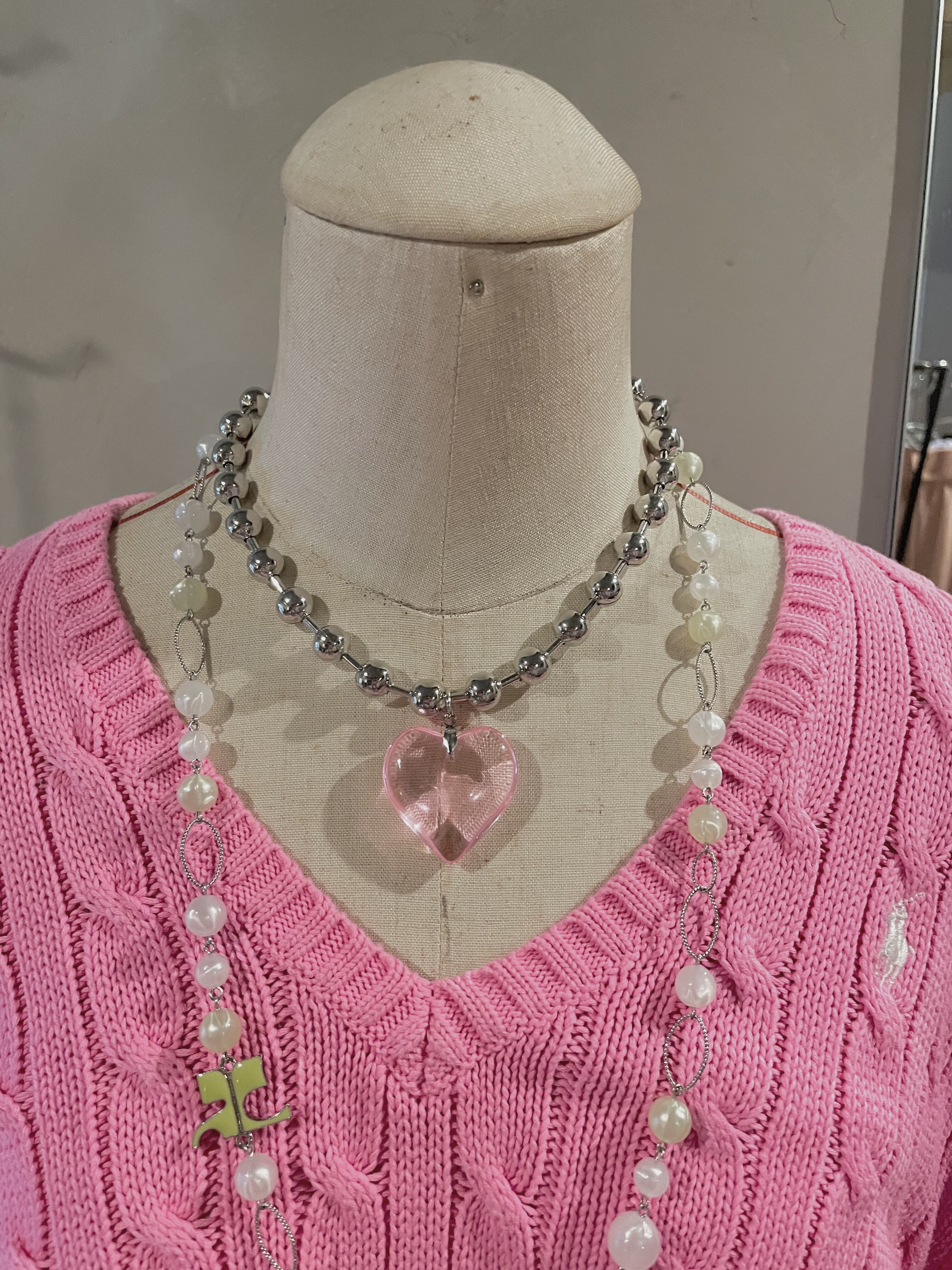 silver chain clear pink heart necklace