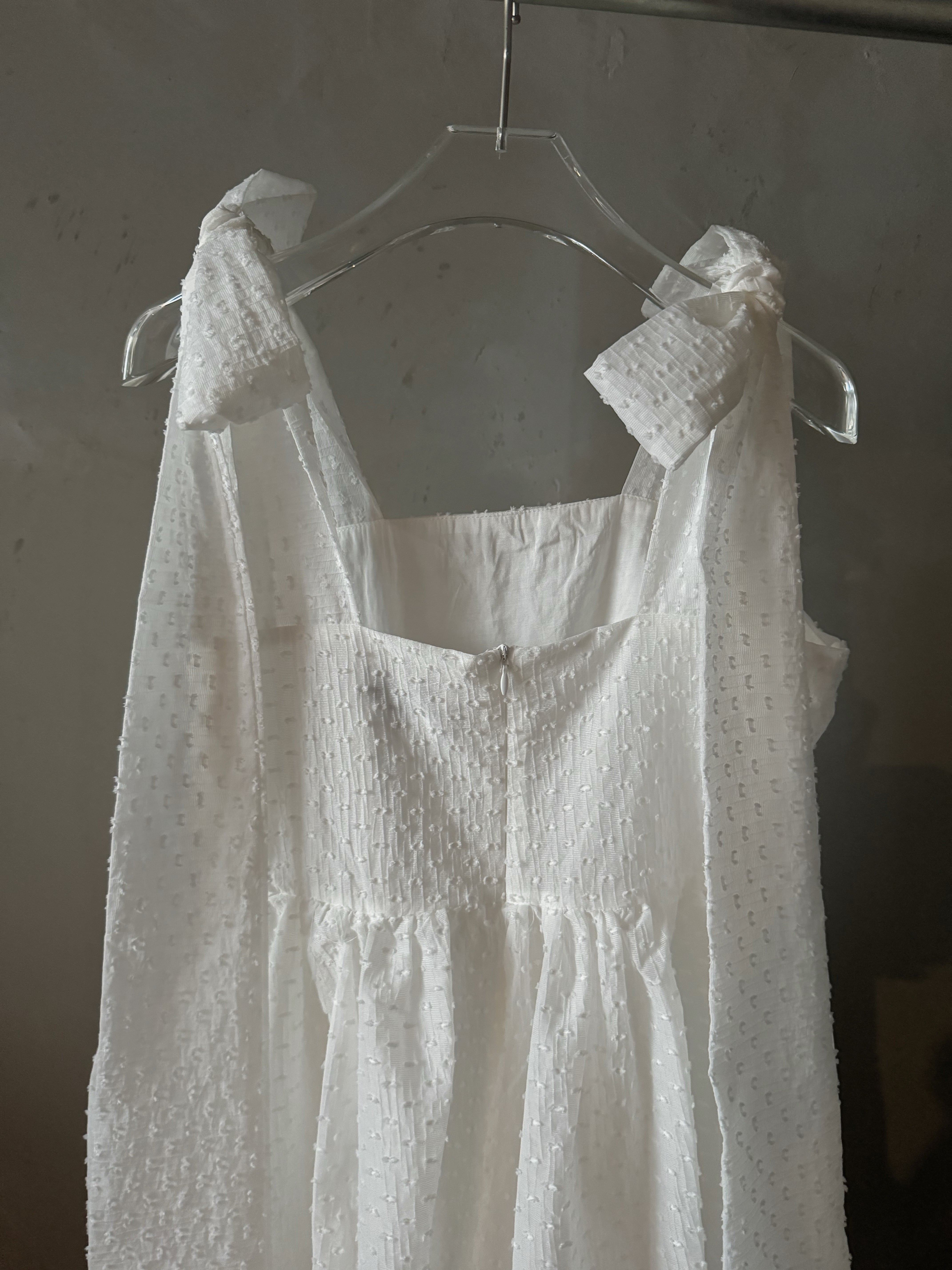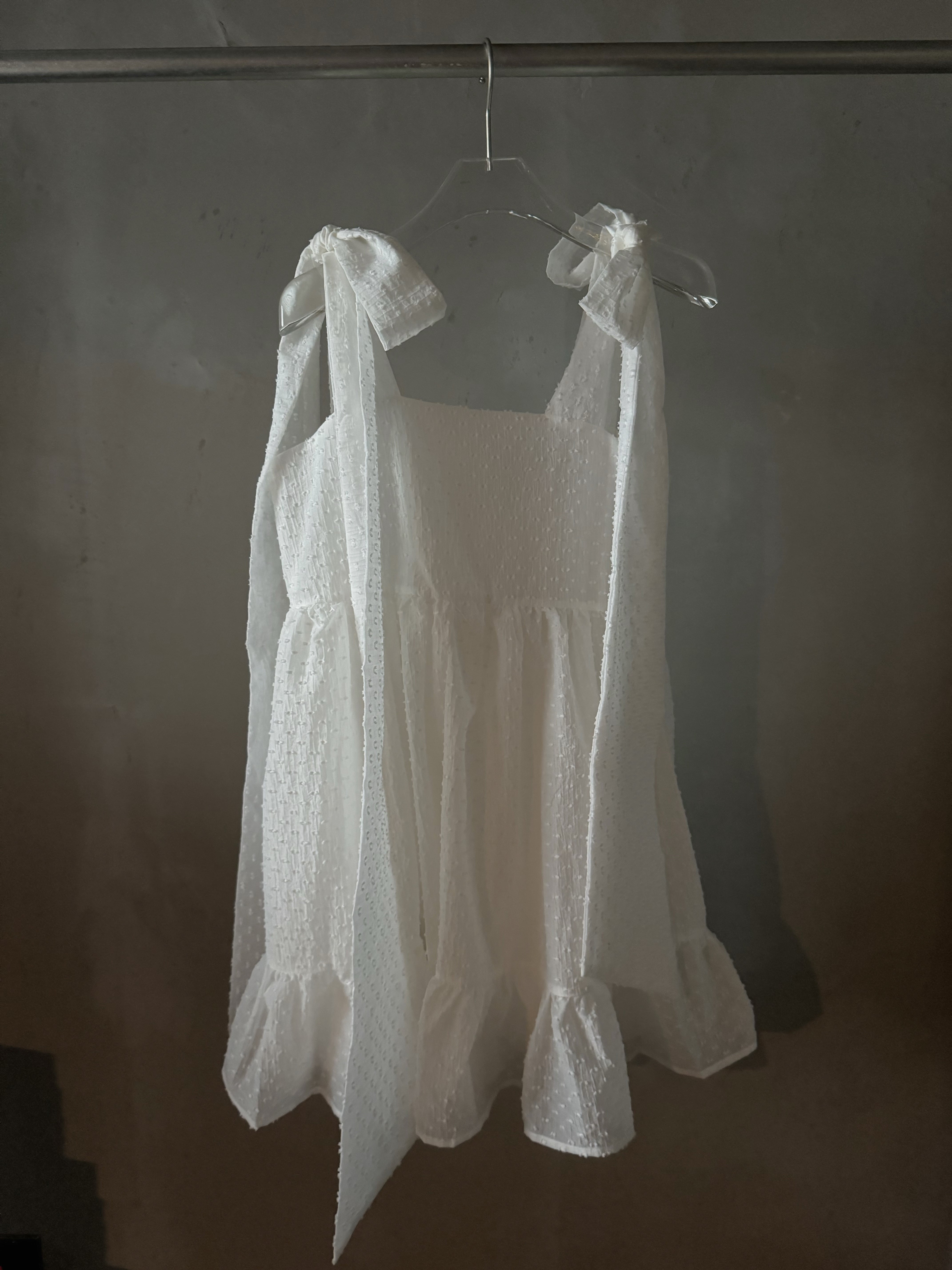 このルーズフィットのミニドレスは、完璧なフィットのための調節可能な肩紐が特徴です。最大の特徴は大きなリボン。