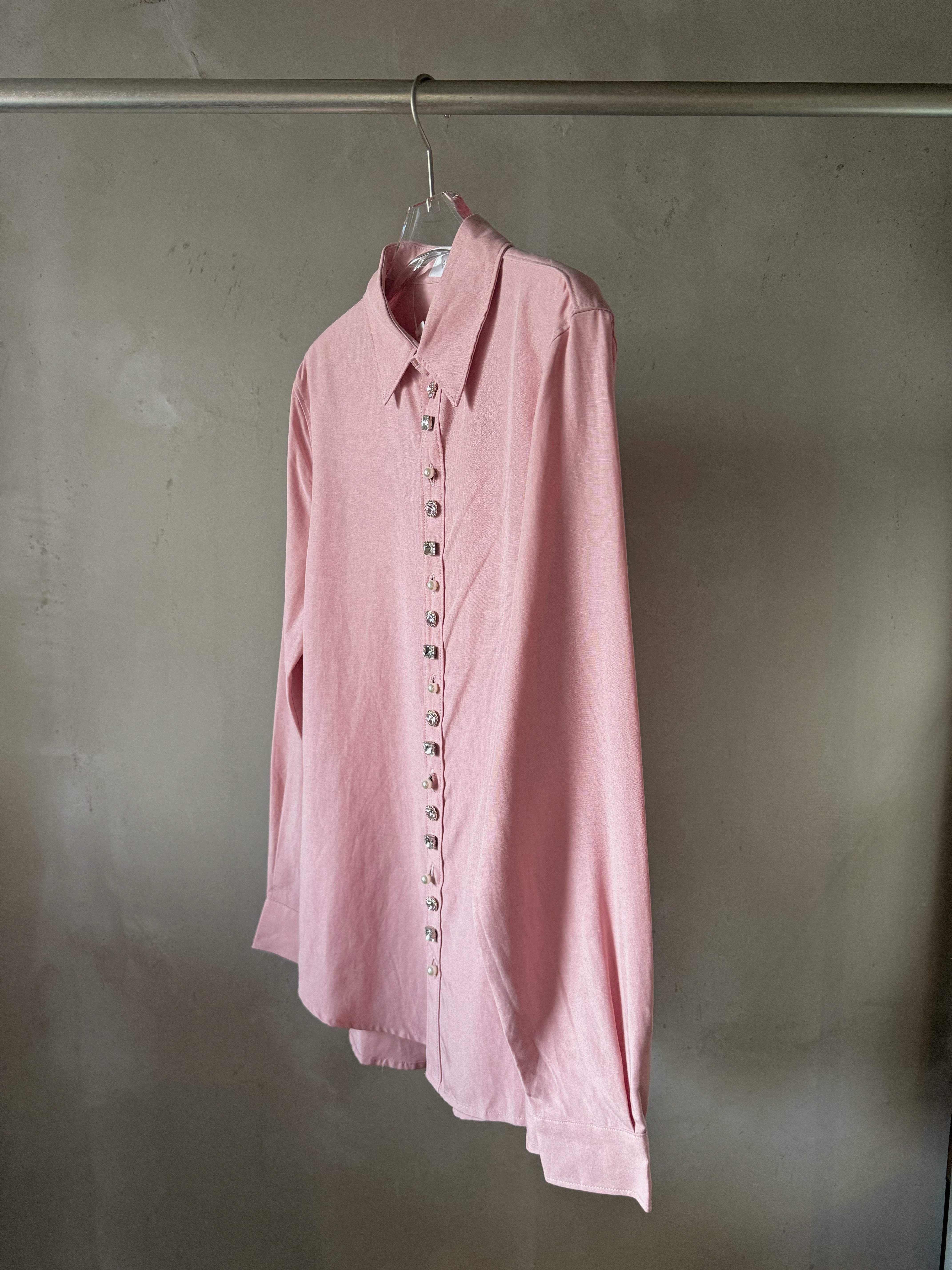 ソフトなウーブン素材のレギュラーフィットシャツ。前立てに装飾的なミックスジェムのトリミングが施され、パールボタンで開閉します。サイズにより、胸囲は52.5~65cmです。