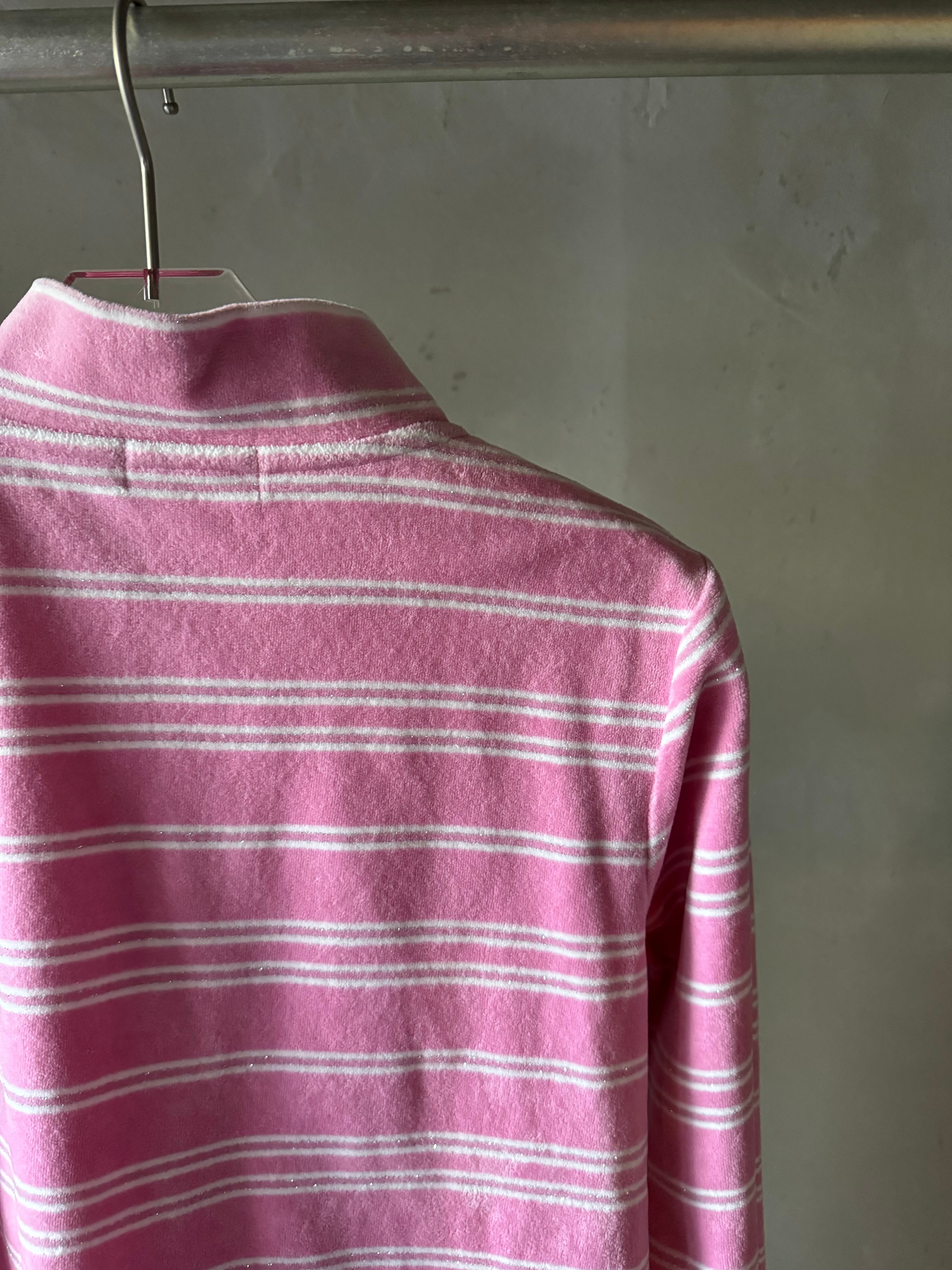 キラキラシルバーのボーダーとピンクのベロア、ロゴがとても可愛いジッパートップスです♪