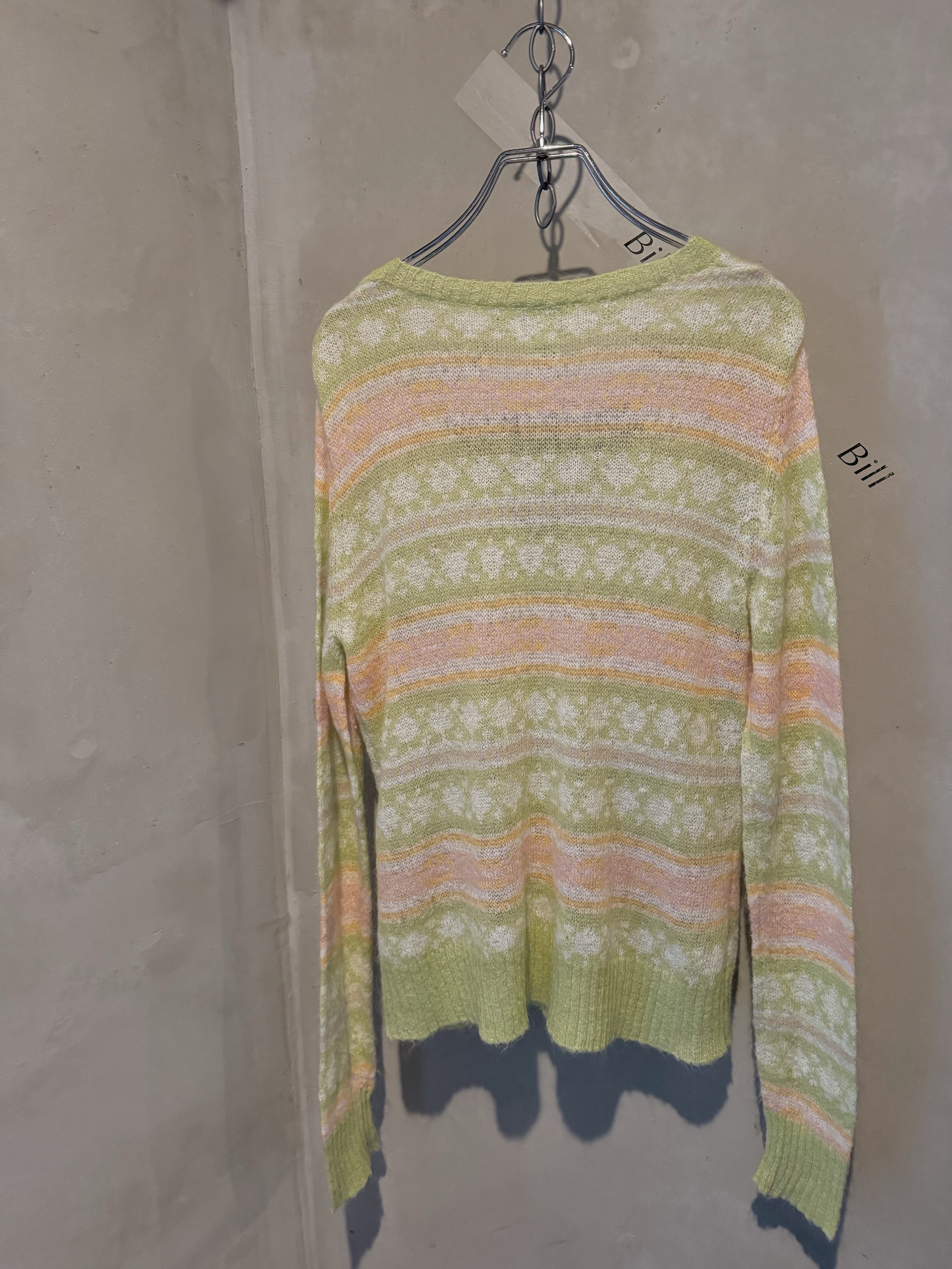 柔らかいグリーンとオレンジの色味がとても可愛いモヘアカーディガンです。